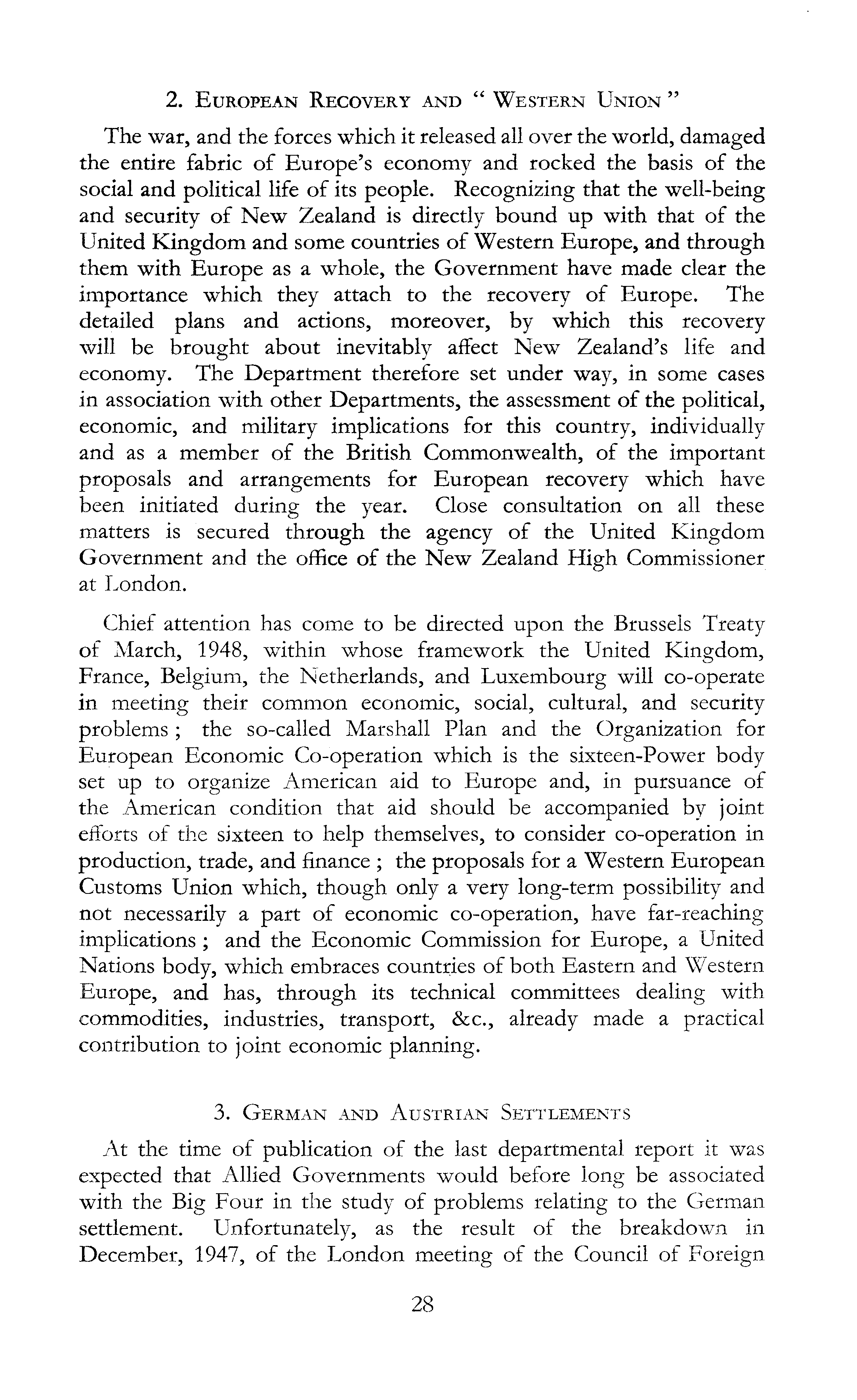 2. European Recovery and " Western Union " The war, and the forces which it released all over the world, damaged the entire fabric of Europe's economy and rocked the basis of the social and political life of its people. Recognizing that the well-being and security of New Zealand is directly bound up with that of the United Kingdom and some countries of Western Europe, and through them with Europe as a whole, the Government have made clear the importance which they attach to the recovery of Europe. The detailed plans and actions, moreover, by which this recovery will be brought about inevitably affect New Zealand's life and economy. The Department therefore set under way, in some cases in association with other Departments, the assessment of the political, economic, and military implications for this country, individually and as a member of the British Commonwealth, of the important proposals and arrangements for European recovery which have been initiated during the year. Close consultation on all these matters is secured through the agency of the United Kingdom Government and the office of the New Zealand High Commissioner at London. Chief attention has come to be directed upon the Brussels Treaty of March, 1948, within whose framework the United Kingdom, France, Belgium, the Netherlands, and Luxembourg will co-operate in meeting their common economic, social, cultural, and security problems; the so-called Marshall Plan and the Organization for European Economic Co-operation which is the sixteen-Power body set up to organize American aid to Europe and, in pursuance of the American condition that aid should be accompanied by joint efforts of the sixteen to help themselves, to consider co-operation in production, trade, and finance ; the proposals for a Western European Customs Union which, though only a very long-term possibility and not necessarily a part of economic co-operation, have far-reaching implications ; and the Economic Commission for Europe, a United Nations body, which embraces countries of both Eastern and Western Europe, and has, through its technical committees dealing with commodities, industries, transport, &c., already made a practical contribution to joint economic planning. 3. German and Austrian Settlements At the time of publication of the last departmental report it was expected that Allied Governments would before long be associated with the Big Four in the study of problems relating to the German settlement. Unfortunately, as the result of the breakdown in December, 1947, of the London meeting of the Council of Foreign
