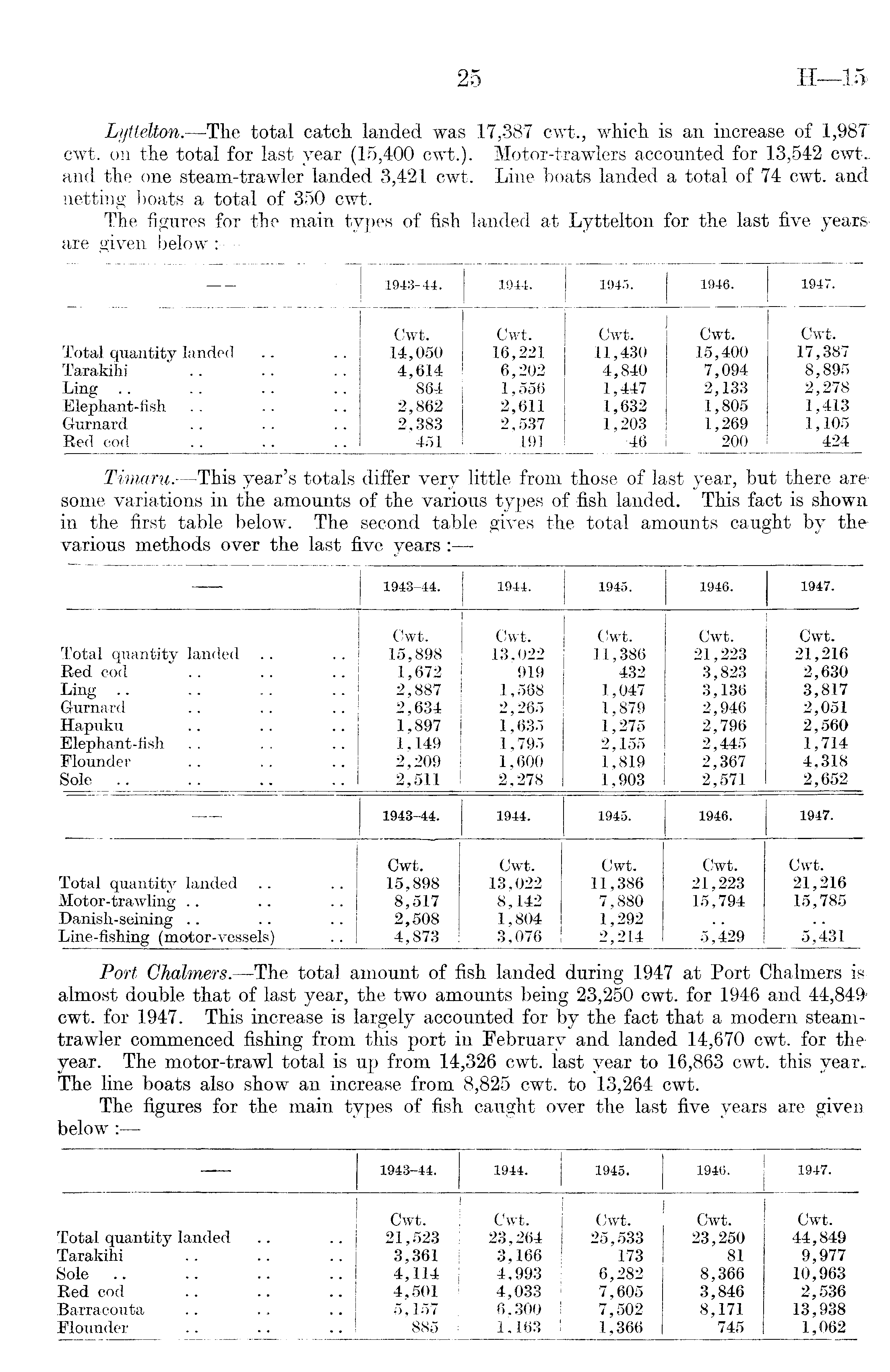 Lyttelton.—The total catch landed was 17,387 cwt., which is an increase of 1,987 cwt. 011 the total for last year (15,400 cwt.). Motor-trawlers accounted for 13,542 cwt.. and the one steam-trawler landed 3,421 cwt. Line boats landed a total of 74 cwt. and netting boats a total of 350 cwt. The figures for the main types of fish landed at Lyttelton for the last five years are given below :
