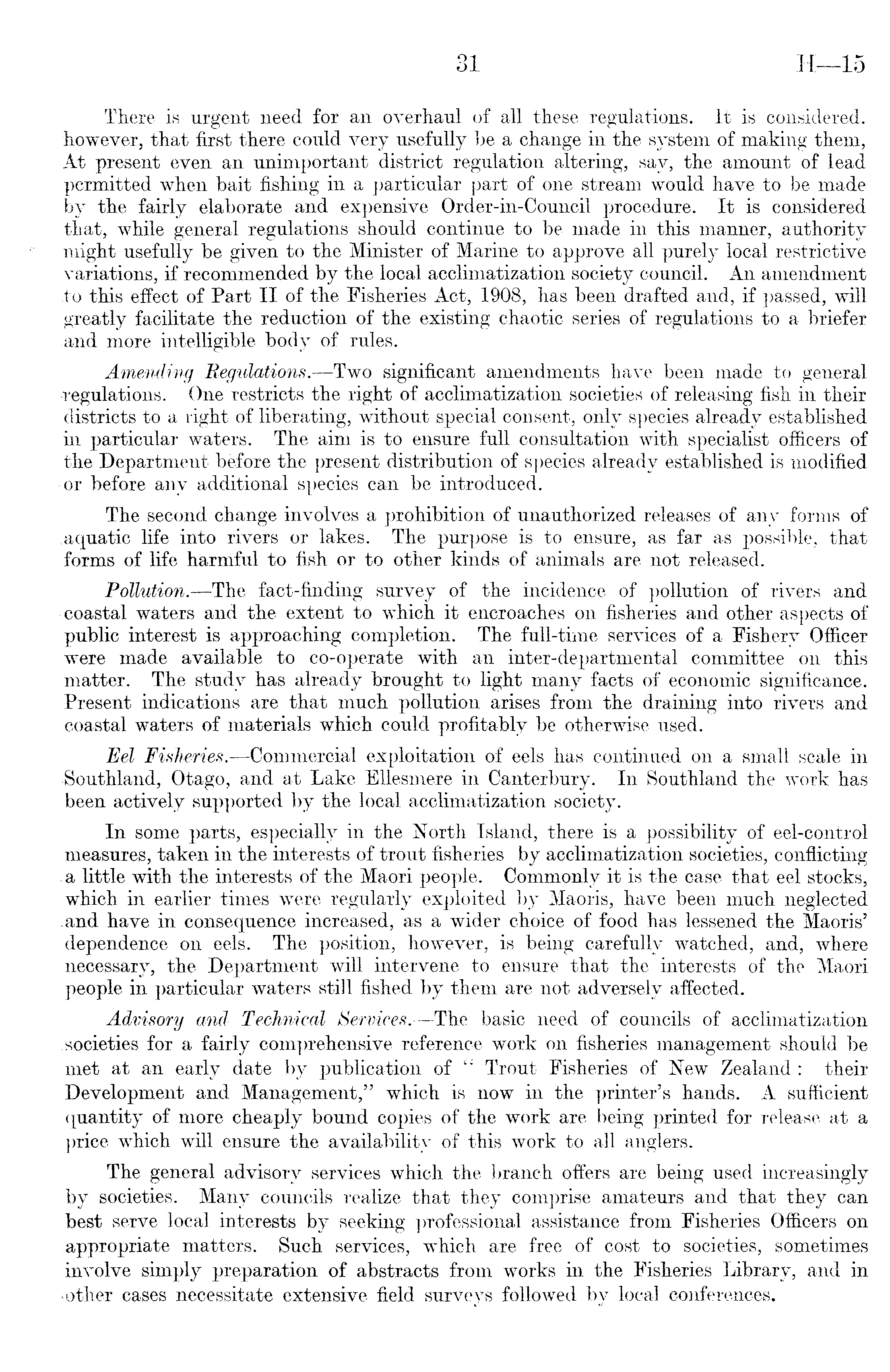 There is urgent need for an overhaul of all these regulations. It is considered, however, that first there could very usefully be a change in the system of making them, At present even an unimportant district regulation altering, say, the amount of lead permitted when bait fishing in a particular part of one stream would have to be made by the fairly elaborate and expensive Order-in-Council procedure. It is considered that, while general regulations should continue to be made in this manner, authority might usefully be given to the Minister of Marine to approve all purely local restrictive variations, if recommended by the local acclimatization society council. An amendment to this effect of Part II of the Fisheries Act, 1908, has been drafted and, if passed, will greatly facilitate the reduction of the existing chaotic series of regulations to a briefer .and more intelligible body of rules. Amending Regulations.—Two significant amendments have been made to general •regulations. One restricts the right of acclimatization societies of releasing fish in their districts to a right of liberating, without special consent, only species already established in particular waters. The aim is to ensure full consultation with specialist officers of the Department before the present distribution of species already established is modified or before any additional species can be introduced. The second change involves a prohibition of unauthorized releases of any forms of aquatic life into rivers or lakes. The purpose is to ensure, as far as possible, that forms of life harmful to fish or to other kinds of animals are not released. Pollution.—The fact-finding survey of the incidence of pollution of rivers and coastal waters and the extent to which it encroaches on fisheries and other aspects of public interest is approaching completion. The full-time services of a Fishery Officer were made available to co-operate with an inter-departmental committee on this matter. The study has already brought to light many facts of economic significance. Present indications are that much pollution arises from the draining into rivers and coastal waters of materials which could profitably be otherwise used. Eel Fisheries.—Commercial exploitation of eels has continued on a small scale in .Southland, Otago, and at Lake Ellesmere in Canterbury. In Southland the work has been actively supported by the local acclimatization society. In some parts, especially in the North Island, there is a possibility of eel-control measures, taken in the interests of trout fisheries by acclimatization societies, conflicting a little with the interests of the Maori people. Commonly it is the case that eel stocks, which in earlier times were regularly exploited by Maoris, have been much neglected .and have in consequence increased, as a wider choice of food has lessened the Maoris' dependence on eels. The position, however, is being carefully watched, and, where necessary, the Department will intervene to ensure that the interests of the Maori people in particular waters still fished by them are not adversely affected. Advisory and Technical Services. —The basic need of councils of acclimatization societies for a fairly comprehensive reference work on fisheries management should be met at an early date by publication of " Trout Fisheries of New Zealand : their Development and Management," which is now in the printer's hands. A sufficient quantity of more cheaply bound copies of the work are being printed for release at a price which will ensure the availability of this work to all anglers. The general advisory services which the branch offers are being used increasingly by societies. Many councils realize that they comprise amateurs and that they can best serve local interests by seeking professional assistance from Fisheries Officers on appropriate matters. Such services, which are free of cost to societies, sometimes involve simply preparation of abstracts from works in the Fisheries Library, and in •other cases necessitate extensive field surveys followed by local conferences.