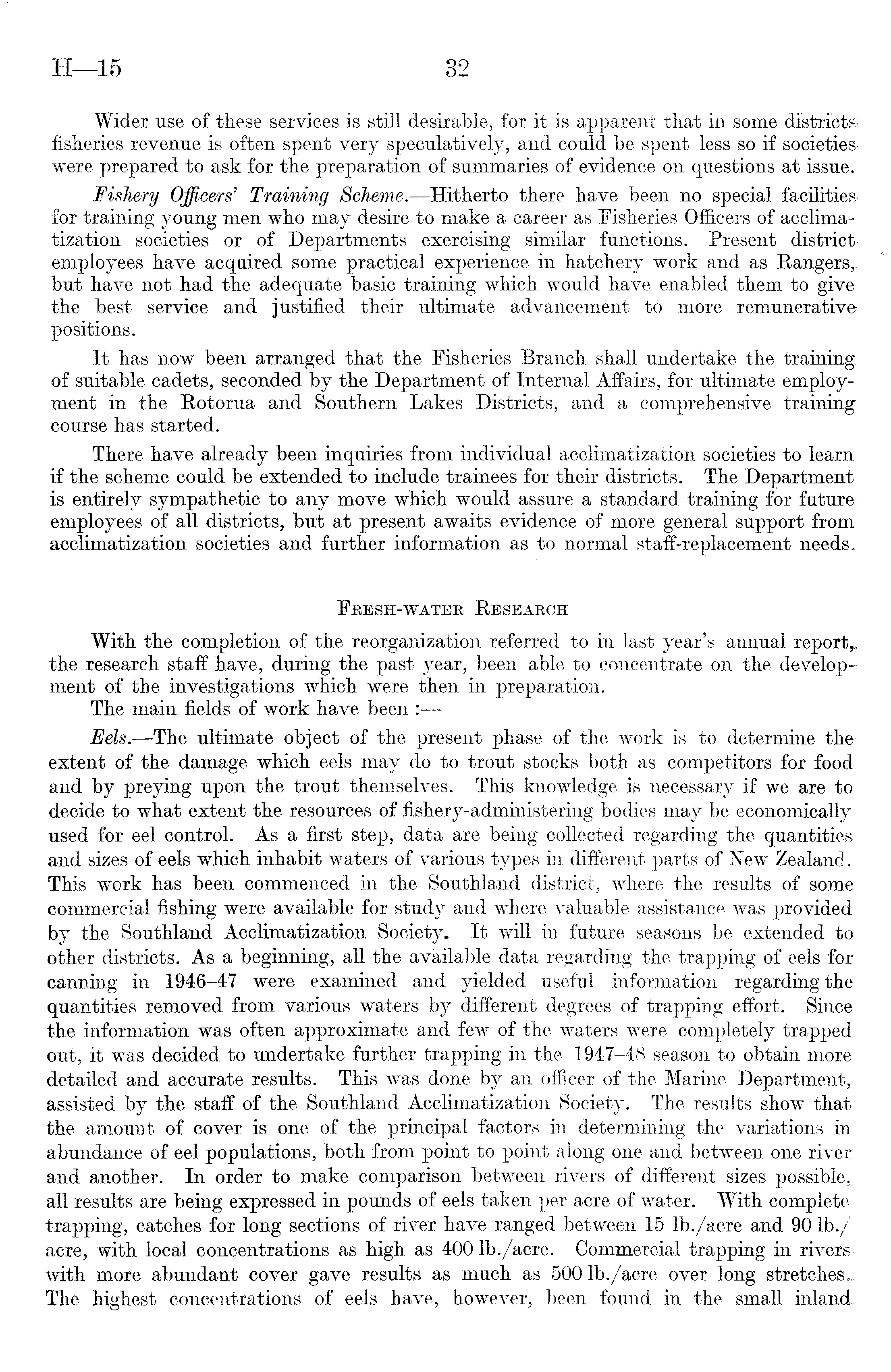Wider use of these services is still desirable, for it is apparent that in some districtsfisheries revenue is often spent very speculatively, and could be spent less so if societies, were prepared to ask for the preparation of summaries of evidence on questions at issue. Fishery Officers' Training Scheme. —Hitherto there have been no special facilitiesfor training young men who may desire to make a career as Fisheries Officers of acclimatization societies or of Departments exercising similar functions. Present district employees have acquired some practical experience in hatchery work and as Rangers,, but have not had the adequate basic training which would have enabled them to give the best service and justified their ultimate advancement to more remunerative positions. It has now- been arranged that the Fisheries Branch shall undertake the training, of suitable cadets, seconded by the Department of Internal Affairs, for ultimate employment in the Rotorua and Southern Lakes Districts, and a comprehensive training course has started. There have already been inquiries from individual acclimatization societies to learn if the scheme could be extended to include trainees for their districts. The Department is entirely sympathetic to any move which would assure a standard training for futureemployees of all districts, but at present awaits evidence of more general support from acclimatization societies and further information as to normal staff-replacement needs _ Fresh-water Research With the completion of the reorganization referred to in last year's annual report,,, the research staff have, during the past year, been able to concentrate on the development of the investigations which were then in preparation. The main fields of work have been : Eels.—The ultimate object of the present phase of the work is to determine the extent of the damage which eels may do to trout stocks both as competitors for food and by preying upon the trout themselves. This knowledge is necessary if we are to decide to what extent the resources of fishery-administering bodies may be economically used for eel control. As a first step, data are being collected regarding the quantities, and sizes of eels which inhabit waters of various types in different parts of New Zealand. This work has been commenced in the Southland district, where the results of some commercial fishing were available for study and where valuable assistance was provided by the Southland Acclimatization Society. It will in future seasons be extended toother districts. As a beginning, all the available data regarding the trapping of eels for canning in 1946-47 were examined and yielded useful information regarding the quantities removed from various waters by different degrees of trapping effort. Since the information was often approximate and few of the waters were completely trapped out, it was decided to undertake further trapping in the 1947-48 season to obtain more detailed and accurate results. This was done by an officer of the Marine Department, assisted by the staff of the Southland Acclimatization Society. The results show that the amount of cover is one of the principal factors in determining the variations in abundance of eel populations, both from point to point along one and between one river and another. In order to make comparison between rivers of different sizes possible, all results are being expressed in pounds of eels taken per acre of water. With complete trapping, catches for long sections of river have ranged between 15 lb./acre and 901b./" acre, with local concentrations as high as 400 lb./acre. Commercial trapping in rivers with more abundant cover gave results as much as 500 lb./acre over long stretches.. The highest concentrations of eels have, however, been found in the small inland.