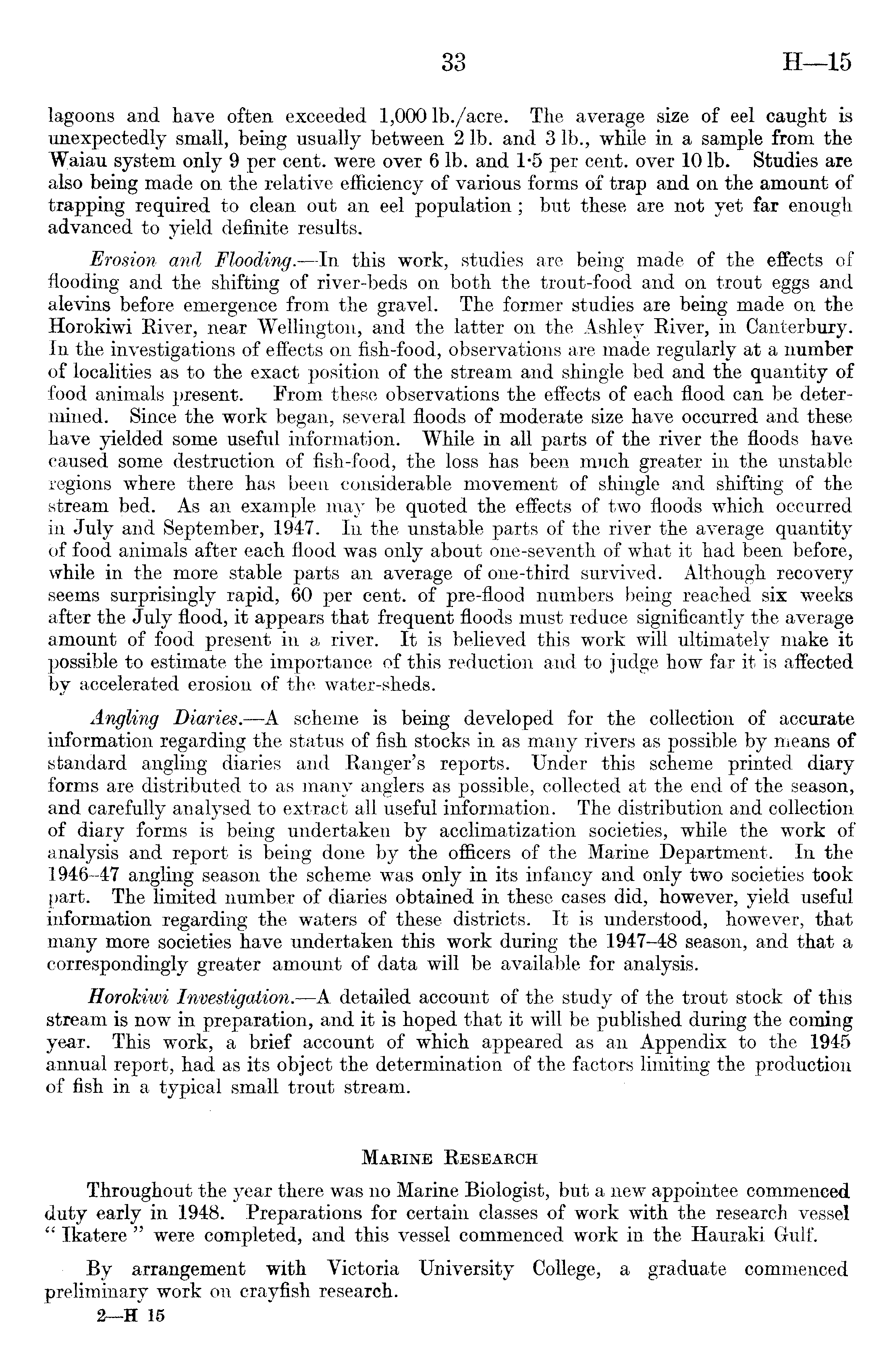 lagoons and have often exceeded 1,000 lb./acre. The average size of eel caught is unexpectedly small, being usually between 2 lb. and 3 lb., while in a sample from the Waiau system only 9 per cent, were over 6 lb. and I*s per cent, over 10 lb. Studies are also being made on. the relative efficiency of various forms of trap and on the amount of trapping required to clean out an eel population; but these are not yet far enough advanced to yield definite results. Erosion and Flooding.—ln this work, studies are being made of the effects of flooding and the shifting of river-beds on both the trout-food and on trout eggs and alevins before emergence from the gravel. The former studies are being made on the Horokiwi River, near Wellington, and the latter on the Ashley River, in Canterbury. In the investigations of effects on fish-food, observations are made regularly at a number of localities as to the exact position of the stream and shingle bed and the quantity of food animals present. From these observations the effects of each flood can be determined. Since the work began, several floods of moderate size have occurred and these have yielded some useful information. While in all parts of the river the floods have caused some destruction of fish-food, the loss has been much greater in the unstable regions where there has been considerable movement of shingle and shifting of the stream bed. As an example may be quoted the effects of two floods which occurred in July and September, 1947. In the unstable parts of the river the average quantity of food animals after each flood was only about one-seventh of what it had been before, while in the more stable parts an average of one-third survived. Although recovery seems surprisingly rapid, 60 per cent, of pre-flood numbers being reached six weeks after the July flood, it appears that frequent floods must reduce significantly the average amount of food present in a river. It is believed this work will ultimately make it possible to estimate the importance of this reduction and to judge how far it is affected by accelerated erosion of the water-sheds. Angling Diaries.—A scheme is being developed for the collection of accurate information regarding the status of fish stocks in as many rivers as possible by means of standard angling diaries and Ranger's reports. Under this scheme printed diary forms are distributed to as many anglers as possible, collected at the end of the season, and carefully analysed to extract all useful information. The distribution and collection of diary forms is being undertaken by acclimatization societies, while the work of analysis and report is being done by the officers of the Marine Department. In the 1946-47 angling season the scheme was only in its infancy and only two societies took part. The limited number of diaries obtained in these cases did, however, yield useful information regarding the waters of these districts. It is understood, however, that many more societies have undertaken this work during the 1947-48 season, and that a correspondingly greater amount of data will be available for analysis. Horokiwi Investigation.—A detailed account of the study of the trout stock of this stream is now in preparation, and it is hoped that it will be published during the coining year. This work, a brief account of which appeared as an Appendix to the 1945 annual report, had as its object the determination of the factors limiting the production of fish in a typical small trout stream. Marine Research Throughout the year there was no Marine Biologist, but a new appointee commenced duty early in 1948. Preparations for certain classes of work with the research vessel " Ikatere " were completed, and this vessel commenced work in the Hauraki Gulf. By arrangement with Victoria University College, a graduate commenced preliminary work on crayfish research. 2—H 15