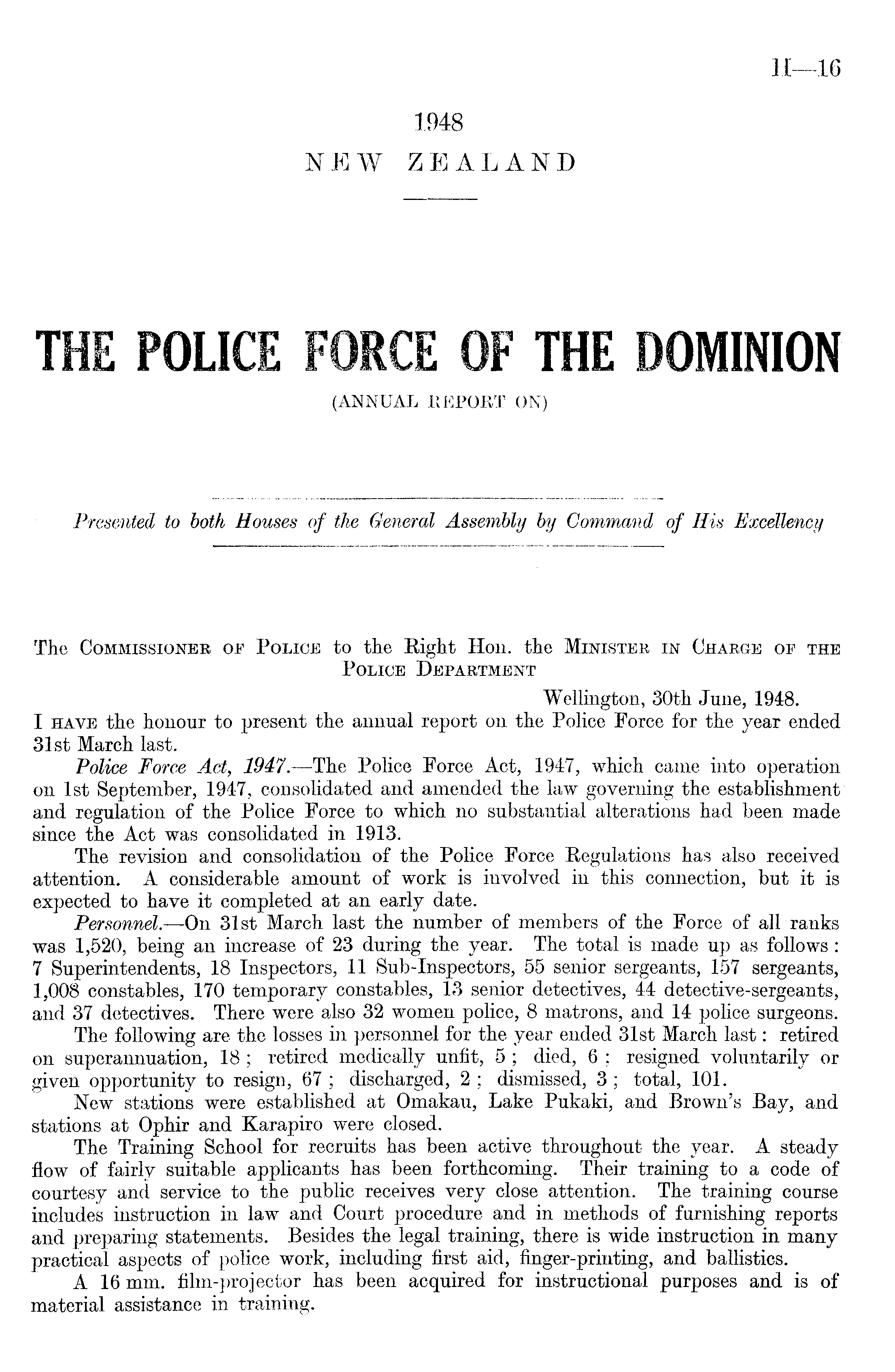 The Commissioner of Police to the Right Hon. the Minister in Charge of the Police Department Wellington, 30th June, 1948. I have the honour to present the annual report on the Police Force for the year ended 31st March last. Police Force Act, 1947.—The Police Force Act, 1947, which came into operation on Ist September, 1947, consolidated and amended the law governing the establishment and regulation of the Police Force to which no substantial alterations had been made since the Act was consolidated in 1913. The revision and consolidation of the Police Force Regulations has also received attention. A considerable amount of work is involved in this connection, but it is expected to have it completed at an early date. Personnel. —On 31st March last the number of members of the Force of all ranks was 1,520, being an increase of 23 during the year. The total is made up as follows: 7 Superintendents, 18 Inspectors, 11 Sub-Inspectors, 55 senior sergeants, 157 sergeants, 1,008 constables, 170 temporary constables, 13 senior detectives, 44 detective-sergeants, and 37 detectives. There were also 32 women police, 8 matrons, and 14 police surgeons. The following are the losses in personnel for the year ended 31st March last: retired on superannuation, 18 ; retired medically unfit, 5 ; died, 6 : resigned voluntarily or given opportunity to resign, 67 ; discharged, 2 ; dismissed, 3 ; total, 101. New stations were established at Omakau, Lake Pukaki, and Brown's Bay, and stations at Ophir and Karapiro were closed. Tlie Training School for recruits has been active throughout the year. A steady flow of fairly suitable applicants has been forthcoming. Their training to a code of courtesy and service to the public receives very close attention. The training course includes instruction in law and Court procedure and in methods of furnishing reports and preparing statements. Besides the legal training, there is wide instruction in many practical aspects of police work, including first aid, finger-printing, and ballistics. A 16 mm. film-projector has been acquired for instructional purposes and is of material assistance in training.
