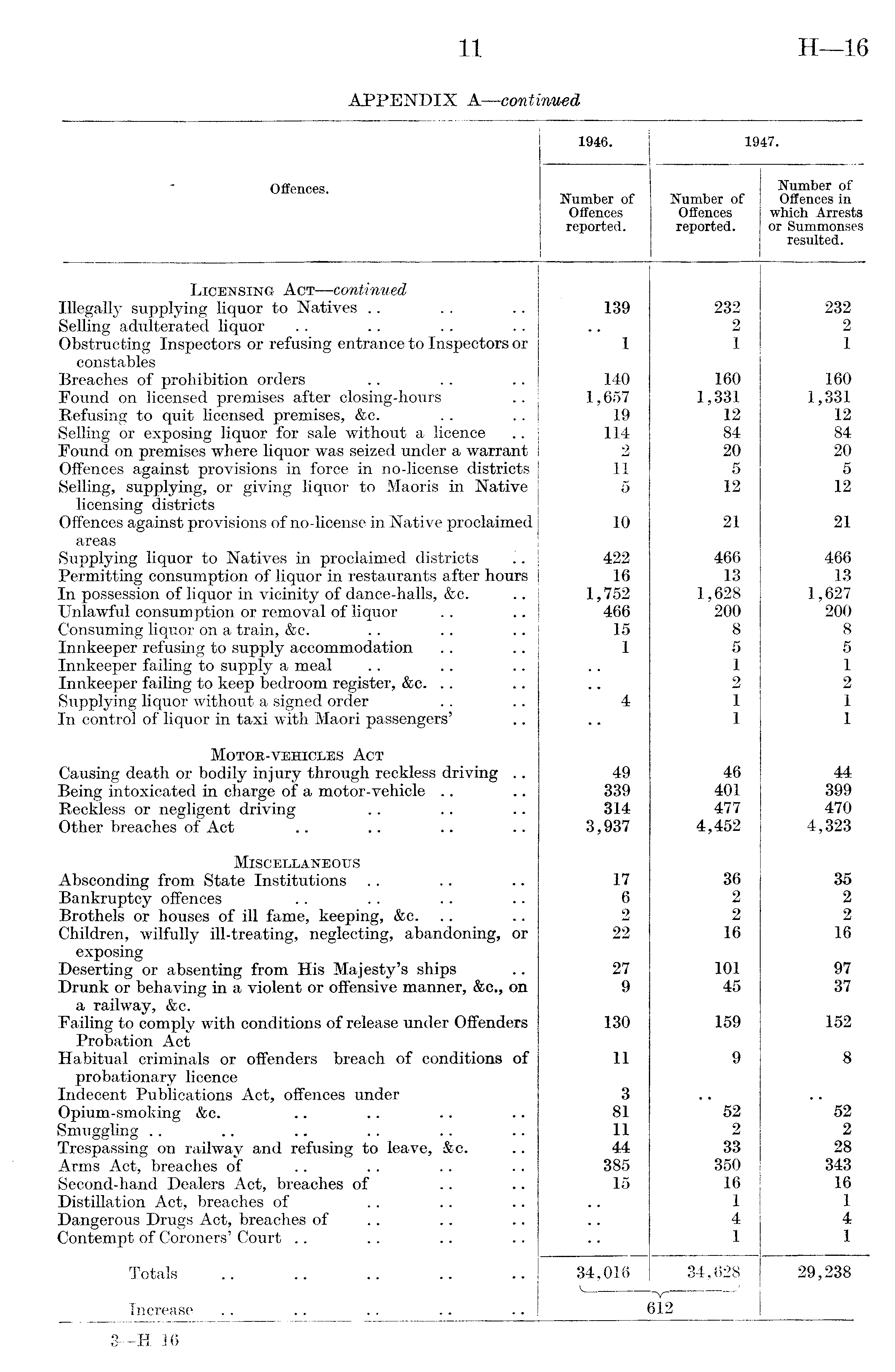 1946. 1947. Offences. Number of Number of Number of Offences in Offences Offences which Arrests reported. reported. or Summonses resulted. Licensing Act—continued Illegally supplying liquor to Natives 139 232 232 Selling adulterated liquor 2 2 Obstructing Inspectors or refusing entrance to Inspectors or 1 1 1 constables Breaches of prohibition orders 140 160 160 Found on licensed premises after closing-hours 1,657 1,331 1,331 Refusing to quit licensed premises, &c. 19 12 12 Selling or exposing liquor for sale without a licence 114 84 84 Found on premises where liquor was seized under a warrant 2 20 20 Offences against provisions in force in no-license districts 11 5 5 Selling, supplying, or giving liquor to Maoris in Native 5 12 12 licensing districts Offences against provisions of no-license in Native proclaimed 10 21 21 areas Supplying liquor to Natives in proclaimed districts 422 466 466 Permitting consumption of liquor in restaurants after hours 16 13 13 In possession of liquor in vicinity of dance-halls, &c. 1,752 1,628 1,627 Unlawful consumption or removal of liquor .. 466 200 200 Consuming liquor on a train, &c. 15 8 8 Innkeeper refusing to supply accommodation 1 5 5 Innkeeper failing to supply a meal 1 1 Innkeeper failing to keep bedroom register, &c. 2 2 Supplying liquor without a signed order 4 1 1 In control of liquor in taxi with Maori passengers' 1 1 Motok-vehicles Act Causing death or bodily injury through reckless driving .. 49 46 44 Being intoxicated in charge of a motor-vehicle 339 401 399 Reckless or negligent driving 314 477 470 Other breaches of Act 3,937 4,452 4,323 Miscellaneous Absconding from State Institutions 17 36 35 Bankruptcy offences 6 2 2 Brothels or houses of ill fame, keeping, &c. 2 2 2 Children, wilfully ill-treating, neglecting, abandoning, or OVT\AC!Tn Cf 22 16 16 CAUUoiliy Deserting or absenting from His Majesty's ships 27 101 97 Drunk or behaving in a violent or offensive manner, &c., on 9 45 37 a railway, &c. Failing to comply with conditions of release under Offenders 130 159 152 Probation Act Habitual criminals or offenders breach of conditions of 11 9 8 probationary licence Indecent Publications Act, offences under 3 Opium-smoking &c. 81 " 52 52 Smuggling .. 11 2 2 Trespassing on railway and refusing to leave, &c. 44 33 28 Arms Act, breaches of 385 350 343 Second-hand Dealers Act, breaches of 15 16 16 Distillation Act, breaches of 1 1 Dangerous Drugs Act, breaches of 4 4 Contempt of Coroners' Court 1 1 Totals 34,016 V 34,628 29,238 Increase 612