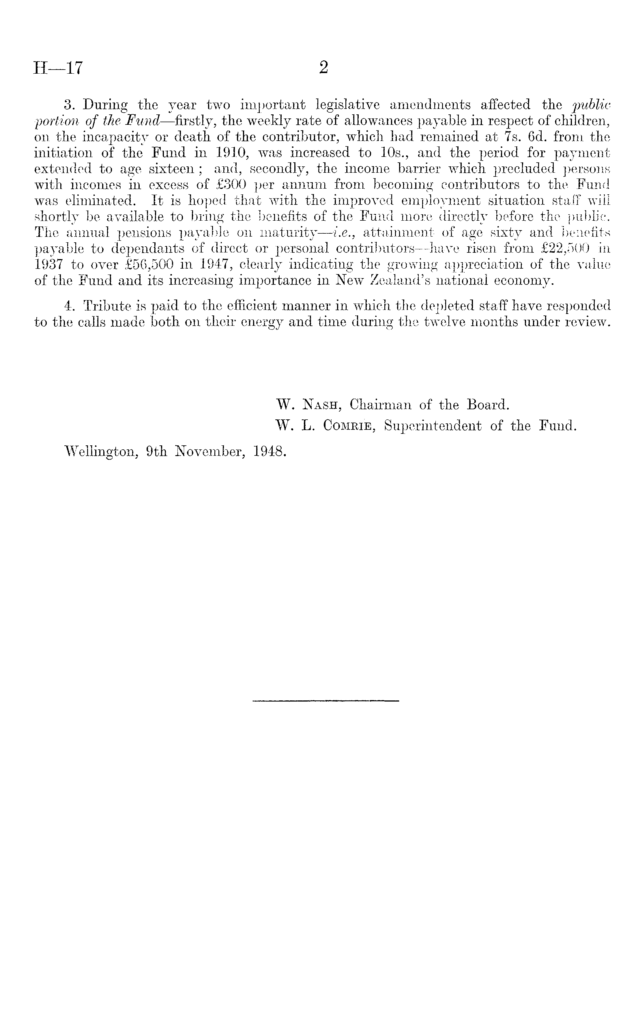 3. During the year two important legislative amendments affected tlie public portion of the Fund—firstly, tlie weekly rate of allowances payable in respect of children, on the incapacity or death of the contributor, which had remained at 7s. 6d. from the initiation of the Fund in 1910, was increased to 10s., and the period for payment extended to age sixteen; and, secondly, the income barrier which precluded persons with incomes in excess of £3OO per annum from becoming contributors to the Fund was eliminated. It is hoped that with the improved employment situation staff will shortly be available to bring the benefits of the Fund more directly before the public. The annual pensions payable on maturity —i.e., attainment of age sixty and benefits payable to dependants of direct or personal contributors —have risen from £22,500 in 1937 to over £56,500 in 1947, clearly indicating the growing appreciation of the value of the Fund and its increasing importance in New Zealand's national economy. 4. Tribute is paid to the efficient manner in which the depleted staff have responded to the calls made both on their energy and time during the twelve months under review. W. Nash, Chairman of the Board. W. L. Comrie, Superintendent of the Fund. Wellington, 9th November, 1948.