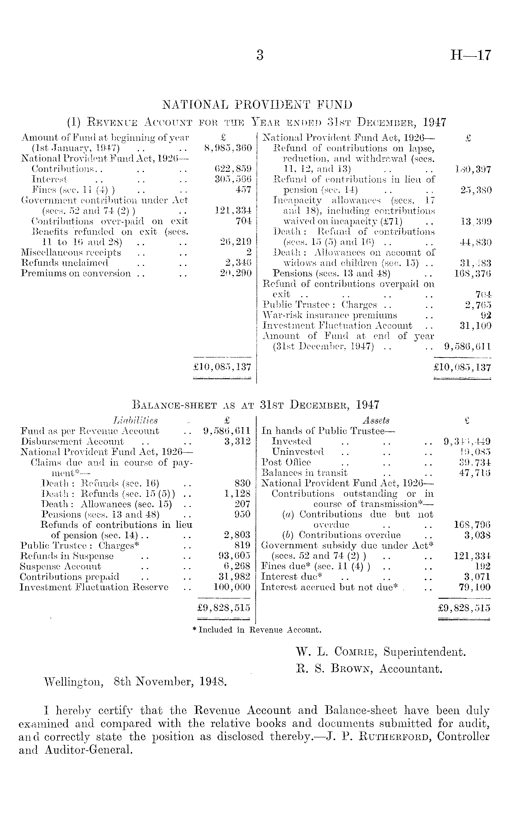 NATIONAL PROVIDENT FUND (1) Revenue Account for the Year ended 31st December, 1947 Amount of Fund at beginning of year £ National Provident Fund Act, 1926 £ (Ist January, 1947) .. .. 8,985,360 Refund of contributions on lapse, National Provident Fund Act, 1926 reduction, and withdrawal (sees. Contributions.. .. .. 622,859 11, 12, and 13) .. .. 180,397 Interest .. .. .. 305,566 Refund of contributions in lieu of Fines (sec. 11 (4) ) .. . . 457 pension (sec. 14) .. .. 25,380 Government contribution under Act Incapacity allowances (sees. 17 (sees. 52 and 74 (2)) .. 121,334 and 18), including contributions Contributions over-paid on exit 704 waived on incapacity (£7l) .. 13,399 Benefits refunded on exit (sees. Death: Refund of contributions 11 to 16 and 28) .. .. 26,219 (sees. 15 (5) and 16) .. .. 44,830 Miscellaneous receipts .. .. 2 Death: Allowances on account of Refunds unclaimed .. .. 2,346 widows and children (sec. 15) .. 31,483 Premiums on conversion .. .. 20,290 Pensions (sees. 13 and 48) .. 168,376 Refund of contributions overpaid on exit .. .. .. .. 704 Public Trustee : Charges .. .. 2,765 War-risk insurance premiums .. 92 Investment Fluctuation Account .. 31,100 Amount of Fund at end of year (31st December, 1947) .. .. 9,586,611 £10,085,137 £10,085,137 Balance-sheet as at 31st December, 1947 Liabilities . £ Assets £ Fund as per Revenue Account .. 9,586,611 In hands of Public Trustee— Disbursement Account .. .. 3,312 Invested .. .. .. 9,348,449 National Provident Fund Act, 1926 Uninvested .. .. .. 19,085 Claims due and in course of pay- Post Office .. .. .. 39,734 ment*— Balances in transit .. .. 47,716 Death : Refunds (sec. 16) .. 830 National Provident Fund Act, 1926 Death : Refunds (sec. 15 (5)) .. 1,128 Contributions outstanding or in Death: Allowances (sec. 15) .. 207 course of transmission*— Pensions (sees. 13 and 48) .. 950 (a) Contributions due but not Refunds of contributions in lieu overdue .. .. 168,796 of pension (sec. 14).. .. 2,803 (b) Contributions overdue .. 3,038 Public Trustee : Charges* .. 819 Government subsidy due under Act* Refunds in Suspense .. .. 93,605 (sees. 52 and 74 (2) ) .. .. 121,334 Suspense Account .. .. 6,268 Fines due* (sec. 11 (4) ) .. .. 192 Contributions prepaid .. .. 31,982 Interest due* .. .. .. 3,071 Investment Fluctuation Reserve .. 100,000 Interest accrued but not due* . .. 79,100 £9,828,515 £9,828,515 ♦lncluded in Revenue Account. W. L. Comrie, Superintendent. R. S. Brown, Accountant. Wellington, Bth November, 1948. I hereby certify that the Revenue Account and Balance-sheet have been duly examined and compared with the relative books and documents submitted for audit, and correctly state the position as disclosed thereby.—J. P. Rutherford, Controller and Auditor-General.