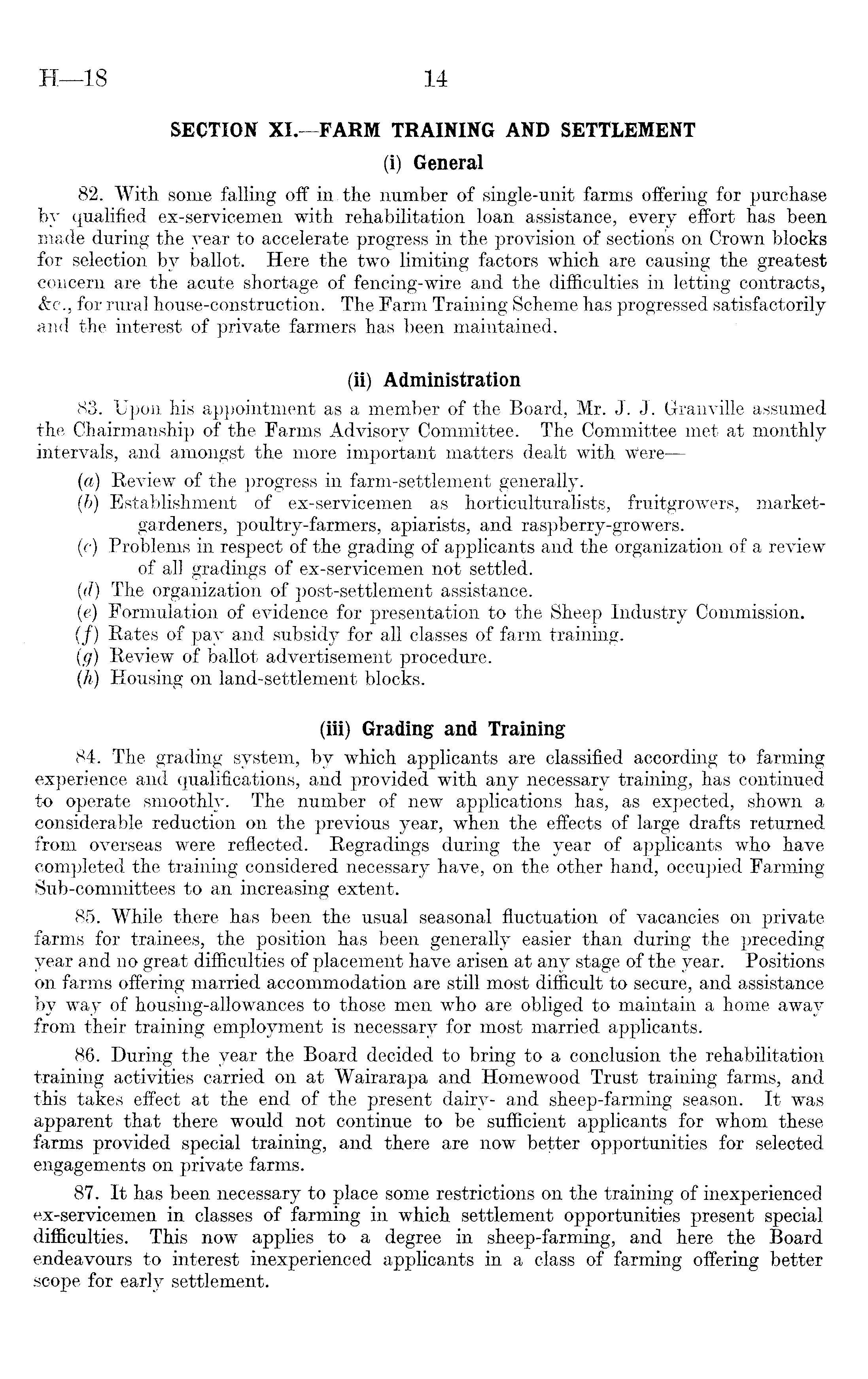 SECTION XI. —FARM TRAINING AND SETTLEMENT (i) General 82. With some falling off in . the number of single-unit farms offering for purchase by qualified ex-servicemen with rehabilitation loan assistance, every effort has been made during the year to accelerate progress in the provision of sections on Crown blocks for selection by ballot. Here the two limiting factors which are causing the greatest concern are the acute shortage of fencing-wire and the difficulties in letting contracts, &c., for rural house-construction. The Farm Training Scheme has progressed satisfactorily and the interest of private farmers has been maintained. (ii) Administration 83. Upon his appointment as a member of the Board, Mr. J. J. Granville assumed the Chairmanship of the Farms Advisory Committee. The Committee met at monthly intervals, and amongst the more important matters dealt with Were—(a) Review of the progress in farm-settlement generally. (b) Establishment of ex-servicemen as horticulturalists, fruitgrowers, marketgardeners, poultry-farmers, apiarists, and raspberry-growers. (c) Problems in respect of the grading of applicants and the organization of a review of all gradings of ex-servicemen not settled. (d) The organization of post-settlement assistance. (e) Formulation of evidence for presentation to the Sheep Industry Commission. (/) Rates of pay and subsidy for all classes of farm training. (g) Review of ballot advertisement procedure. (h) Housing on land-settlement blocks. (iii) Grading and Training 84. The grading system, by which applicants are classified according to farming experience and qualifications, and provided with any necessary training, has continued to operate smoothly. The number of new applications has, as expected, shown a considerable reduction on the previous year, when the effects of large drafts returned from overseas were reflected. Regradings during the year of applicants who have completed the training considered necessary have, on the other hand, occupied Farming Sub-committees to an increasing extent. 85. While there has been the usual seasonal fluctuation of vacancies on private farms for trainees, the position has been generally easier than during the preceding year and no great difficulties of placement have arisen at any stage of the year. Positions on farms offering married accommodation are still most difficult to secure, and assistance by way of housing-allowances to those men who are obliged to maintain a home away from their training employment is necessary for most married applicants. 86. During the year the Board decided to bring to a conclusion the rehabilitation training activities carried on at Wairarapa and Home wood Trust training farms, and this takes effect at the end of the present dairy- and sheep-farming season. It was apparent that there would not continue to be sufficient applicants for whom these farms provided special training, and there are now better opportunities for selected engagements on private farms. 87. It has been necessary to place some restrictions on the training of inexperienced ex-servicemen in classes of farming in which settlement opportunities present special difficulties. This now applies to a degree in sheep-farming, and here the Board endeavours to interest inexperienced applicants in a class of farming offering better scope for early settlement.