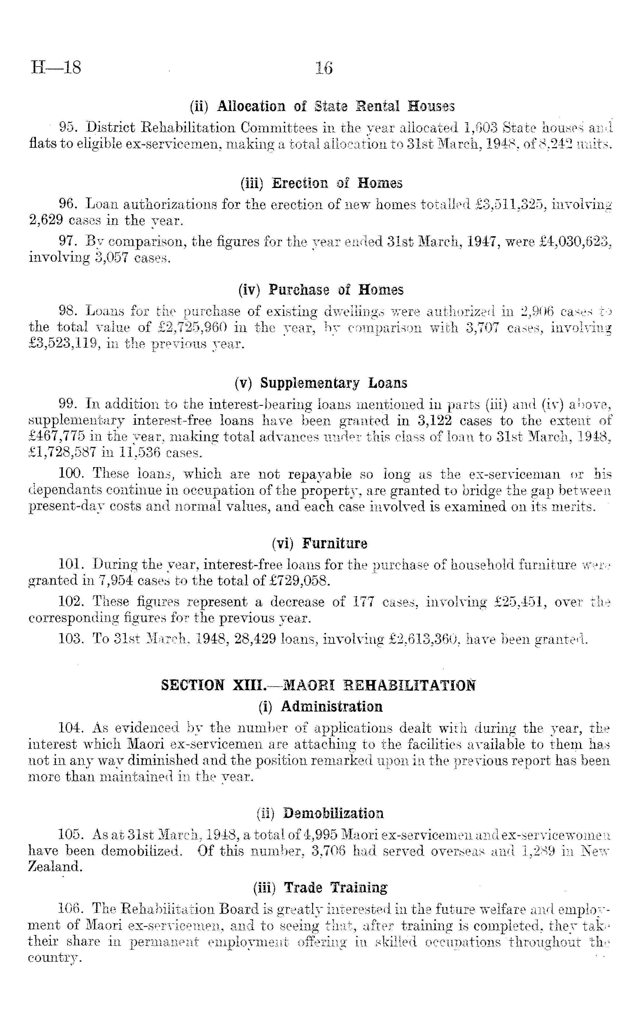 (ii) Allocation of State Mental Houses 95. District Rehabilitation Committees in the year allocated 1,603 State houses and flats to eligible ex-servicemen, making a total allocation to 31st March, 1948, of 8,242 units. (iii) Erection of Homes 96. Loan authorizations for the erection of new homes totalled £3,511,325, involving 2,629 cases in the year. 97. By comparison, the figures for the year ended 31st March, 1947, were £4,030,623, involving 3,057 cases. (iv) Purchase of Homes 98. Loans for the purchase of existing dwellings were authorized in 2,906 cases to the total value of £2,725,960 in the year, by comparison with 3,707 cases, involving £3,523,119, in the previous year. (v) Supplementary Loans 99. In addition to the interest-bearing loans mentioned in parts (iii) and (iv) above, supplementary interest-free loans have been granted in 3,122 cases to the extent of £467,775 in the vear, making total advances under this class of loan to 31st March, 1948, £1,728,587 in 11,536 cases. 100. These loans, which are not repayable so long as the ex-serviceman or his dependants continue in occupation of the property, are granted to bridge the gap between present-day costs and normal values, and each case involved is examined on its merits. (vi) Furniture 101. During the year, interest-free loans for the purchase of household furniture were granted in 7,954 cases to the total of £729,058. 102. These figures represent a decrease of 177 cases, involving £25,451, over the corresponding figures for the previous year. 103. To 31st March, 1948, 28,429 loans, involving £2,613,360, have been granted. SECTION XIII.—MAORI REHABILITATION (i) Administration 104. As evidenced by the number of applications dealt with during the year, the interest which Maori ex-servicemen are attaching to the facilities available to them has not in any way diminished and the position remarked upon in the previous report has been more than maintained in the year. (ii) Demobilization 105. As at 31st March, 1948, a total of 4,995 Maori ex-servicemen and ex-service women have been demobilized. Of this number, 3,706 had served overseas and 1,289 in New Zealand. (iii) Trade Training 106. The Rehabilitation Board is greatly interested in the future welfare and employment of Maori ex-servicemen, and to seeing that, after training is completed, they take their share in permanent employment offering in skilled occupations throughout the country.