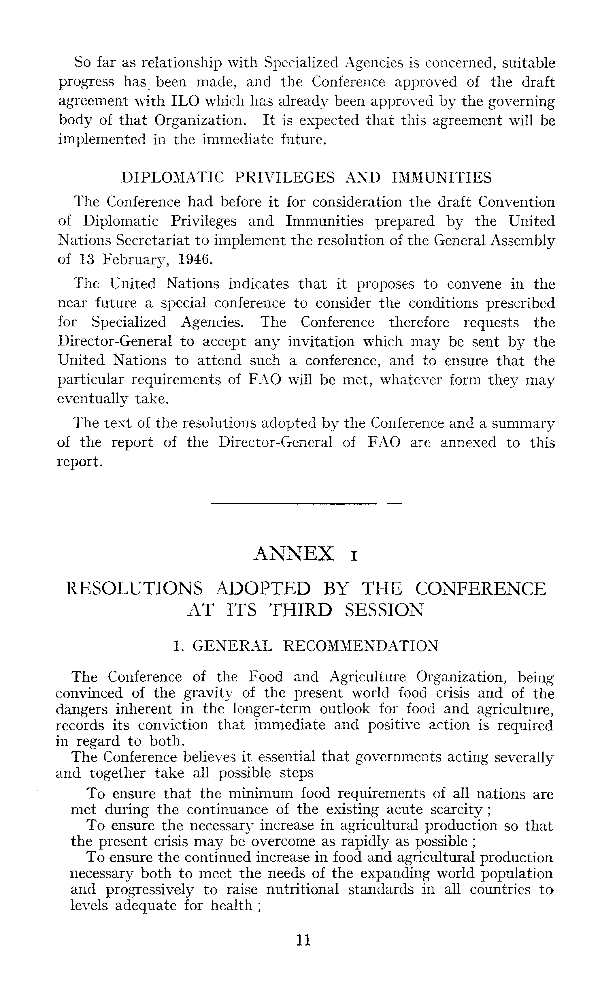 So far as relationship with Specialized Agencies is concerned, suitable progress has been made, and the Conference approved of the draft agreement with ILO which has already been approved by the governing body of that Organization. It is expected that this agreement will be implemented in the immediate future. DIPLOMATIC PRIVILEGES AND IMMUNITIES The Conference had before it for consideration the draft Convention of Diplomatic Privileges and Immunities prepared by the United Nations Secretariat to implement the resolution of the General Assembly of 13 February, 1946. The United Nations indicates that it proposes to convene in the near future a special conference to consider the conditions prescribed for Specialized Agencies. The Conference therefore requests the Director-General to accept any invitation which may be sent by the United Nations to attend such a conference, and to ensure that the particular requirements of FAO will be met, whatever form they may eventually take. The text of the resolutions adopted by the Conference and a summary of the report of the Director-General of FAO are annexed to this report.