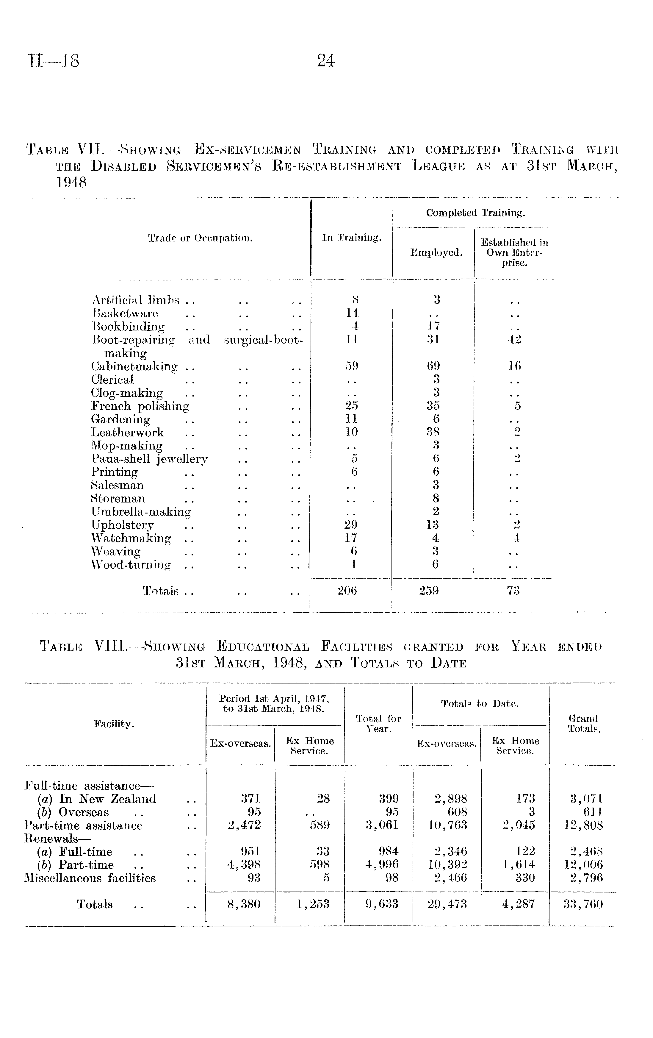 Completed Training. Trade or Occupation. In Training. Established in Employed. Own Enterprise. Artificial limbs 8 3 Basketware 14 Bookbinding 4 17 Boot-repairing and surgical-boot-11 31 42 making Cabinetmaking 59 69 16 Clerical 3 Clog-making 3 French polishing 25 35 5 Gardening .. .. 11 6 Leatherwork 10 38 2 Mop-making 3 Paua-shell jewellery 5 6 2 Printing 6 6 Salesman 3 Storeman 8 Umbrella-making 2 Upholstery 29 13 2 Watchmaking 17 4 4 Weaving 6 3 Wood-turning 1 6 Totals 206 259 73