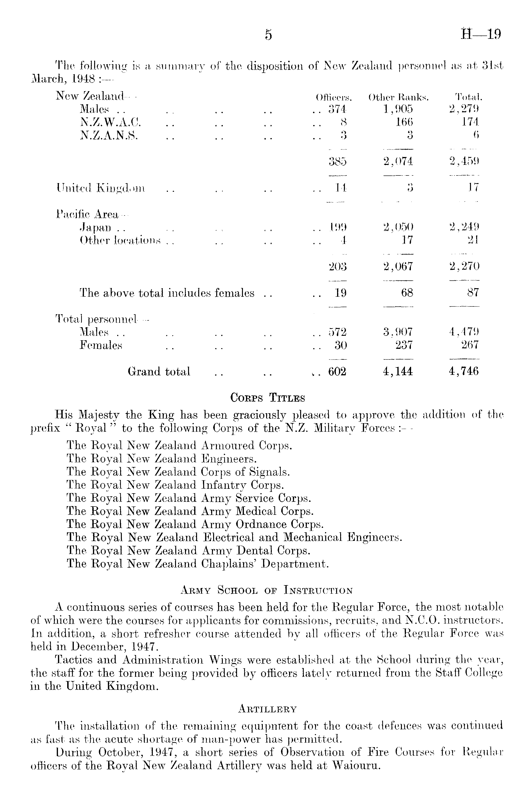 The following is a summary of the disposition of New Zealand personnel as at 31st March, 1948 : New Zealand— Officers. Other Ranks. Total. Males .. .. .. .. ..374 1,905 2,279 N.Z.W.A.C. .. .. .. .. 8 166 174 N.Z.A.N.S. .. .. .. .. 3 3 6 385 2,074 2,459 United Kingdom .. .. .. 14 3 17 Pacific Area— Japan.. .. .. .. 199 2,050 2,249 Other locations .. . . .. 4 17 21 203 2,067 2,270 The above total includes females .. 19 68 87 Total personnel—Males .. .. .. .. ..572 3,907 4,479 Females .. .. .. .. 30 237 267 Grand total .. .. v . 602 4,144 4,746 Corps Titles His Majesty the King has been graciously pleased to approve the addition of the prefix " Royal" to the following Corps of the N.Z. Military Forces : The Royal New Zealand Armoured Corps. The Royal New Zealand Engineers. The Royal New Zealand Corps of Signals. The Royal New Zealand Infantry Corps. The Royal New Zealand Army Service Corps. The Royal New Zealand Army Medical Corps. The Royal New Zealand Army Ordnance Corps. The Royal New Zealand Electrical and Mechanical Engineers. The Royal New Zealand Army Dental Corps. The Royal New Zealand Chaplains' Department. Army School of Instruction A continuous series of courses has been held for the Regular Force, the most notable of which were the courses for applicants for commissions, recruits, and N.C.O. instructors. In addition, a short refresher course attended by all officers of the Regular Force was hekHn December, 1947. Tactics and Administration Wings were established at the School during the year, the staff for the former being provided by officers lately returned from the Staff College in the United Kingdom. Artillery The installation of the remaining equipment for the coast defences was continued as fast as the acute shortage of man-power has permitted. During October, 1947, a short series of Observation of Fire Courses for Regular officers of the Royal New Zealand Artillery was held at Waiouru.