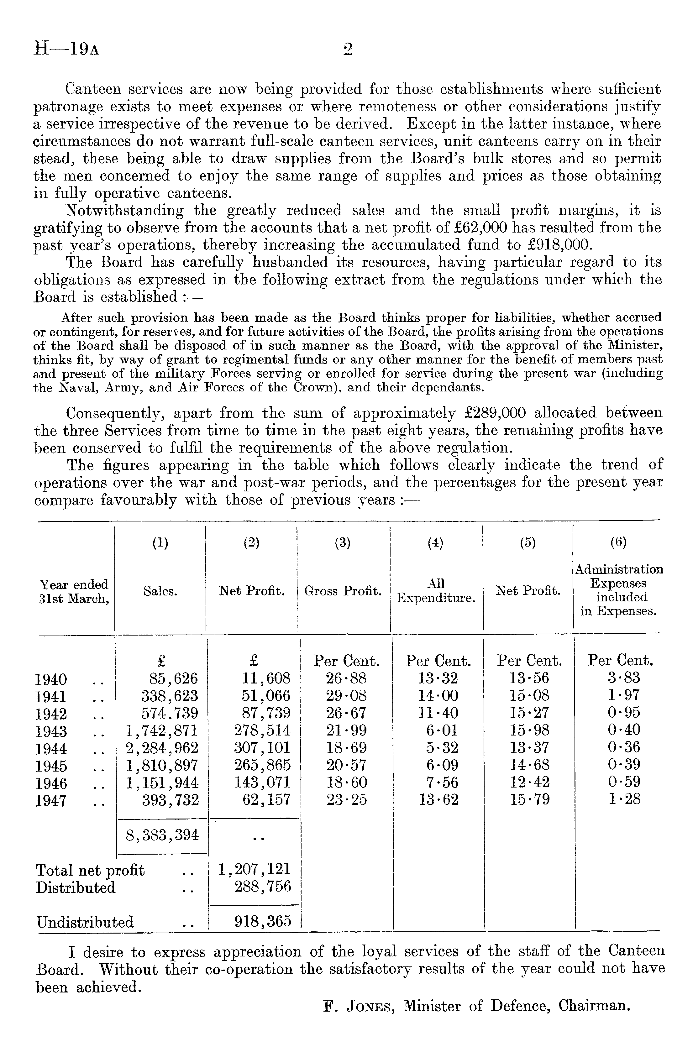I desire to express appreciation of the loyal services of the staff of the Canteen Board. Without their co-operation the satisfactory results of the year could not have been achieved. F. Jones, Minister of Defence, Chairman.