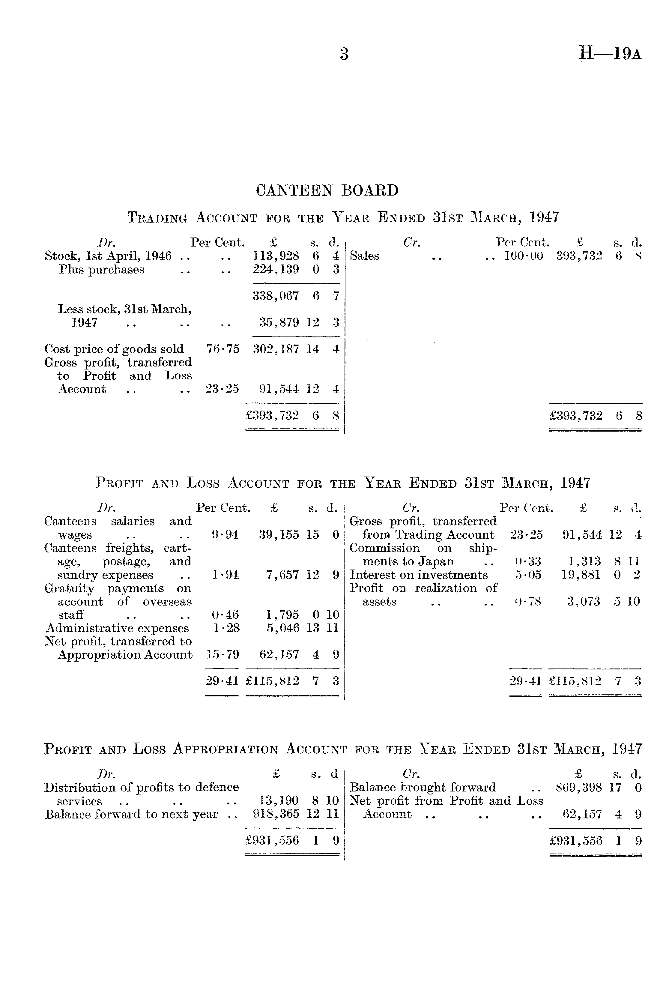 CANTEEN BOARD Trading Account for the Year Ended 31st March, 1947 Dr. Per Cent. £ s. d. Cr. Per Cent. £ s. d. Stock, Ist April, 1946 .. .. 113,928 6 4 Sales .. ..100-00 393,732 6 8 Plus purchases .. .. 224,139 0 3 338,067 6 7 Less stock, 31st March, 1947 .. .. .. 35,879 12 3 Cost price of goods sold 76*75 302,187 14 4 Gross profit, transferred to Profit and Loss Account .. .. 23-25 91,544 12 4 £393,732 6 8 £393,732 6 8 Profit and Loss Account for the Year Ended 31st March, 1947 Dr. Per Cent. £ s. d. Cr. Per Cent. £ s. d. Canteens salaries and Gross profit, transferred wages .. .. 9-94 39,155 15 0 from Trading Account 23-25 91,544 12 4 Canteens freights, cart- Commission on shipage, postage, and ments to Japan .. 0-33 1,313 811 sundry expenses .. 1-94 7,657 12 9 Interest on investments 5-05 19,881 0 2 Gratuity payments on Profit on realization of account of overseas assets .. .. 0-78 3,073 510 staff .. .. 0-46 1,795 010 Administrative expenses 1-28 5,046 13 11 Net profit, transferred to Appropriation Account 15-79 62,157 4 9 29-41 £115,812 7 3 29-41 £115,812 7 3 Profit and Loss Appropriation Account for the Year Ended 31st March, 1947 Dr. £ s. d Cr. £ s. d. Distribution of profits to defence Balance brought forward .. 869,398 17 0 services .. .. .. 13,190 810 Net profit from Profit and Loss Balance forward to next year .. 918,365 12 11 Account .. .. .. 62,157 4 9 £931,556 1 9 £931,556 1 9