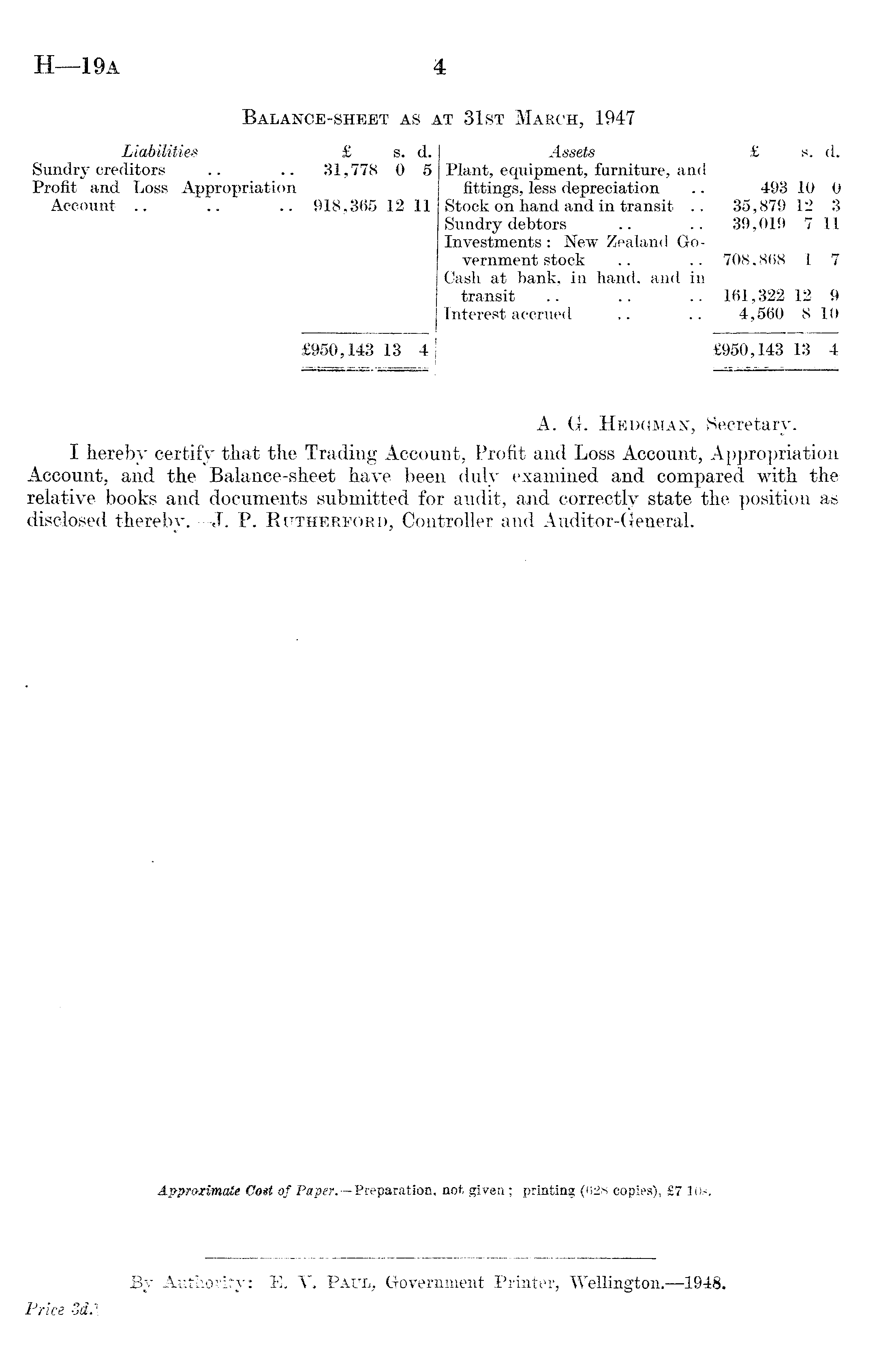 Balance-sheet as at 31st March, 1947 Liabilities . £ s. d. Assets £ s. d. Sundry creditors .. .. 31,778 0 5 Plant, equipment, furniture, and Profit and Loss Appropriation fittings, less depreciation .. 493 10 0 Account .. .. .. 918,365 12 11 Stock on hand and in transit .. 35,879 12 3 Sundry debtors .. .. 39,019 711 Investments : New Zealand Government stock .. .. 708,868 1 7 Cash at bank, in hand, and in transit .. .. .. 161,322 12 9 Interest accrued .. .. 4,560 8 10 £950,143 13 4 £950,143 13 4 A. G. Hedgman, Secretary. I hereby certify that the Trading Account, Profit and Loss Account, Appropriation Account, and the Balance-sheet have been duly examined and compared with the relative books and documents submitted for audit, and correctly state the position as disclosed thereby. —J. P. Rutherford, Controller and Auditor-General.