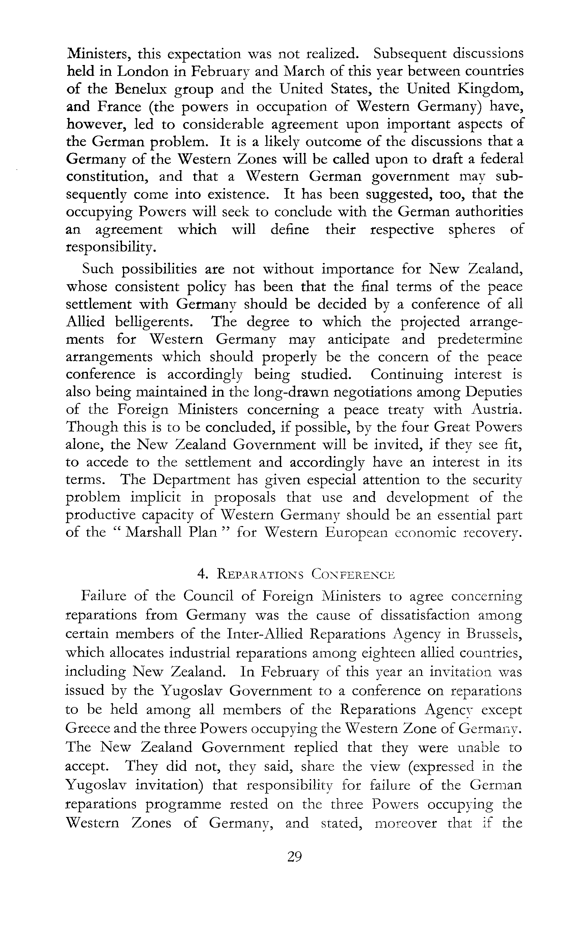 Ministers, this expectation was not realized. Subsequent discussions held in London in February and March of this year between countries of the Benelux group and the United States, the United Kingdom, and France (the powers in occupation of Western Germany) have, however, led to considerable agreement upon important aspects of the German problem. It is a likely outcome of the discussions that a Germany of the Western Zones will be called upon to draft a federal Constitution, and that a Western German government may subsequently come into existence. It has been suggested, too, that the occupying Powers will seek to conclude with the German authorities an agreement which will define their respective spheres of responsibility. Such possibilities are not without importance for New Zealand, whose consistent policy has been that the final terms of the peace settlement with Germany should be decided by a conference of all Allied belligerents. The degree to which the projected arrangements for Western Germany may anticipate and predetermine arrangements which should properly be the concern of the peace conference is accordingly being studied. Continuing interest is also being maintained in the long-drawn negotiations among Deputies of the Foreign Ministers concerning a peace treaty with Austria. Though this is to be concluded, if possible, by the four Great Powers alone, the New Zealand Government will be invited, if they see fit, to accede to the settlement and accordingly have an interest in its terms. The Department has given especial attention to the security problem implicit in proposals that use and development of the productive capacity of Western Germany should be an essential part of the " Marshall Plan " for Western European economic recovery. 4. Reparations Conference Failure of the Council of Foreign Ministers to agree concerning reparations from Germany was the cause of dissatisfaction among certain members of the Inter-Allied Reparations Agency in Brussels, which allocates industrial reparations among eighteen allied countries, including New Zealand. In February of this year an invitation was issued by the Yugoslav Government to a conference on reparations to be held among all members of the Reparations Agency except Greece and the three Powers occupying the Western Zone of Germany. The New Zealand Government replied that they were unable to accept. They did not, they said, share the view (expressed in the Yugoslav invitation) that responsibility for failure of the German reparations programme rested on the three Powers occupying the Western Zones of Germany, and stated, moreover that if the