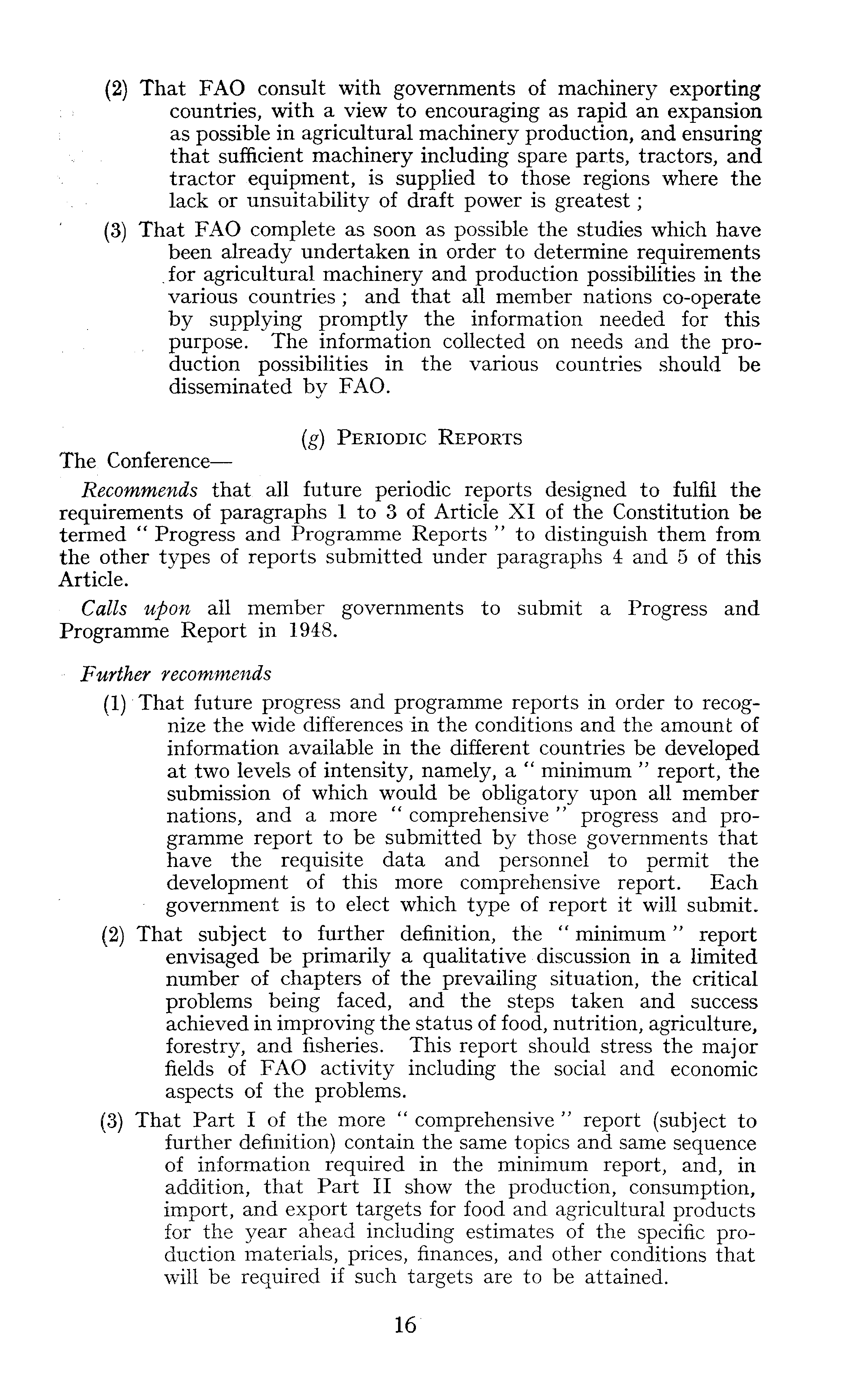 (2) That FAO consult with governments of machinery exporting countries, with a view to encouraging as rapid an expansion as possible in agricultural machinery production, and ensuring that sufficient machinery including spare parts, tractors, and tractor equipment, is supplied to those regions where the lack or unsuitability of draft power is greatest; (3) That FAO complete as soon as possible the studies which have been already undertaken in order to determine requirements for agricultural machinery and production possibilities in the various countries; and that all member nations co-operate by supplying promptly the information needed for this purpose. The information collected on needs and the production possibilities in the various countries should be disseminated by FAO. (g) Periodic Reports The Conference — Recommends that, all future periodic reports designed to fulfil the requirements of paragraphs 1 to 3 of Article XI of the Constitution be termed " Progress and Programme Reports " to distinguish them from the other types of reports submitted under paragraphs 4 and 5 of this Article. Calls upon all member governments to submit a Progress and Programme Report in 1948. Further recommends (1) That future progress and programme reports in order to recognize the wide differences in the conditions and the amount of information available in the different countries be developed at two levels of intensity, namely, a " minimum " report, the submission of which would be obligatory upon all member nations, and a more " comprehensive " progress and programme report to be submitted by those governments that have the requisite data and personnel to permit the development of this more comprehensive report. Each government is to elect which type of report it will submit. (2) That subject to further definition, the " minimum" report envisaged be primarily a qualitative discussion in a limited number of chapters of the prevailing situation, the critical problems being faced, and the steps taken and success achieved in improving the status of food, nutrition, agriculture, forestry, and fisheries. This report should stress the major fields of FAO activity including the social and economic aspects of the problems. (3) That Part I of the more " comprehensive " report (subject to further definition) contain the same topics and same sequence of information required in the minimum report, and, in addition, that Part II show the production, consumption, import, and export targets for food and agricultural products for the year ahead including estimates of the specific production materials, prices, finances, and other conditions that will be required if such targets are to be attained.