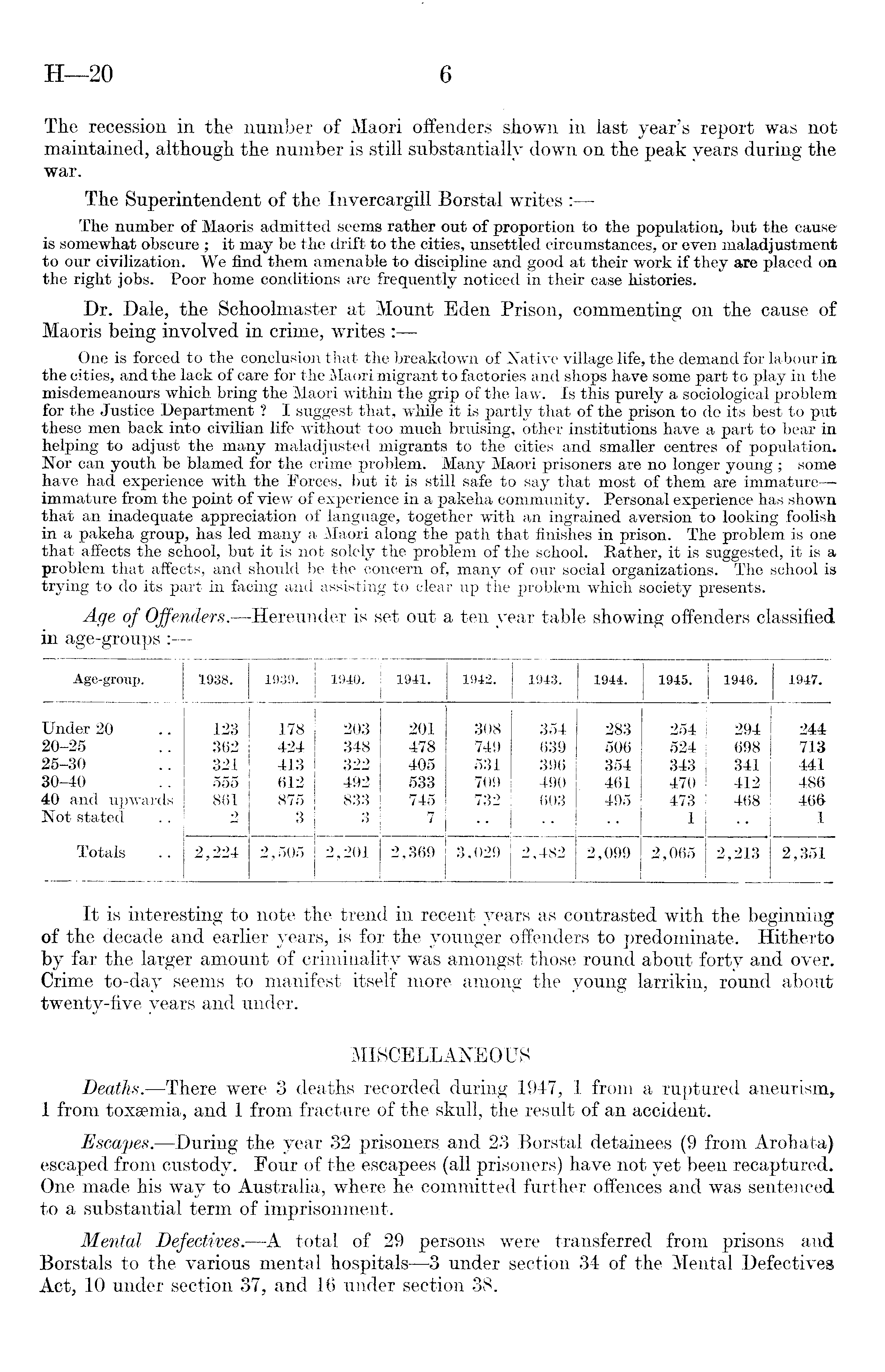 It is interesting to note the trend in recent years as contrasted with the beginning of the decade and earlier years, is for the younger offenders to predominate. Hitherto by far the larger amount of criminality was amongst those round about forty and over. Crime to-day seems to manifest itself more among the young larrikin, round about twenty-five years and under. MISCELLANEOUS Deaths. —There were 3 deaths recorded during 1947, 1 from a ruptured aneurism, 1 from toxsemia, and 1 from fracture of the skull, the result of an accident. Escapes.-—During the year 32 prisoners and 23 Borstal detainees (9 from Arohata) escaped from custody. Four of the escapees (all prisoners) have not yet been recaptured. One made his way to Australia, where he committed further offences and was sentenced to a substantial term of imprisonment. Mental Defectives. —A total of 29 persons were transferred from prisons and Borstals to the various mental hospitals—3 under section 34 of the Mental Defectives Act, 10 under section 37, and 16 under section 38.