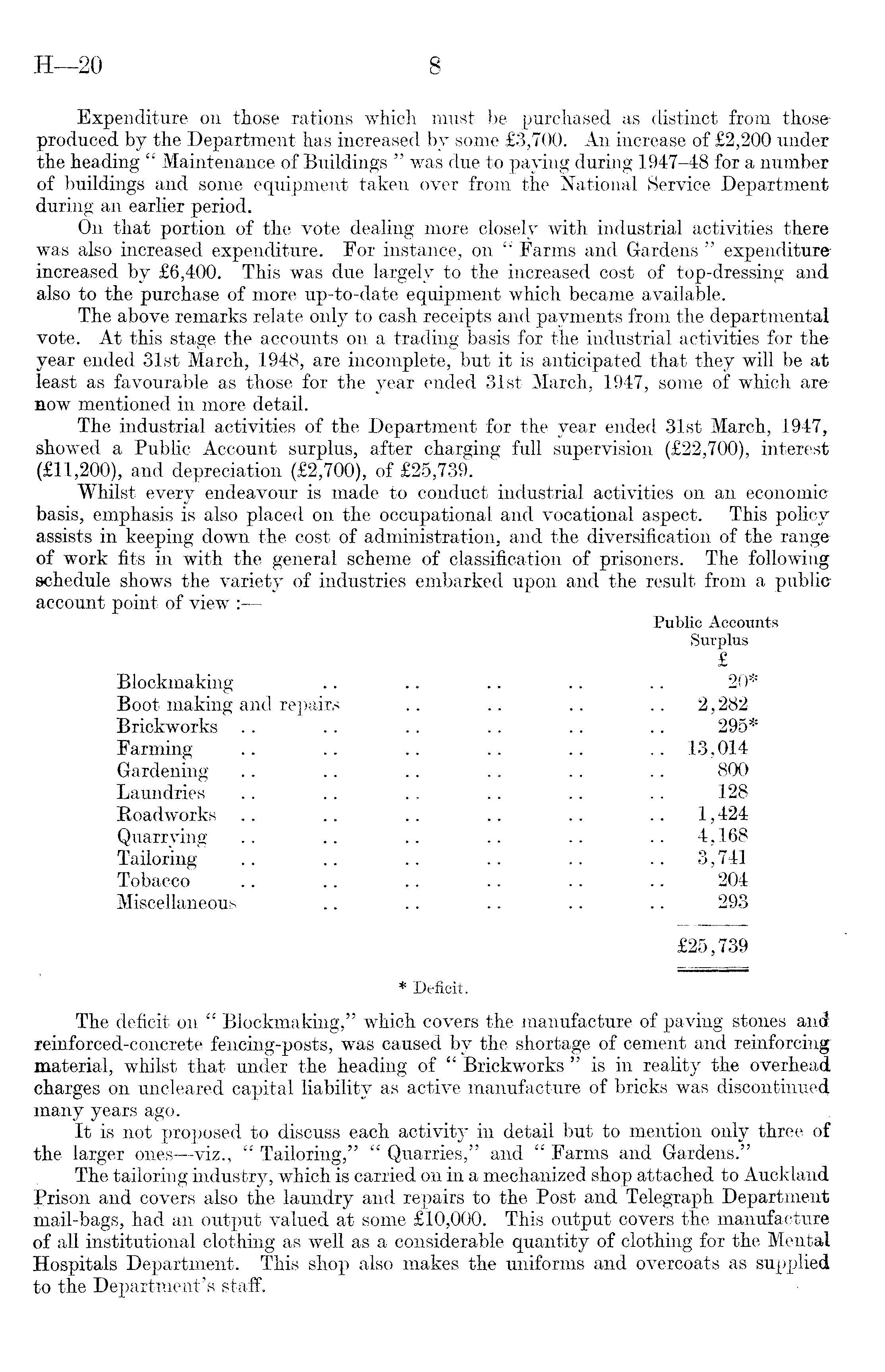 Expenditure on those rations which must be purchased as distinct from those produced by the Department has increased by some £3,700. An increase of £2,200 under the heading " Maintenance of Buildings " was due to paying during 1947-48 for a number of buildings and some equipment taken over from the National Service Department during an earlier period. On that portion of the vote dealing more closely with industrial activities there was also increased expenditure. For instance, on " Farms and Gardens " expenditure increased by £6,400. This was due largely to the increased cost of top-dressing and also to the purchase of more up-to-date equipment which became available. The above remarks relate only to cash receipts and payments from the departmental vote. At this stage the accounts on a trading basis for the industrial activities for the year ended 31st March, 1948, are incomplete, but it is anticipated that they will be at least as favourable as those for the year ended 31st March, 1947, some of which are now mentioned in more detail. The industrial activities of the Department for the year ended 31st March, 1947, showed a Public Account surplus, after charging full supervision (£22,700), interest (£11,200), and depreciation (£2,700), of £25,739. Whilst every endeavour is made to conduct industrial activities on an economic basis, emphasis is also placed on the occupational and vocational aspect. This policy assists in keeping down the cost of administration, and the diversification of the range of work fits in with the general scheme of classification of prisoners. The following schedule shows the variety of industries embarked upon and the result from a public account point of view : Public Accounts Surplus £ Blockmaking .. .. .. .. .. 20* Boot making and repairs .. .. .. .. 2,282 Brickworks .. .. .. .. .. .. 295* Farming .. .. .. .. .. .. 13,014 Gardening .. .. .. .. .. .. 800 Laundries .. .. .. .. .. .. 128 Roadworks .. .. .. .. .. 1,424 Quarrying .. .. .. .. .. .. 4,168 Tailoring .. .. .. .. .. .. 3,741 Tobacco .. .. .. .. .. .. 204 Miscellaneous .. .. .. .. .. 293 £25,739 * Deficit. The deficit on " Blockmaking," which covers the manufacture of paving stones and reinforced-concrete fencing-posts, was caused by the shortage of cement and reinforcing material, whilst that under the heading of " Brickworks " is in reality the overhead charges on uncleared capital liability as active manufacture of bricks was discontinued many years ago. It is not proposed to discuss each activity in detail but to mention only three of the larger ones—viz., " Tailoring," " Quarries," and " Farms and Gardens." The tailoring industry, which is carried on in a mechanized shop attached to Auckland Prison and covers also the laundry and repairs to the Post and Telegraph Department mail-bags, had an output valued at some £lO,OOO. This output covers the manufacture of all institutional clothing as well as a considerable quantity of clothing for the Mental Hospitals Department. This shop also makes the uniforms and overcoats as supplied to the Department's staff.