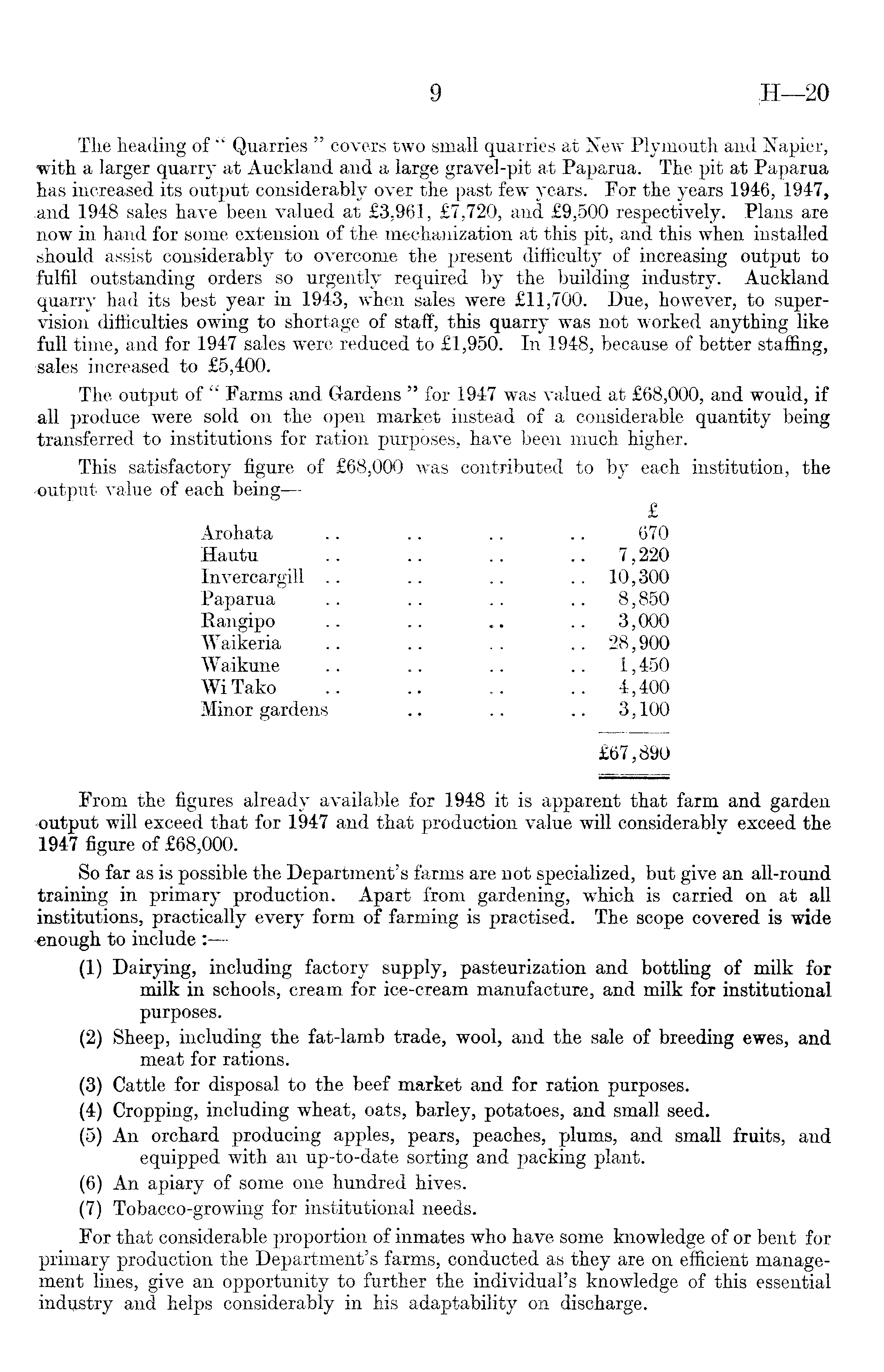 The heading of " Quarries " covers two small quarries at New Plymouth and Napier, with a larger quarry at Auckland and a large gravel-pit at Paparua. The pit at Paparua has increased its output considerably over the past few years. For the years 1946, 1947, .and 1948 sales have been valued at £3.961, £7,720, and £9,500 respectively. Plans are now in hand for some extension of the mechanization at this pit, and this when installed should assist considerably to overcome the present difficulty of increasing output to fulfil outstanding orders so urgently required by the building industry. Auckland quarry had its best year in 1943, when sales were £11,700. Due, however, to supervision difficulties owing to shortage of staff, this quarry was not worked anything like full time, and for 1947 sales were reduced to £1,950. In 1948, because of better staffing, sales increased to £5,400. The output of " Farms and Gardens " for 1947 was valued at £68,000, and would, if all produce were sold on the open market instead of a considerable quantity being transferred to institutions for ration purposes, have been much higher. This satisfactory figure of £68,000 was contributed to by each institution, the output value of each being—- £ Arohata .. .. .. .. 670 Hautu .. .. .. .. 7,220 Invercargill .. .. .. .. 10,300 Paparua .. .. .. .. 8,850 Rangipo .. .. .. .. 3,000 Waikeria .. .. .. .. 28,900 Waikune .. .. .. .. 1,450 Wi Tako .. .. .. .. 4,400 Minor gardens .. .. .. 3,100 £67,890 From the figures already available for 1948 it is apparent that farm and garden ■output will exceed that for 1947 and that production value will considerably exceed the 1947 figure of £68,000. So far as is possible the Department's farms are Dot specialized, but give an all-round training in primary production. Apart from gardening, which is carried on at all institutions, practically every form of farming is practised. The scope covered is wide to include : (1) Dairying, including factory supply, pasteurization and bottling of milk for milk in schools, cream for ice-cream manufacture, and milk for institutional purposes. (2) Sheep, including the fat-lamb trade, wool, and the sale of breeding ewes, and meat for rations. (3) Cattle for disposal to the beef market and for ration purposes. (4) Cropping, including wheat, oats, barley, potatoes, and small seed. (5) An orchard producing apples, pears, peaches, plums, and small fruits, and equipped with an up-to-date sorting and packing plant. (6) An apiary of some one hundred hives. (7) Tobacco-growing for institutional needs. For that considerable proportion of inmates who have some knowledge of or bent for primary production the Department's farms, conducted as they are on efficient management lines, give an opportunity to further the individual's knowledge of this essential industry and helps considerably in his adaptability on discharge.