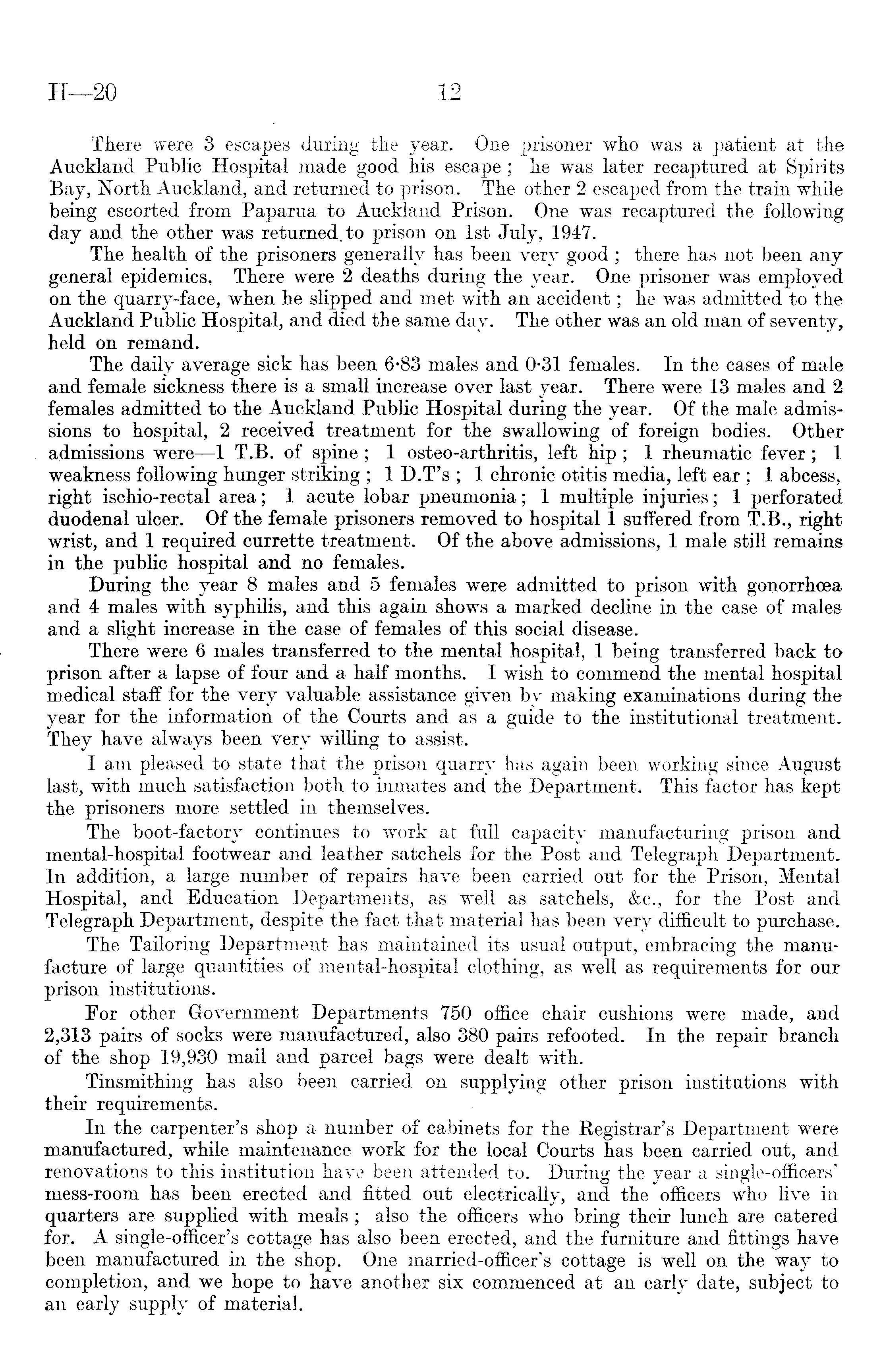 There were 3 escapes during the year. One prisoner who was a patient at the Auckland Public Hospital made good his escape; he was later recaptured at Spirits Bay, North Auckland, and returned to prison. The other 2 escaped from the train while being escorted from Paparua to Auckland Prison. One was recaptured the following day and the other was returned, to prison on Ist July, 1947. The health of the prisoners generally has been very good ; there has not been any general epidemics. There were 2 deaths during the year. One prisoner was employed on the quarry-face, when he slipped and met with an accident; he was admitted to the Auckland Public Hospital, and died the same day. The other was an old man of seventy, held on remand. The daily average sick has been 6*83 males and o*3l females. In the cases of male and female sickness there is a small increase over last year. There were 13 males and 2 females admitted to the Auckland Public Hospital during the year. Of the male admissions to hospital, 2 received treatment for the swallowing of foreign bodies. Other admissions were —1 T.B. of spine; 1 osteo-arthritis, left hip; 1 rheumatic fever; 1 weakness following hunger striking ; 1 D.T's ; 1 chronic otitis media, left ear ; 1 abcess, right ischio-rectal area; 1 acute lobar pneumonia; 1 multiple injuries; 1 perforated duodenal ulcer. Of the female prisoners removed to hospital 1 suffered from T. 8., right wrist, and 1 required currette treatment. Of the above admissions, 1 male still remains in the public hospital and no females. During the year 8 males and 5 females were admitted to prison with gonorrhoea and 4 males with syphilis, and this again shows a marked decline in the case of males and a slight increase in the case of females of this social disease. There were 6 males transferred to the mental hospital, 1 being transferred back to prison after a lapse of four and a half months. I wish to commend the mental hospital medical staff for the very valuable assistance given by making examinations during the year for the information of the Courts and as a guide to the institutional treatment. They have always been very willing to assist. I am pleased to state that the prison quarry has again been working since August last, with much satisfaction both to inmates and the Department. This factor has kept the prisoners more settled in themselves. The boot-factory continues to work at full capacity manufacturing prison and mental-hospital footwear and leather satchels for the Post and Telegraph Department. In addition, a large number of repairs have been carried out for the Prison, Mental Hospital, and Education Departments, as well as satchels, &c., for the Post and Telegraph Department, despite the fact that material has been very difficult to purchase. The Tailoring Department has maintained its usual output, embracing the manufacture of large quantities of mental-hospital clothing, as well as requirements for our prison institutions. For other Government Departments 750 office chair cushions were made, and 2,313 pairs of socks were manufactured, also 380 pairs refooted. In the repair branch of the shop 19,930 mail and parcel bags were dealt with. Tinsmithing has also been carried on supplying other prison institutions with their requirements. In the carpenter's shop a number of cabinets for the Registrar's Department were manufactured, while maintenance work for the local Courts has been carried out, and renovations to this institution have been attended to. During the year a single-officers' mess-room has been erected and fitted out electrically, and the officers who live in quarters are supplied with meals ; also the officers who bring their lunch are catered for. A single-officer's cottage has also been erected, and the furniture and fittings have been manufactured in the shop. One married-officer's cottage is well on the way to completion, and we hope to have another six commenced at an early date, subject to an early supply of material.