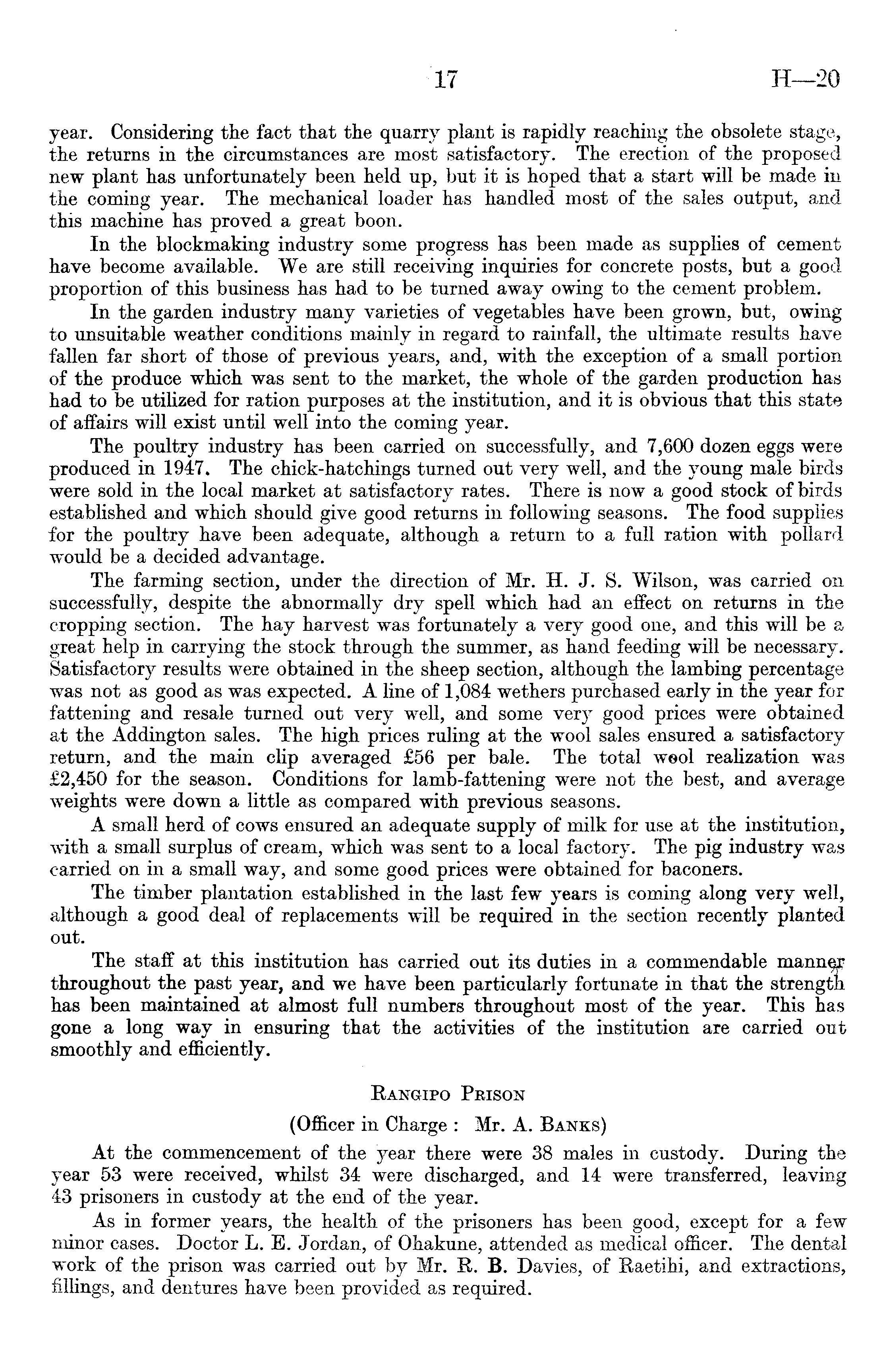 year. Considering the fact that the quarry plant is rapidly reaching the obsolete stage, the returns in the circumstances are most satisfactory. The erection of the proposed new plant has unfortunately been held up, but it is hoped that a start will be made in the coming year. The mechanical loader has handled most of the sales output, and this machine has proved a great boon. In the blockmaking industry some progress has been made as supplies of cement have become available. We are still receiving inquiries for concrete posts, but a good proportion of this business has had to be turned away owing to the cement problem. In the garden industry many varieties of vegetables have been grown, but, owing to unsuitable weather conditions mainly in regard to rainfall, the ultimate results have fallen far short of those of previous years, and, with the exception of a small portion of the produce which was sent to the market, the whole of the garden production has had to be utilized for ration purposes at the institution, and it is obvious that this state of affairs will exist until well into the coming year. The poultry industry has been carried on successfully, and 7,600 dozen eggs were produced in 1947. The chick-hatchings turned out very well, and the young male birds were sold in the local market at satisfactory rates. There is now a good stock of birds established and which should give good returns in following seasons. The food supplies for the poultry have been adequate, although a return to a full ration with pollard would be a decided advantage. The farming section, under the direction of Mr. H. J. S. Wilson, was carried on successfully, despite the abnormally dry spell which had an effect on returns in the cropping section. The hay harvest was fortunately a very good one, and this will be a great help in carrying the stock through the summer, as hand feeding will be necessary. Satisfactory results were obtained in the sheep section, although the lambing percentage was not as good as was expected. A line of 1,084 wethers purchased early in the year for fattening and resale turned out very well, and some ver} T good prices were obtained at the Addington sales. The high prices ruling at the wool sales ensured a satisfactory return, and the main clip averaged £56 per bale. The total wool realization was £2,450 for the season. Conditions for lamb-fattening were not the best, and average weights were down a little as compared with previous seasons. A small herd of cows ensured an adequate supply of milk for use at the institution, with a small surplus of cream, which was sent to a local factory. The pig industry was carried on in a small way, and some good prices were obtained for baconers. The timber plantation established in the last few years is coming along very well, although a good deal of replacements will be required in the section recently planted out. The staff at this institution has carried out its duties in a commendable manner throughout the past year, and we have been particularly fortunate in that the strength has been maintained at almost full numbers throughout most of the year. This has gone a long way in ensuring that the activities of the institution are carried out smoothly and efficiently. Rangipo Prison (Officer in Charge : Mr. A. Banks) At the commencement of the year there were 38 males in custody. During the year 53 were received, whilst 34 were discharged, and 14 were transferred, leaving 43 prisoners in custody at the end of the year. As in former years, the health of the prisoners has been good, except for a few minor cases. Doctor L. E. Jordan, of Ohakune, attended as medical officer. The dental work of the prison was carried out by Mr. R. B. Davies, of Raetihi, and extractions, fillings, and dentures have been provided as required.