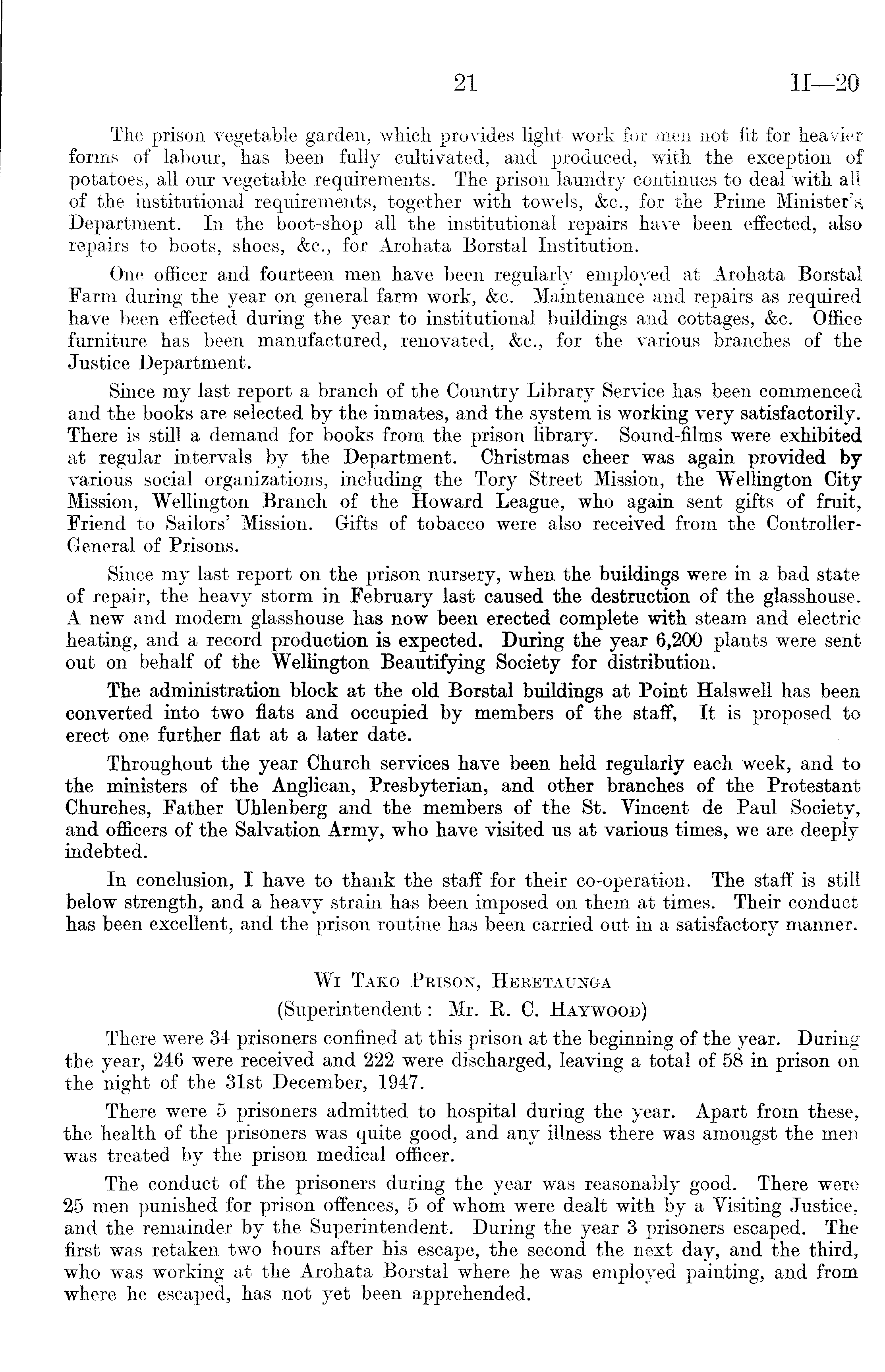 The prison vegetable garden, which provides light work for men not fit for heavier forms of labour, has been fully cultivated, and produced, with the exception of potatoes, all our vegetable requirements. The prison laundry continues to deal with all of the institutional requirements, together with towels, &c., for the Prime Minister's Department. In the boot-shop all the institutional repairs have been effected, also repairs to boots, shoes, &c., for Arohata Borstal Institution. One officer and fourteen men have been regularly employed at Arohata Borstal Farm during the year on general farm work, &c. Maintenance and repairs as required have been effected during the year to institutional buildings and cottages, &c. Office furniture has been manufactured, renovated, &c., for the various branches of the Justice Department. Since my last report a branch of the Country Library Service has been commenced and the books are selected by the inmates, and the system is working very satisfactorily. There is still a demand for books from the prison library. Sound-films were exhibited at regular intervals by the Department. Christmas cheer was again provided by various social organizations, including the Tory Street Mission, the Wellington City Mission, Wellington Branch of the Howard League, who again sent gifts of fruit, Friend to Sailors' Mission. Gifts of tobacco were also received from the ControllerGeneral of Prisons. Since my last report on the prison nursery, when the buildings were in a bad state of repair, the heavy storm in February last caused the destruction of the glasshouse. A new and modern glasshouse has now been erected complete with steam and electric heating, and a record production is expected. During the year 6,200 plants were sent out on behalf of the Wellington Beautifying Society for distribution. The administration block at the old Borstal buildings at Point Halswell has been converted into two flats and occupied by members of the staff, It is proposed to erect one further flat at a later date. Throughout the year Church services have been held regularly each week, and to the ministers of the Anglican, Presbyterian, and other branches of the Protestant Churches, Father Uhlenberg and the members of the St. Vincent de Paul Society, and officers of the Salvation Army, who have visited us at various times, we are deeply indebted. In conclusion, I have to thank the staff for their co-operation. The staff is still below strength, and a heavy strain has been imposed on them at times. Their conduct has been excellent, and the prison routine has been carried out in a satisfactory manner. Wi Tako Pbison, Here taxing a (Superintendent: Mr. R. C. Haywood) There were 34 prisoners confined at this prison at the beginning of the year. During the year, 246 were received and 222 were discharged, leaving a total of 58 in prison on the night of the 31st December, 1947. There were 5 prisoners admitted to hospital during the year. Apart from these, the health of the prisoners was quite good, and any illness there was amongst the men was treated by the prison medical officer. The conduct of the prisoners during the year was reasonably good. There were 25 men punished for prison offences, 5 of whom were dealt with by a Visiting Justice, and the remainder by the Superintendent. During the year 3 prisoners escaped. The first was retaken two hours after his escape, the second the next day, and the third, who was working at the Arohata Borstal where he was employed painting, and from where he escaped, has not yet been apprehended.