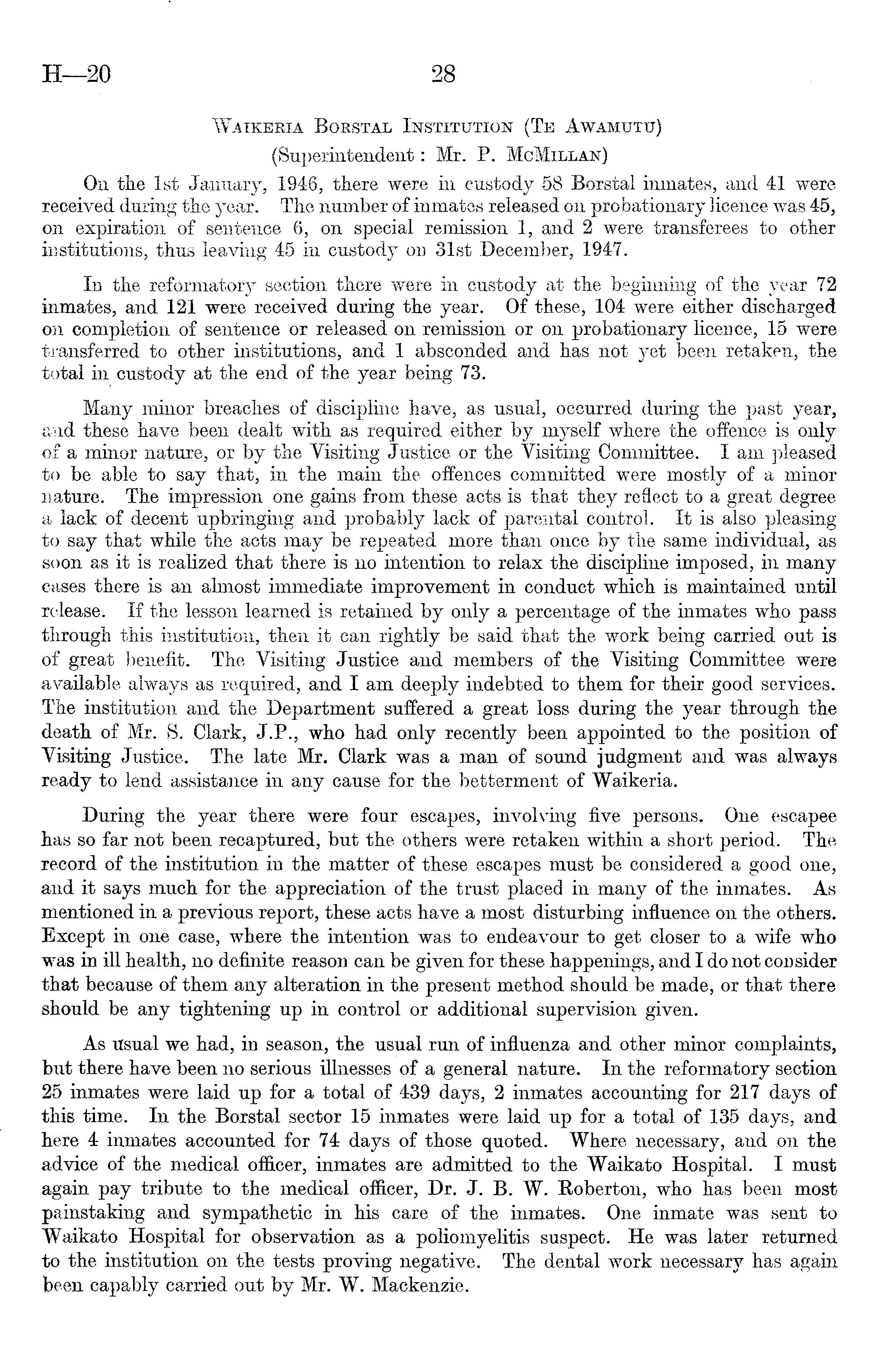 Waikeria Borstal Institution (Te Awamuttj) (Superintendent: Mr. P. McMillan) On the Ist January, 1946, there were in custody 58 Borstal inmates, and 41 were received during the year. The number of inmates released on probationary licence was 45, on expiration of sentence 6, on special remission 1, and 2 were transferees to other institutions, thus leaving 45 in custody on 31st December, 1947. In the reformatory section there were in custody at the beginning of the year 72 inmates, and 121 were received during the year. Of these, 104 were either discharged on completion of sentence or released on remission or on probationary licence, 15 were transferred to other institutions, and 1 absconded and has not yet been retaken, the total in custody at the end of the year being 73. Many minor breaches of discipline have, as usual, occurred during the past year, and these have been dealt with as required either by myself where the offence is only of a minor nature, or by the Visiting Justice or the Visiting Committee. lam pleased to be able to say that, in the main the offences committed were mostly of a minor nature. The impression one gains from these acts is that they reflect to a great degree a lack of decent upbringing and probably lack of parental control. It is also pleasing to say that while the acts may be repeated more than once by the same individual, as soon as it is realized that there is no intention to relax the discipline imposed, in many cases there is an almost immediate improvement in conduct which is maintained until release. If the lesson learned is retained by only a percentage of the inmates who pass through this institution, then it can rightly be said that the work being carried out is of great benefit. The Visiting Justice and members of the Visiting Committee were available always as required, and I am deeply indebted to them for their good services. The institution and the Department suffered a great loss during the year through the death of Mr. S. Clark, J.P., who had only recently been appointed to the position of Visiting Justice. The late Mr. Clark was a man of sound judgment and was always ready to lend assistance in any cause for the betterment of Waikeria. During the year there were four escapes, involving five persons. One escapee has so far not been recaptured, but the others were retaken within a short period. The record of the institution in the matter of these escapes must be considered a good one, and it says much for the appreciation of the trust placed in many of the inmates. As mentioned in a previous report, these acts have a most disturbing influence on the others. Except in one case, where the intention was to endeavour to get closer to a wife who was in ill health, no definite reason can be given for these happenings, and I do not consider that because of them any alteration in the present method should be made, or that there should be any tightening up in control or additional supervision given. As ilsual we had, in season, the usual run of influenza and other minor complaints, but there have been no serious illnesses of a general nature. In the reformatory section 25 inmates were laid up for a total of 439 days, 2 inmates accounting for 217 days of this time. In the Borstal sector 15 inmates were laid up for a total of 135 days, and here 4 inmates accounted for 74 days of those quoted. Where necessary, and on the advice of the medical officer, inmates are admitted to the Waikato Hospital. I must again pay tribute to the medical officer, Dr. J. B. W. Roberton, who has been most painstaking and sympathetic in his care of the inmates. One inmate was sent to Waikato Hospital for observation as a poliomyelitis suspect. He was later returned to the institution on the tests proving negative. The dental work necessary has again been capably carried out by Mr. W. Mackenzie.