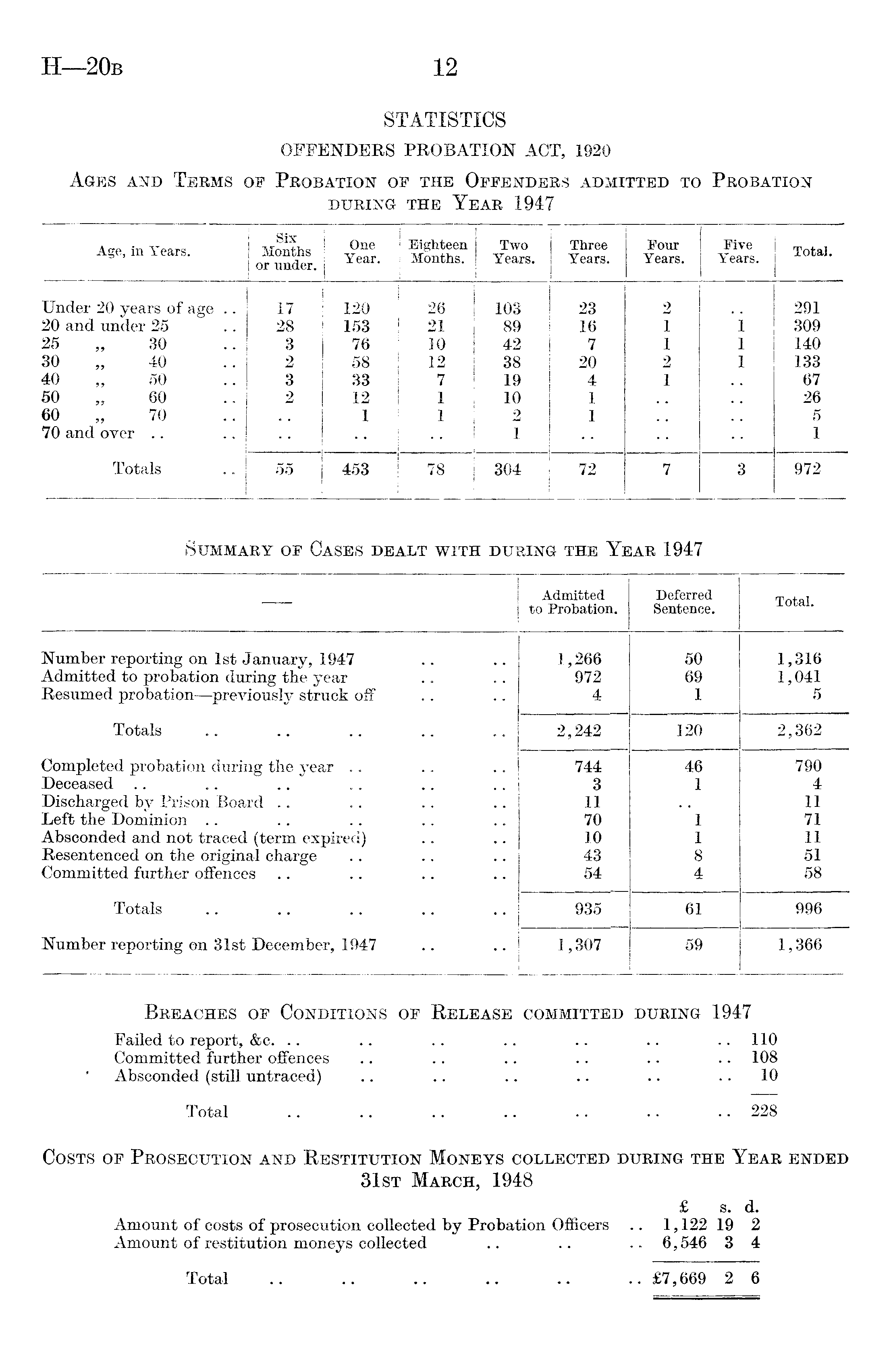 Breaches of Conditions of Release committed during 1947 Failed to report, &c. .. .. .. .. .. .. .. 110 Committed further offences .. .. ~ .. .. .. 108 Absconded (still untraced) .. .. .. .. .. 10 Total .. .. .. .. .. .. .. 228 V Costs of Prosecution and Restitution Moneys collected during the Year ended 31st March, 1948 £ s. d. Amount of costs of prosecution collected by Probation Officers .. 1,122 19 2 Amount of restitution moneys collected .. .. .. 6,546 3 4 Total .. .. .. .. .. .. £7,669 2 6