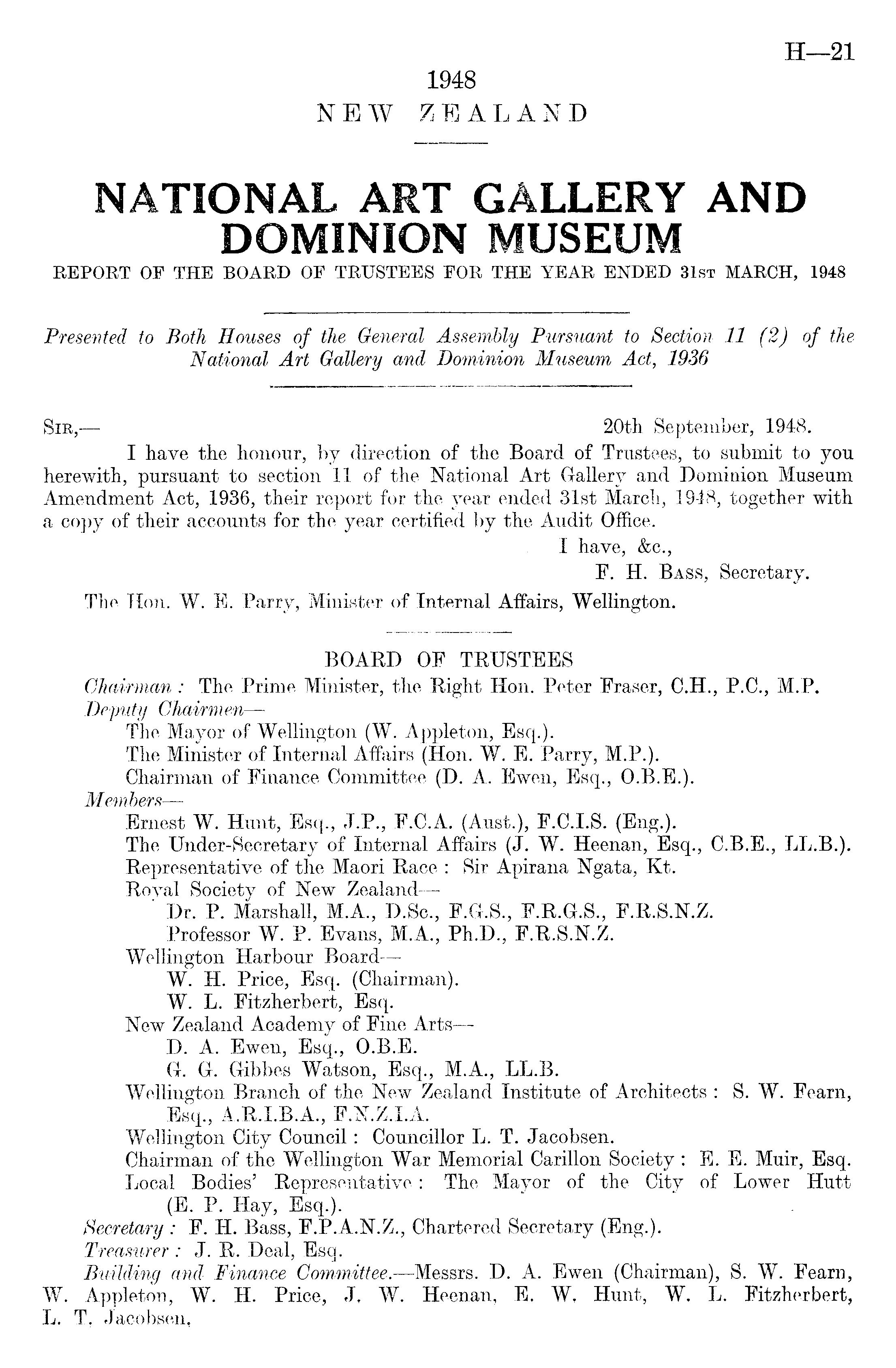 Sir, — 20th September, 1948. I have the honour, by direction of the Board of Trustees, to submit to you herewith, pursuant to section 11 of the National Art Gallery and Dominion Museum Amendment Act, 1936, their report for the year ended 31st March, 1948, together with a copy of their accounts for the year certified by the Audit Office. I have, &c., F. H. Bass, Secretary. The Hon. W. E. Parry, Minister of Internal Affairs, Wellington.
