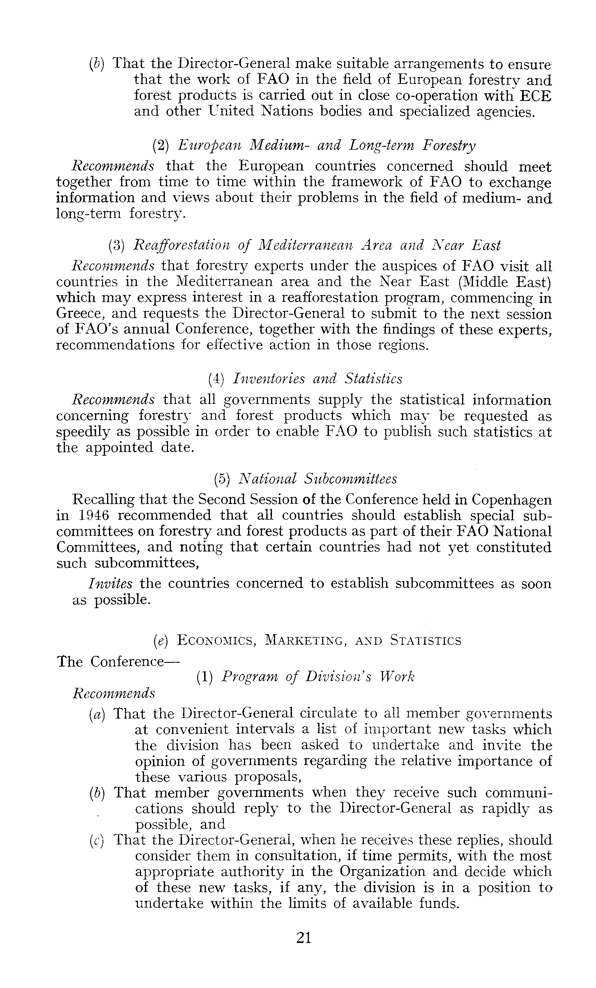 (b) That the Director-General make suitable arrangements to ensure that the work of FAO in the field of European forestry and forest products is carried out in close co-operation with ECE and other United Nations bodies and specialized agencies. (2) European Medium- and Long-term Forestry Recommends that the European countries concerned should meet together from time to time within the framework of FAO to exchange information and views about their problems in the field of medium- and long-term forestry. (3) Reafforestation of Mediterranean Area and Near East Recommends that forestry experts under the auspices of FAO visit all countries in the Mediterranean area and the Near East (Middle East) which may express interest in a reafforestation program, commencing in Greece, and requests the Director-General to submit to the next session of FAO's annual Conference, together with the findings of these experts, recommendations for effective action in those regions. (4) Inventories and Statistics Recommends that all governments supply the statistical information concerning forestry and forest products which may be requested as speedily as possible in order to enable FAO to publish such statistics at the appointed date. (5) National Subcommittees Recalling that the Second Session of the Conference held in Copenhagen in 1946 recommended that all countries should establish special subcommittees on forestry and forest products as part of their FAO National Committees, and noting that certain countries had not yet constituted such subcommittees, Invites the countries concerned to establish subcommittees as soon as possible. {e) Economics, Marketing, and Statistics The Conference — (1) Program of Division s Work Recommends (a) That the Director-General circulate to all member governments at convenient intervals a list of important new tasks which the division has been asked to undertake and invite the opinion of governments regarding the relative importance of these various proposals, (b) That member governments when they receive such communications should reply to the Director-General as rapidly as possible, and (c) That the Director-General, when he receives these replies, should consider them in consultation, if time permits, with the most appropriate authority in the Organization and decide which of these new tasks, if any, the division is in a position to undertake within the limits of available funds.