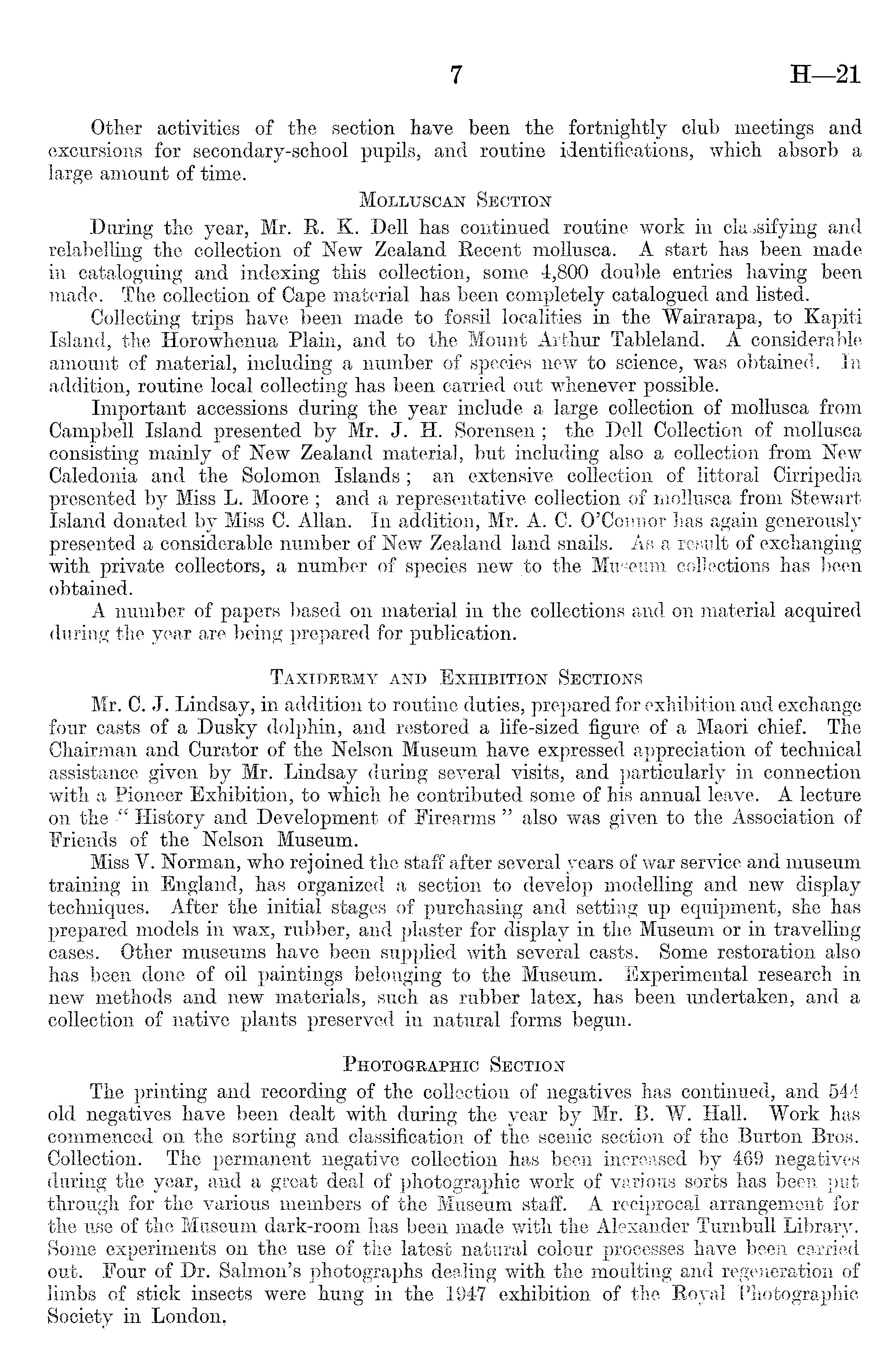Other activities of the section have been the fortnightly club meetings and excursions for secondary-school pupils, and routine identifications, which absorb a large amount of time. Molluscan Section During the year, Mr. R. K. Dell has continued routine work in classifying and relabelling the collection of New Zealand Recent mollusca. A start has been made in cataloguing and indexing this collection, some 4,800 double entries having been made. The collection of Cape material has been completely catalogued and listed. Collecting trips have been made to fossil localities in the Wairarapa, to Kapiti Island, the Horowhenua Plain, and to the Mount Arthur Tableland. A considerable amount of material, including a number of species new to science, was obtained. In addition, routine local collecting has been carried out whenever possible. Important accessions during the year include a large collection of mollusca from Campbell Island presented by Mr. J. H. Sorensen ; the Dell Collection of mollusca consisting mainly of New Zealand material, but including also a collection from New Caledonia and the Solomon Islands ; an extensive collection of littoral Cirripedia presented by Miss L. Moore ; and a representative collection of mollusca from Stewart Island donated by Miss C. Allan. In addition, Mr. A. C. O'Connor has again generously presented a considerable number of New Zealand land snails. As a result of exchanging with private collectors, a number of species new to the Museum collections has been obtained. A number of papers based on material in the collections and on material acquired during the year are being prepared for publication. Taxidermy and Exhibition Sections Mr. C. J. Lindsay, in addition to routine duties, prepared for exhibition and exchange four casts of a Dusky dolphin, and restored a life-sized figure of a Maori chief. The Chairman and Curator of the Nelson Museum have expressed appreciation of technical assistance given by Mr. Lindsay during several visits, and particularly in connection with a Pioneer Exhibition, to which he contributed some of his annual leave. A lecture on the " History and Development of Firearms " also was given to the Association of Friends of the Nelson Museum. Miss V. Norman, who rejoined the staff after several years of war service and museum training in England, has organized a section to develop modelling and new display techniques. After the initial stages of purchasing and setting up equipment, she has prepared models in wax, rubber, and plaster for display in the Museum or in travelling cases. Other museums have been supplied with several casts. Some restoration also has been done of oil paintings belonging to the Museum. Experimental research in new methods and new materials, such as rubber latex, has been undertaken, and a collection of native plants preserved in natural forms begun. Photographic Section The printing and recording of the collection of negatives has continued, and 544 old negatives have been dealt with during the year by Mr. B. W. Hall. Work has commenced on the sorting and classification of the scenic section of the Burton Bros. Collection. The permanent negative collection has been increased by 469 negatives during the year, and a great deal of photographic work of various sorts has been put through for the various members of the Museum staff. A reciprocal arrangement for the use of the Museum dark-room has been made with the Alexander Turnbull Library. Some experiments on the use of the latest natural colour processes have been carried out. Four of Dr. Salmon's photographs dealing with the moulting and regeneration of limbs of stick insects were hung in the 1947 exhibition of the Royal Photographic Society in London.