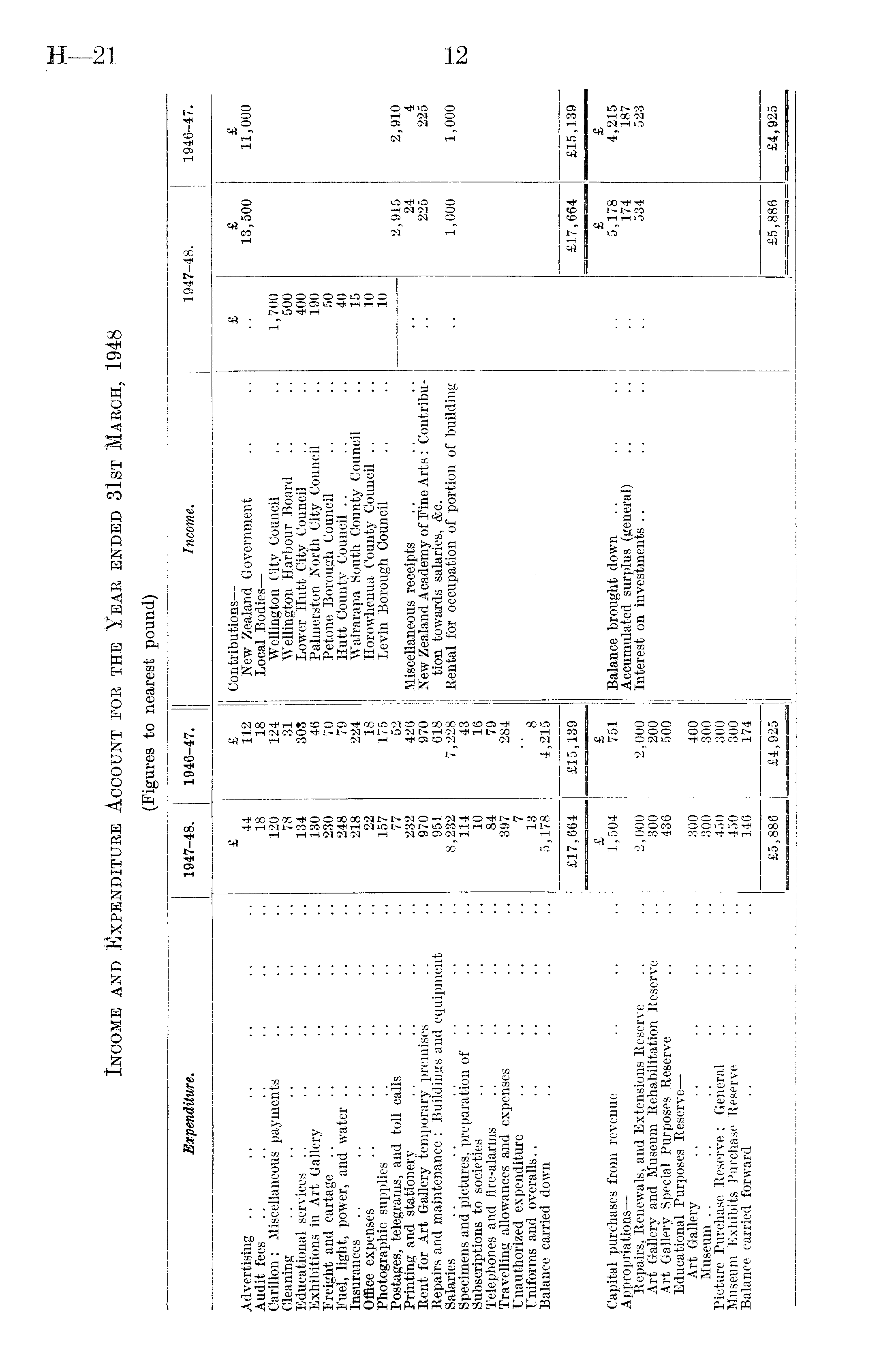 (Figures to nearest pound) Expenditure. 1947-48. 1946-47. Income. 1947-48. 1946-47. £ £ Contributions — £ £ £ Advertising 44 112 New Zealand Government 13,500 11,000 Audit fees 18 18 Local Bodies — Carillon: Miscellaneous payments 120 124 Wellington City Council 1,700 Cleaning 78 31 Wellington Harbour Board 500 Educational services 134 308 Lower Hutt City Council 400 Exhibitions in Art Gallery 130 46 Palmerston North City Council 190 Freight and cartage 230 70 Petone Borough Council 50 Fuel, light, power, and water 248 79 Hutt County Council 40 Insurances 218 224 Wairarapa South County Council 15 Office expenses 22 18 Horowhenua County Council 10 Photographic supplies 157 175 Levin Borough Council 10 Mnofo rfoo tolorrrQiYio on/1 frill nolle 77 52 2,915 2,910 JL UStdgcS, tclcglclIIlDj dliu tuil L/d/lIo . . . . . . # < Printing and stationery 232 426 Miscellaneous receipts 24 4 Rent for Art Gallery temporary premises 970 970 New Zealand Academy of Fine Arts: Contribu225 225 Repairs and maintenance : Buildings and equipment 951 618 tion towards salaries, &c. Salaries 8,232 7,228 Rental for occupation of portion of building 1,000 1,000 Specimens and pictures, preparation of .. 114 43 Subscriptions to societies 10 16 Telephones and fire-alarms 84 79 Travelling allowances and expenses 397 284 Unauthorized expenditure 7 Uniforms and overalls 13 " 8 Balance carried down 5,178 4,215 £17,664 £15,139 £17,664 £15,139 £ £ £ £ Capital purchases from revenue 1,504 751 Balance brought down 5,178 4,215 Appropriations — Accumulated surplus (general) 174 187 Repairs, Renewals, and Extensions Reserve 2,000 2,000 Interest on investments 534 523 Art Gallery and Museum Rehabilitation Reserve 300 200 Art Gallery Special Purposes Reserve 436 500 Educational Purposes Reserve — Art Gallery 300 400 Museum 300 300 Picture Purchase Reserve : General 450 300 Museum Exhibits Purchase Reserve 450 300 Balance carried forward 146 174 £5,886 £4,925 £5,886 £4,925 ,s=sa i ■ =»