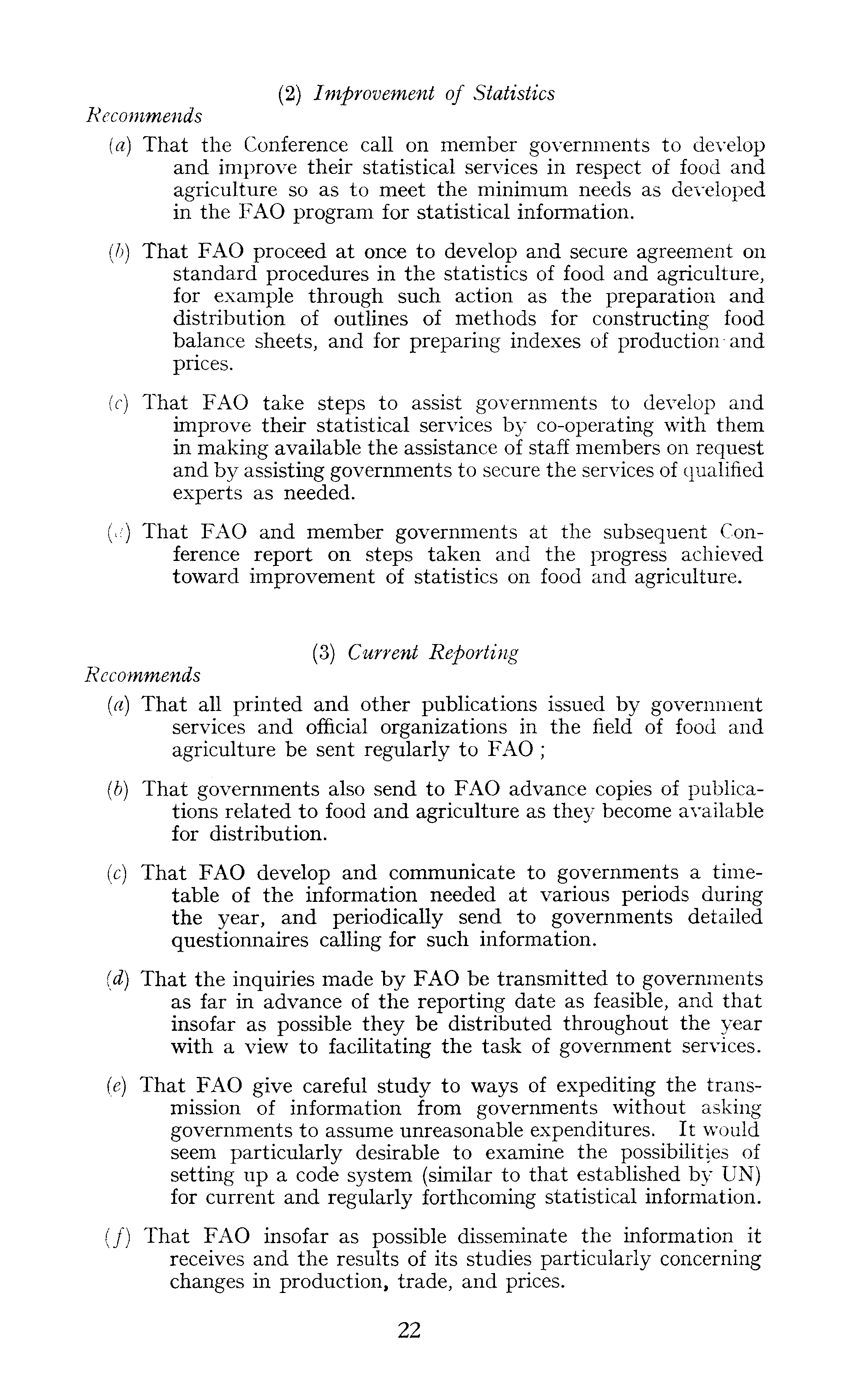 (2) Improvement of Statistics Recommends (a) That the Conference call on member governments to develop and improve their statistical services in respect of food and agriculture so as to meet the minimum needs as developed in the FAO program for statistical information. (b) That FAO proceed at once to develop and secure agreement on standard procedures in the statistics of food and agriculture, for example through such action as the preparation and distribution of outlines of methods for constructing food balance sheets, and for preparing indexes of production and prices. (c) That FAO take steps to assist governments to develop and improve their statistical services by co-operating with them in making available the assistance of staff members on request and by assisting governments to secure the services of qualified experts as needed. (.?) That FAO and member governments at the subsequent Conference report on steps taken and the progress achieved toward improvement of statistics on food and agriculture. (3) Current Reporting Recommends {a) That all printed and other publications issued by government services and official organizations in the field of food and agriculture be sent regularly to FAO; (b) That governments also send to FAO advance copies of publications related to food and agriculture as they become available for distribution. (c) That FAO develop and communicate to governments a timetable of the information needed at various periods during the year, and periodically send to governments detailed questionnaires calling for such information. (d) That the inquiries made by FAO be transmitted to governments as far in advance of the reporting date as feasible, and that insofar as possible they be distributed throughout the year with a view to facilitating the task of government services. (Ie) That FAO give careful study to ways of expediting the transmission of information from governments without asking governments to assume unreasonable expenditures. It would seem particularly desirable to examine the possibilities of setting up a code system (similar to that established by UN) for current and regularly forthcoming statistical information. (/) That FAO insofar as possible disseminate the information it receives and the results of its studies particularly concerning changes in production, trade, and prices.