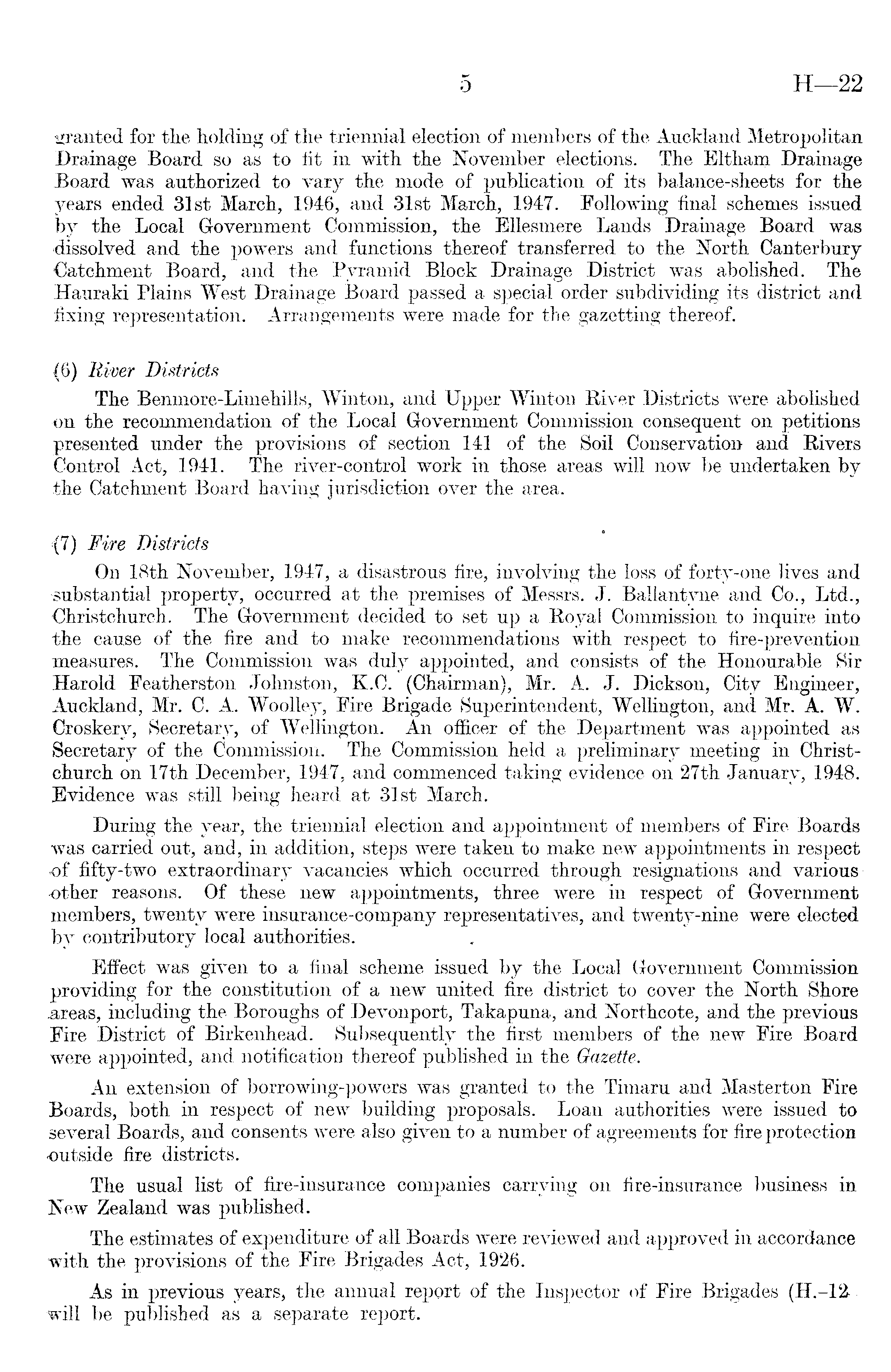 granted for the holding of the triennial election of members of the Auckland Metropolitan Drainage Board so as to fit in with the November elections. The Eltham Drainage Board was authorized to vary the mode of publication of its balance-sheets for the years ended 31st March, 1946, and 31st March, 1947. Following final schemes issued by the Local Government Commission, the Ellesmere Lands Drainage Board was dissolved and the powers and functions thereof transferred to the North Canterbury Catchment Board, and the Pyramid Block Drainage District was abolished. The Hauraki Plains West Drainage Board passed a special order subdividing its district and fixing representation. Arrangements were made for the gazetting thereof. (6) River Districts The Benmore-Limehills, Winton, and Upper Winton River Districts were abolished on the recommendation of the Local Government Commission consequent on petitions presented under the provisions of section 141 of the Soil Conservation and Rivers Control Act, 1941.. The river-control work in those areas will now be undertaken by the Catchment Board having jurisdiction over the area. {!) Fire Districts On 18th November, 1947, a disastrous fire, involving the loss of forty-one lives and •substantial property, occurred at the premises of Messrs. J. Bailantyne and Co., Ltd., Christchurch. The Government decided to set up a Royal Commission to inquire into the cause of the fire and to make recommendations with respect to fire-prevention measures. The Commission was duly appointed, and consists of the Honourable Sir Harold Featherston Johnston, K.C. (Chairman), Mr. A. J. Dickson, City Engineer, Auckland, Mr. C. A. Woolley, Fire Brigade Superintendent, Wellington, and Mr. A. W. Croskerv, Secretary, of Wellington. An officer of the Department was appointed as Secretary of the Commission. The Commission held a preliminary meeting in Christchurch on 17th December, 1947, and commenced taking evidence on 27th January, 1948. Evidence was still being heard at 31st March. During the year, the triennial election and appointment of members of Fire Boards was carried out, and, in addition, steps were taken to make new appointments in respect •of fifty-two extraordinary vacancies which occurred through resignations and various other reasons. Of these new appointments, three were in respect of Government members, twenty were insurance-company representatives, and twenty-nine were elected by contributory local authorities. Effect was given to a final scheme issued by the Local Government Commission providing for the constitution of a new united fire district to cover the North Shore .areas, including the Boroughs of Devonport, Takapuna, and Northcote, and the previous Fire District of Birkenhead. Subsequently the first members of the new Fire Board were appointed, and notification thereof published in the Gazette. An extension of borrowing-powers was granted to the Timaru and Masterton Fire Boards, both in respect of new building proposals. Loan authorities were issued to several Boards, and consents were a lso given to a number of agreements for fire protection •outside fire districts. The usual list of fire-insurance companies carrying on fire-insurance business in New Zealand was published. The estimates of expenditure of all Boards were reviewed and approved in accordance with the provisions of the Fire Brigades Act, 1926. As in previous years, the annual report of the Inspector of Fire Brigades (H.-12 will be published as a separate report.