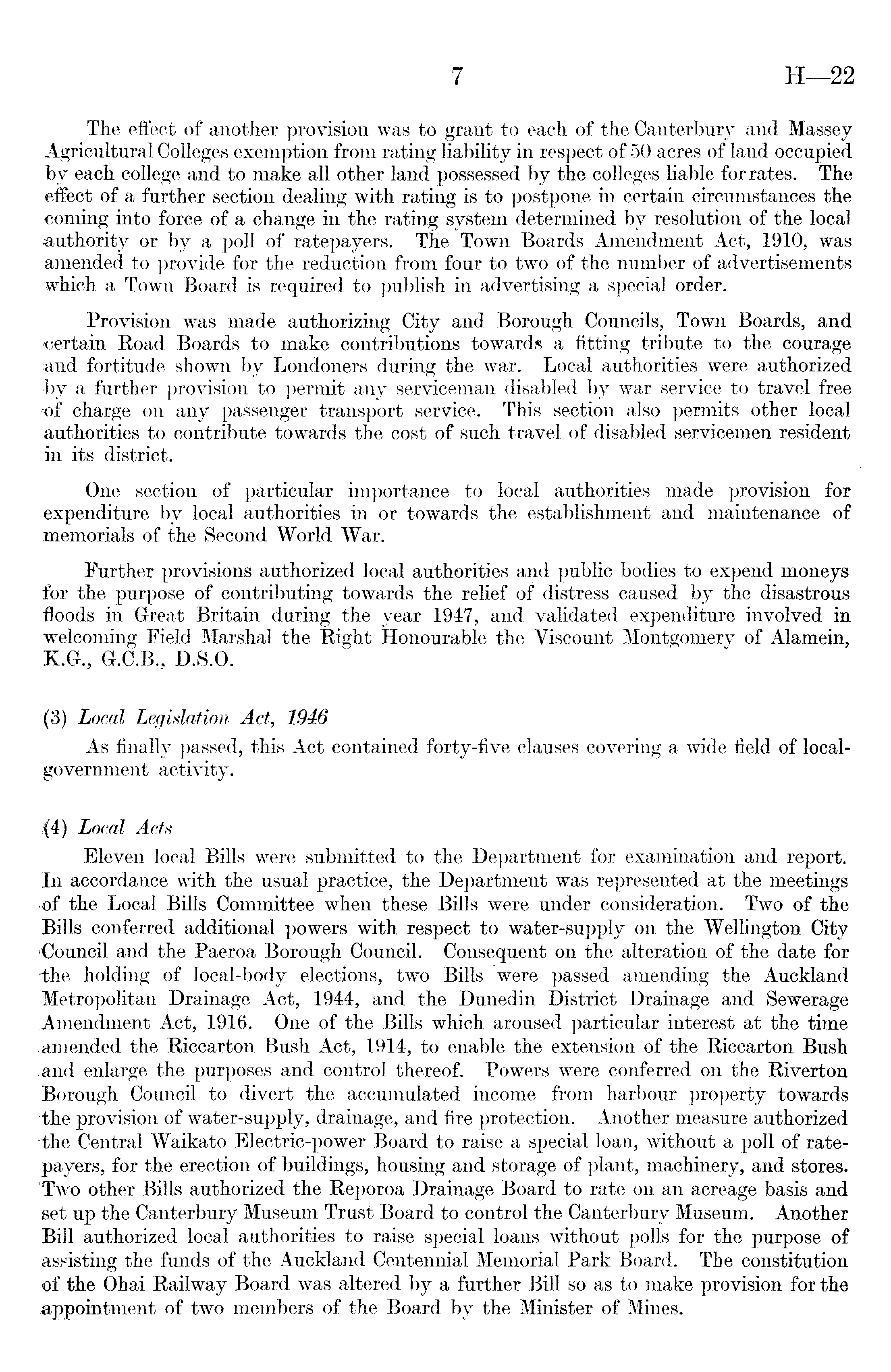 The effect of another provision was to grant to each of the Canterbury and Massey Agricultural Colleges exemption from rating liability in respect of 50 acres of land occupied by each college and to make all other land possessed by the colleges liable for rates. The effect of a further section dealing with rating is to postpone in certain circumstances the coming into force of a change in the rating system determined by resolution of the local authority or by a poll of ratepayers. The Town Boards Amendment Act, 1910, was amended to provide for the reduction from four to two of the number of advertisements which a Town Board is required to publish in advertising a special order. Provision was made authorizing City and Borough Councils, Town Boards, and -certain Road Boards to make contributions towards a fitting tribute to the courage and fortitude shown by Londoners during the war. Local authorities were authorized by a further provision to permit any serviceman disabled by war service to travel free of charge on any passenger transport service. This section also permits other local authorities to contribute towards the cost of such travel of disabled servicemen resident in its district. One section of particular importance to local authorities made provision for expenditure by local authorities in or towards the establishment and maintenance of memorials of the Second World War. Further provisions authorized local authorities and public bodies to expend moneys for the purpose of contributing towards the relief of distress caused by the disastrous floods in Great Britain during the year 1947, and validated expenditure involved in welcoming Field Marshal the Right Honourable the Viscount Montgomery of Alamein, KG., G.C.8., D.S.O. (3) Local Legislation Act, 1946 As finally passed, this Act contained forty-five clauses covering a wide field of localgovernment activity. (4) Local Acts Eleven local Bills were submitted to the Department for examination and report. In accordance with the usual practice, the Department was represented at the meetings of the Local Bills Committee when these Bills were under consideration. Two of the Bills conferred additional powers with respect to water-supply on the Wellington City 'Council and the Paeroa Borough Council. Consequent on the alteration of the date for -the holding of local-body elections, two Bills were passed amending the Auckland Metropolitan Drainage Act, 1944, and the Dunedin District Drainage and Sewerage Amendment Act, 1916. One of the Bills which aroused particular interest at the time amended the Riccarton Bush Act, 1914, to enable the extension of the Riccarton Bush and enlarge the purposes and control thereof. Powers were conferred on the Riverton Borough Council to divert the accumulated income from harbour property towards the provision of water-supply, drainage, and fire protection. Another measure authorized the Central Waikato Electric-power Board to raise a special loan, without a poll of ratepayers, for the erection of buildings, housing and storage of plant, machinery, and stores. Two other Bills authorized the Reporoa Drainage Board to rate on an acreage basis and set up the Canterbury Museum Trust Board to control the Canterbury Museum. Another Bill authorized local authorities to raise special loans without polls for the purpose of assisting the funds of the Auckland Centennial Memorial Park Board. The constitution of the Ohai Railway Board was altered by a further Bill so as to make provision for the appointment of two members of the Board by the Minister of Mines.