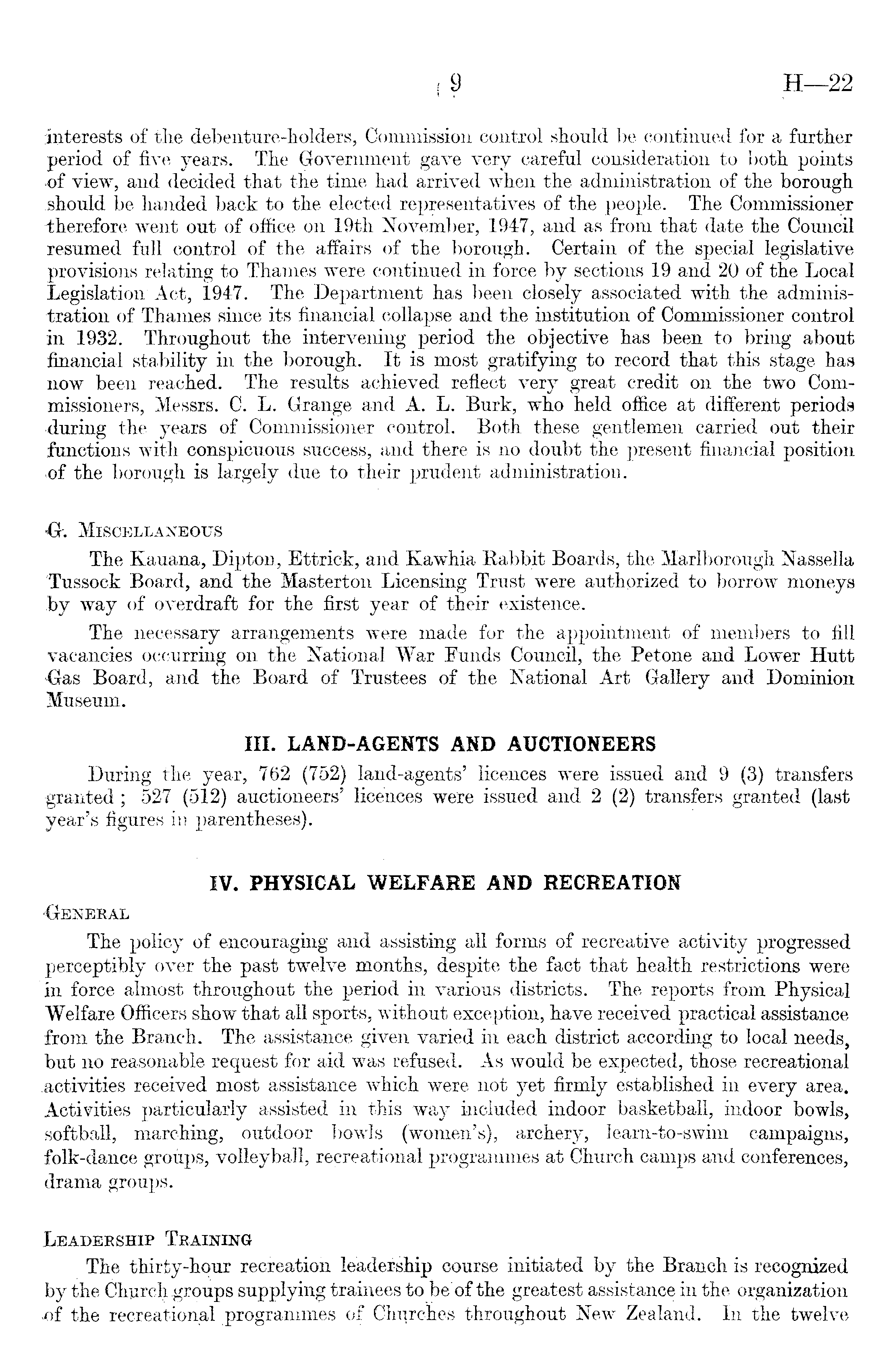 interests of the debenture-holders, Commission control should be continued for a further period of five years. The Government gave very careful consideration to both points of view, and decided that the time had arrived when the administration of the borough should be handed back to the elected representatives of the people. The Commissioner -therefore went out of office on 19th November, 1947, and as from that date the Council resumed full control of the affairs of the borough. Certain of the special legislative provisions relating to Thames were continued in force by sections 19 and 20 of the Local Legislation Act, 1947. The Department has been closely associated with the administration of Thames since its financial collapse and the institution of Commissioner control in 1932. Throughout the intervening period the objective has been to bring about financial stability in the borough. It is most gratifying to record that this stage has now been reached. The results achieved reflect very great credit on the two Commissioners, Messrs. C. L. Grange and A. L. Burk, who held office at different periods •during the years of Commissioner control. Both these gentlemen carried out their functions with conspicuous success, and there is no doubt the present financial position •of the borough is largely due to their prudent administration. <G. Miscellaneous The Kauana, Dipton, Ettrick, and Kawhia Rabbit Boards, the Marlborough Nassella Tussock Board, and the Masterton Licensing Trust were authorized to borrow moneys by way of overdraft for the first year of their existence. The necessary arrangements were made for the appointment of members to fill vacancies occurring on the National War Funds Council, the Petone and Lower Hutt •Gas Board, and the Board of Trustees of the National Art Gallery and Dominion Museum. 111. LAND-AGENTS AND AUCTIONEERS During the year, 762 (752) land-agents' licences were issued and 9 (3) transfers granted; 527 (512) auctioneers' licences were issued and 2 (2) transfers granted (last year's figures in parentheses). IV. PHYSICAL WELFARE AND RECREATION 'General The policy of encouraging and assisting all forms of recreative activity progressed perceptibly over the past twelve months, despite the fact that health restrictions were in force almost throughout the period in various districts. The reports from Physical Welfare Officers show that all sports, without exception, have received practical assistance from the Branch. The assistance given varied in each district according to local needs, but no reasonable request for aid was refused. As would be expected, those recreational Activities received most assistance which were not yet firmly established in every area. Activities particularly assisted in this way included indoor basketball, indoor bowls, softball, marching, outdoor bowls (women's), archery, learn-to-swim campaigns, folk-dance groups, volleyball, recreational programmes at Church camps and conferences, -drama groups. Leadership Training The thirty-hour recreation leadership course initiated by the Branch is recognized by the Church groups supplying trainees to be of the greatest assistance in the organization ■of the recreational programmes of Churches throughout New Zealand. In the twelve