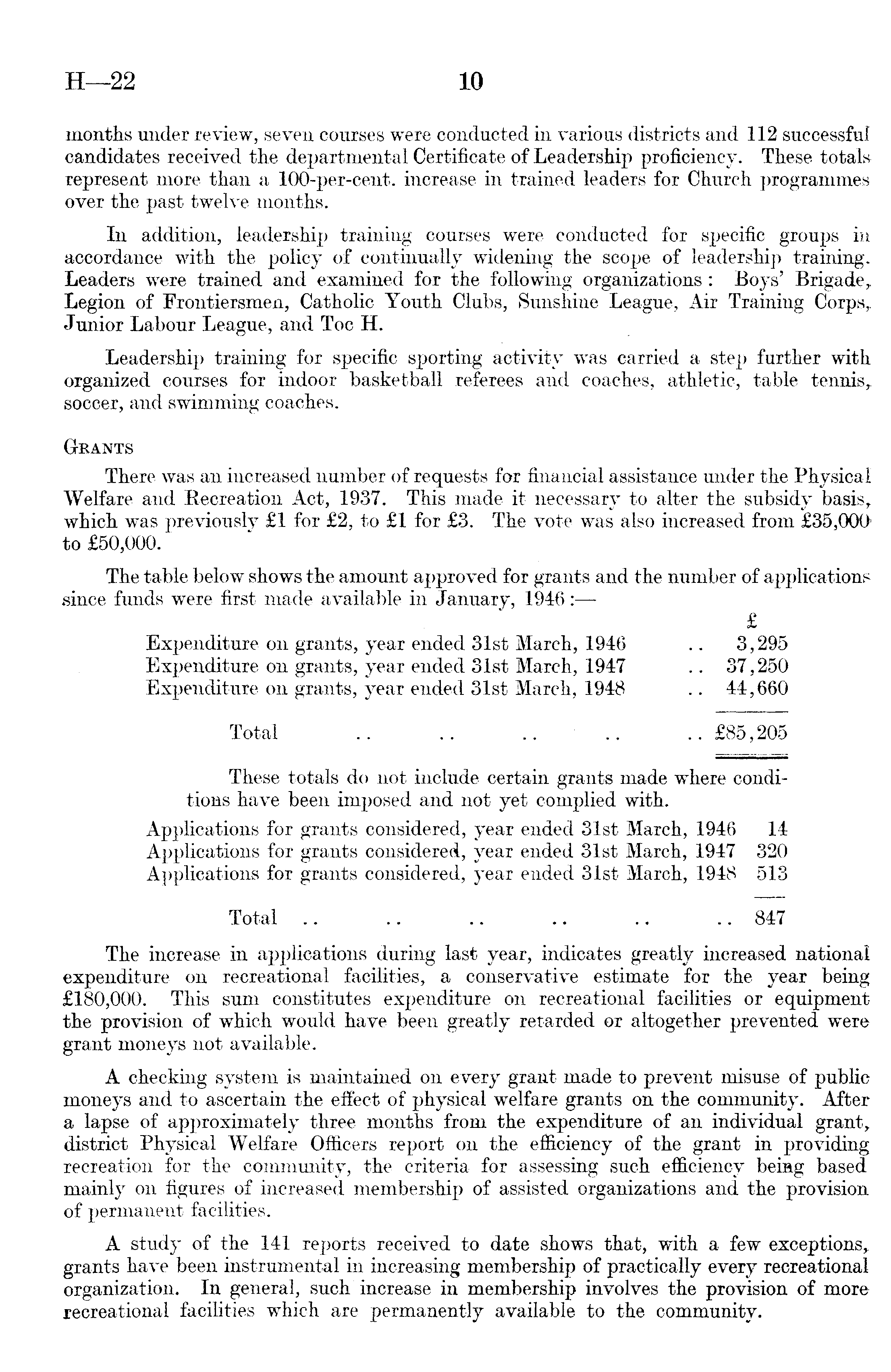 months under review, seven courses were conducted in various districts and 112 successful candidates received the departmental Certificate of Leadership proficiency. These totals represent more than a 100-per-cent. increase in trained leaders for Church programmes over the past twelve months. In addition, leadership training courses were conducted for specific groups in accordance with the policy of continually widening the scope of leadership training. Leaders were trained and examined for the following organizations : Boys' Brigade,. Legion of Frontiersmen, Catholic Youth Clubs, Sunshine League, Air Training Corps,. Junior Labour League, and Toe H. Leadership training for specific sporting activity was carried a step further with organized courses for indoor basketball referees and coaches, athletic, table tennis,, soccer, and swimming coaches. Grants There was an increased number of requests for financial assistance under the Physical Welfare and Recreation Act, 1937. This made it necessary to alter the subsidy basis,, which was previously £1 for £2, to £1 for £3. The vote was also increased from £35,000 to £50,000. The table below shows the amount approved for grants and the number of applications since funds were first made available in January, 1946: — £ Expenditure on grants, year ended 31st March, 1946 .. 3,295 Expenditure on grants, year ended 31st March, 1947 .. 37,250 Expenditure on grants, year ended 31st March, 1948 .. 44,660 Total .. .. .. .. .. £85,205 These totals do not include certain grants made where conditions have been imposed and not yet complied with. Applications for grants considered, year ended 31st March, 1946 14 Applications for grants considered, year ended 31st March, 1947 320 Applications for grants considered, year ended 31st March, 1948 513 Total .. .. .. .. .. .. 847 The increase in applications during last year, indicates greatly increased national expenditure on recreational facilities, a conservative estimate for the year being £lBO,OOO. This sum constitutes expenditure on recreational facilities or equipment the provision of which would have been greatly retarded or altogether prevented were grant moneys not available. A checking system is maintained on every grant made to prevent misuse of public moneys and to ascertain the effect of physical welfare grants on the community. After a lapse of approximately three months from the expenditure of an individual grant, district Physical Welfare Officers report on the efficiency of the grant in providing recreation for the community, the criteria for assessing such efficiency being based mainly on figures of increased membership of assisted organizations and the provision of permanent facilities. A study of the 141 reports received to date shows that, with a few exceptions, grants have been instrumental in increasing membership of practically every recreational organization. In general, such increase in membership involves the provision of more recreational facilities which are permanently available to the community.