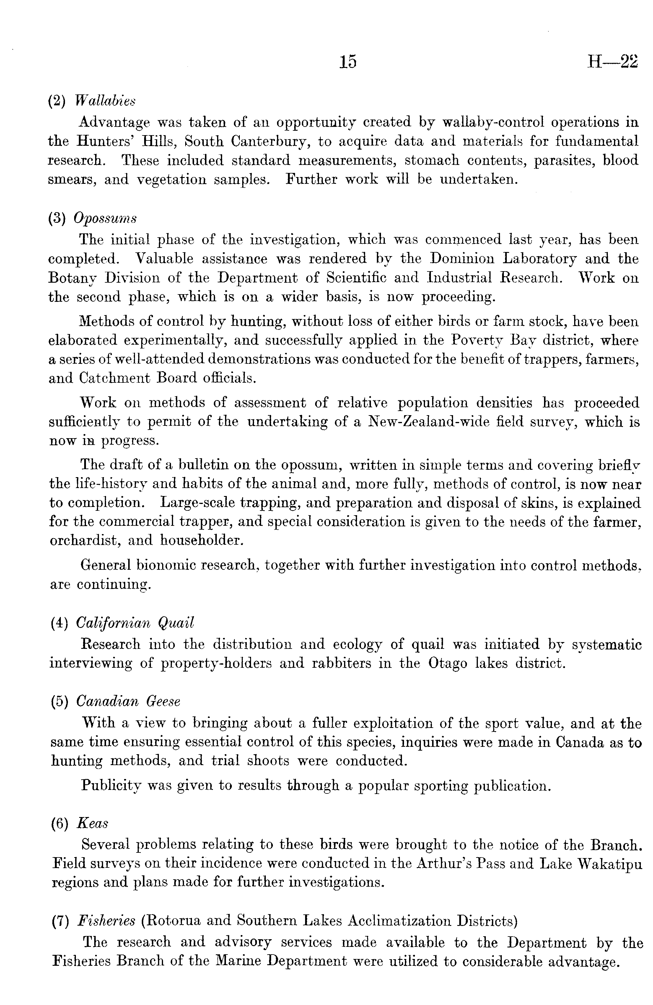 (2) Wallabies Advantage was taken of an opportunity created by wallaby-control operations in the Hunters' Hills, South Canterbury, to acquire data and materials for fundamental research. These included standard measurements, stomach contents, parasites, blood smears, and vegetation samples. Further work will be undertaken. (3) Opossums The initial phase of the investigation, which was commenced last year, has been completed. Valuable assistance was rendered by the Dominion Laboratory and the Botany Division of the Department of Scientific and Industrial Research. Work on the second phase, which is on a wider basis, is now proceeding. Methods of control by hunting, without loss of either birds or farm stock, have been elaborated experimentally, and successfully applied in the Poverty Bay district, where a series of well-attended demonstrations was conducted for the benefit of trappers, farmers, and Catchment Board officials. Work on methods of assessment of relative population densities has proceeded sufficiently to permit of the undertaking of a New-Zealand-wide field survey, which is now in progress. The draft of a bulletin on the opossum, written in simple terms and covering briefly the life-history and habits of the animal and, more fully, methods of control, is now near to completion. Large-scale trapping, and preparation and disposal of skins, is explained for the commercial trapper, and special consideration is given to the needs of the farmer, orchardist, and householder. General bionomic research, together with further investigation into control methods, are continuing. (4) Californian Quail Research into the distribution and ecology of quail was initiated by systematic interviewing of property-holders and rabbiters in the Otago lakes district. (5) Canadian Geese With a view to bringing about a fuller exploitation of the sport value, and at the same time ensuring essential control of this species, inquiries were made in Canada as to hunting methods, and trial shoots were conducted. Publicity was given to results through a popular sporting publication. (6) Keas Several problems relating to these birds were brought to the notice of the Branch. Field surveys on their incidence were conducted in the Arthur's Pass and Lake Wakatipu regions and plans made for further investigations. (7) Fisheries (Rotorua and Southern Lakes Acclimatization Districts) The research and advisory services made available to the Department by the Fisheries Branch of the Marine Department were utilized to considerable advantage.