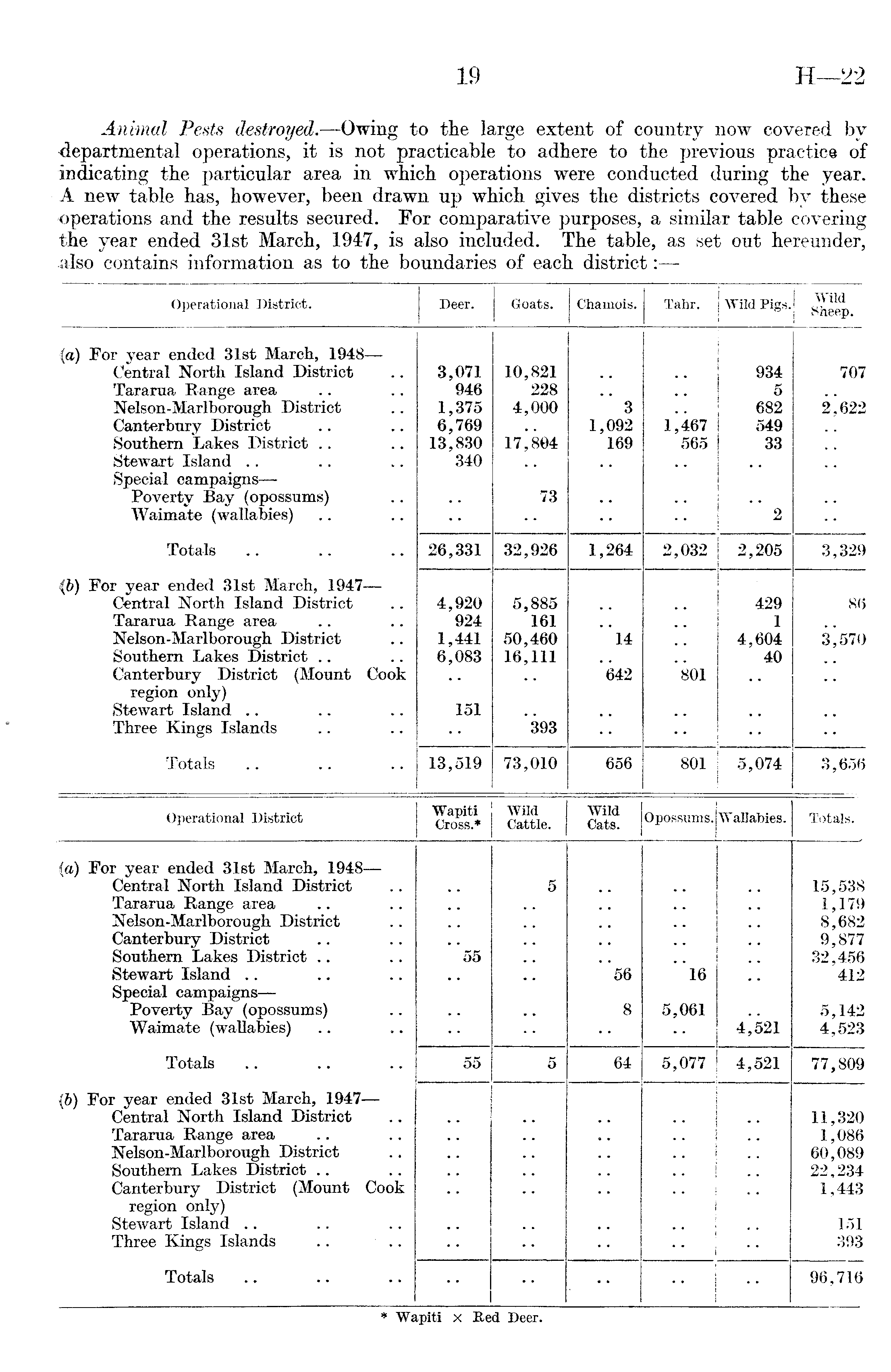 Animal Pests destroyed. —Owing to the large extent of country now covered by •departmental operations, it is not practicable to adhere to the previous practice of indicating the particular area in which operations were conducted during the year. A new table has, however, been drawn up which gives the districts covered by these -operations and the results secured. For comparative purposes, a similar table covering the year ended 31st March, 1947, is also included. The table, as set out hereunder, .also contains information as to the boundaries of each district: —