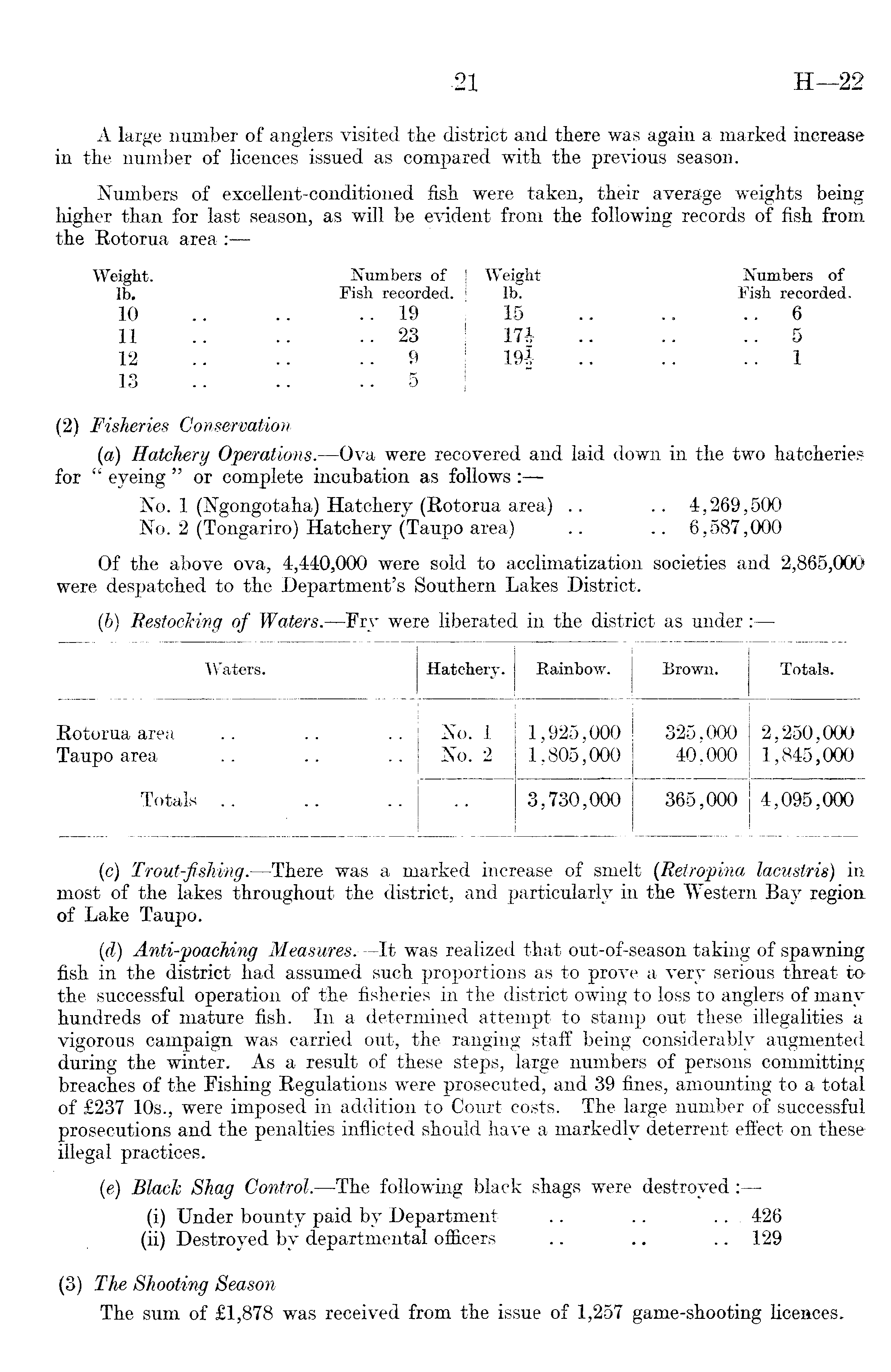 (c) Trout-fishing. —There was a marked increase of smelt (Retropina lacustris) in. most of the lakes throughout the district, and particularly in the Western Bay region of Lake Taupo. (d) Anti-poaching Measures. —It was realized that out-of-season taking of spawning fish in the district had assumed such proportions as to prove a very serious threat to the successful operation of the fisheries in the district owing to loss to anglers of many hundreds of mature fish. In a determined attempt to stamp out these illegalities a vigorous campaign was carried out, the ranging staff being considerably augmented during the winter. As a result of these steps, large numbers of persons committing breaches of the Fishing Regulations were prosecuted, and 39 fines, amounting to a total of £237 10s., were imposed in addition to Court costs. The large number of successful prosecutions and the penalties inflicted should have a markedly deterrent effect on these illegal practices. (e) Black Shag Control. —The following black shags were destroyed:—(i) Under bounty paid by Department .. .. .. 426 (ii) Destroyed by departmental officers .. .. .. 129 (3) The Shooting Season The sum of £1,878 was received from the issue of 1,257 game-shooting licences.