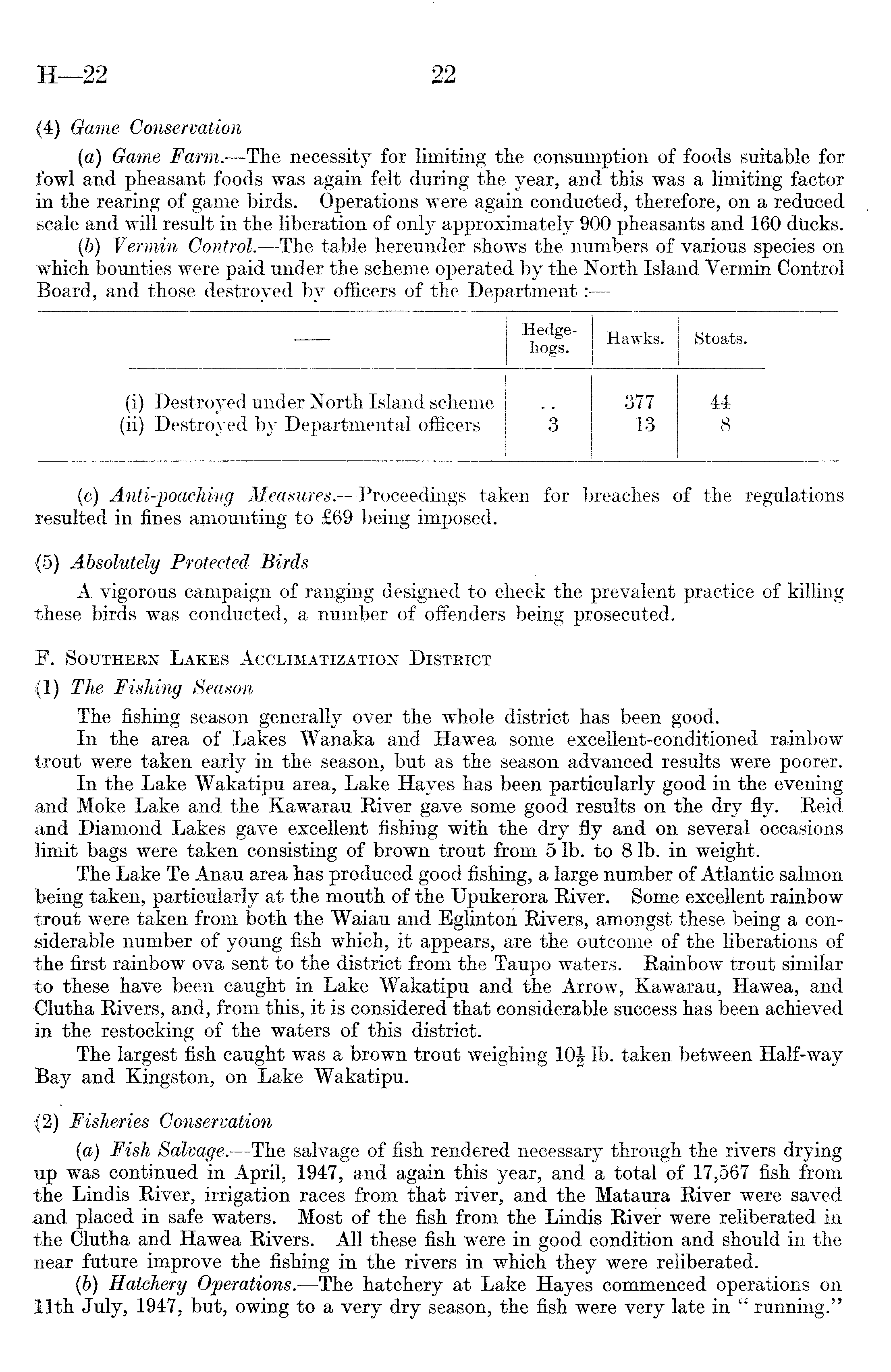 (c) Anti-Coaching Measures.—Proceedings taken for breaches of the regulations resulted in fines amounting to £69 being imposed. (5) Absolutely Protected Birds A vigorous campaign of ranging designed to check the prevalent practice of killing these birds was conducted, a number of offenders being prosecuted. i\ Southern Lakes Acclimatization District (1) The Fishing Season The fishing season generally over the whole district has been good. In the area of Lakes Wanaka and Hawea some excellent-conditioned rainbow trout were taken early in the season, but as the season advanced results were poorer. In the Lake Wakatipu area, Lake Hayes has been particularly good in the evening and Moke Lake and the Kawarau River gave some good results on the dry fly. Reid and Diamond Lakes gave excellent fishing with the dry fly and on several occasions limit bags were taken consisting of brown trout from 5 lb. to 8 lb. in weight. The Lake Te Anau area has produced good fishing, a large number of Atlantic salmon being taken, particularly at the mouth of the Upukerora River. Some excellent rainbow trout were taken from both the Waiau and Eglmton Rivers, amongst these being a considerable number of young fish which, it appears, are the outcome of the liberations of the first rainbow ova sent to the district from the Taupo waters. Rainbow trout similar to these have been caught in Lake Wakatipu and the Arrow, Kawarau, Hawea, and Clutha Rivers, and, from this, it is considered that considerable success has been achieved in the restocking of the waters of this district. The largest fish caught was a brown trout weighing 10| lb. taken between Half-way Bay and Kingston, on Lake Wakatipu. (2) Fisheries Conservation {a) Fish Salvage.—The salvage of fish rendered necessary through the rivers drying up was continued in April, 1947, and again this year, and a total of 17,567 fish from the Lindis River, irrigation races from that river, and the Mataura River were saved and placed in safe waters. Most of the fish from the Lindis River were reliberated in the Clutha and Hawea Rivers. All these fish were in good condition and should in the near future improve the fishing in the rivers in which they were reliberated. (b) Hatchery Operations.—The hatchery at Lake Hayes commenced operations on 11th July, 1947, but, owing to a very dry season, the fish were very late in " running."