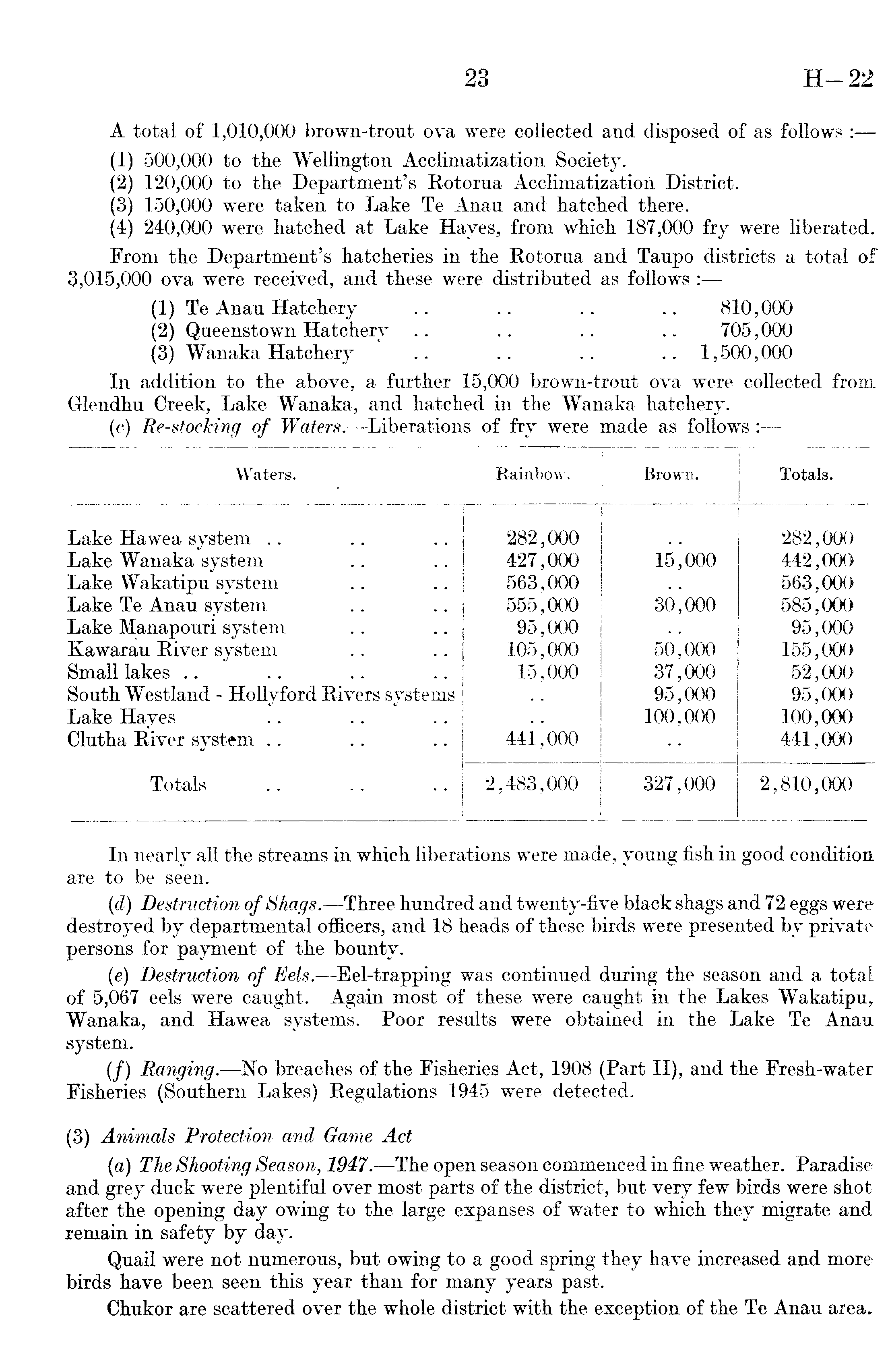 In nearly all the streams in which liberations were made, young fish in good condition are to be seen. (d) Destruction of Shags. —Three hundred and twenty-five black shags and 72 eggs were destroyed by departmental officers, and 18 heads of these birds were presented by private persons for payment of the bounty. (e) Destruction of Eels. —Eel-trapping was continued during the season and a total of 5,067 eels were caught. Again most of these were caught in the Lakes Wakatipu, Wanaka, and Hawea systems. Poor results were obtained in the Lake Te Anau system. (/) Ranging. —No breaches of the Fisheries Act, 1908 (Part II), and the Fresh-water Fisheries (Southern Lakes) Regulations 1945 were detected. (3) Animals Protection and Game Act (a) The Shooting Season, 1947. —The open season commenced in fine weather. Paradise and grey duck were plentiful over most parts of the district, but very few birds were shot after the opening day owing to the large expanses of water to which they migrate and remain in safety by day. Quail were not numerous, but owing to a good spring they have increased and more birds have been seen this year than for many years past. Chukor are scattered over the whole district with the exception of the Te Anau area.