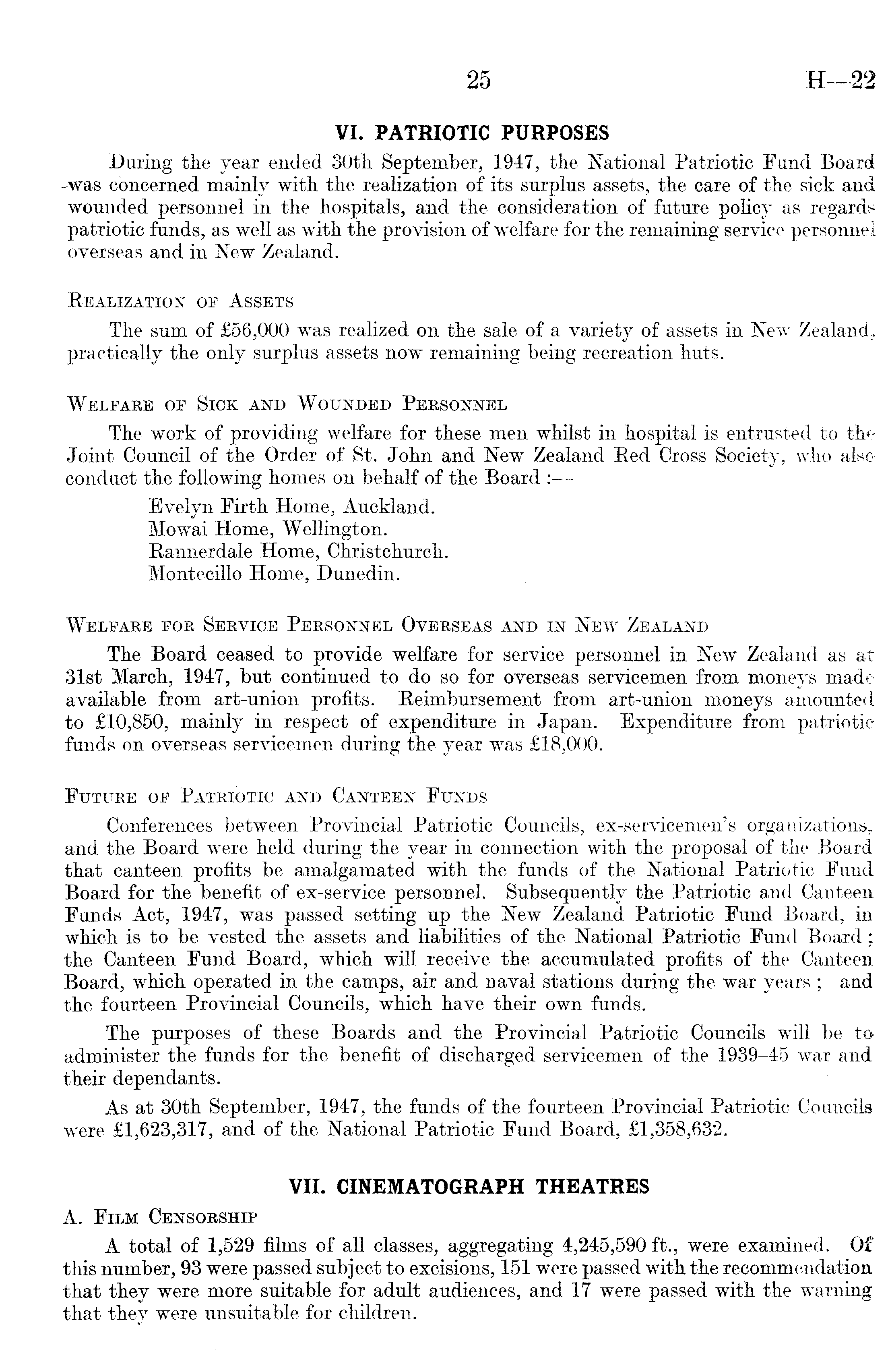 VI. PATRIOTIC PURPOSES During the year ended 30tli September, 1947, the National Patriotic Fund Board -was concerned mainly with the realization of its surplus assets, the care of the sick and wounded personnel in the hospitals, and the consideration of future policy as regards patriotic funds, as well as with the provision of welfare for the remaining service personnel overseas and in New Zealand. Realization of Assets The sum of £56,000 was realized on the sale of a variety of assets in New Zealand, practically the only surplus assets now remaining being recreation huts. Welfare of Sick and Wounded Personnel The work of providing welfare for these men whilst in hospital is entrusted to the Joint Council of the Order of St. John and New Zealand Red Cross Society, who also conduct the following homes on behalf of the Board : Evelyn Firth Home, Auckland. Mowai Home, Wellington. Rannerdale Home, Christchurch. Montecillo Home, Dunedin. Welfare for Service Personnel Overseas and in New Zealand The Board ceased to provide welfare for service personnel in New Zealand as at 31st March, 1947, but continued to do so for overseas servicemen from moneys made available from art-union profits. Reimbursement from art-union moneys amounted to £10,850, mainly in respect of expenditure in Japan. Expenditure from patriotic funds on overseas servicemen during the year was £lB,OOO. Future of Patriotic and Canteen Funds Conferences between Provincial Patriotic Councils, ex-servicemen's organizations, and the Board were held during the year in connection with the proposal of the Board that canteen profits be amalgamated with the funds of the National Patriotic Fund Board for the benefit of ex-service personnel. Subsequently the Patriotic and Canteen Funds Act, 1947, was passed setting up the New Zealand Patriotic Fund Board, in which is to be vested the assets and liabilities of the National Patriotic Fund Board; the Canteen Fund Board, which will receive the accumulated profits of the Canteen Board, which operated in the camps, air and naval stations during the war years ; and the fourteen Provincial Councils, which have their own funds. The purposes of these Boards and the Provincial Patriotic Councils will be to administer the funds for the benefit of discharged servicemen of the 1939-45 war and their dependants. As at 30th September, 1947, the funds of the fourteen Provincial Patriotic Councils were £1,623,317, and of the National Patriotic Fund Board, £1,358,632. VII. CINEMATOGRAPH THEATRES A. Film Censorship A total of 1,529 films of all classes, aggregating 4,245,590 ft., were examined. Of this number, 93 were passed subject to excisions, 151 were passed with the recommendation that they were more suitable for adult audiences, and 17 were passed with the warning that they were unsuitable for children.