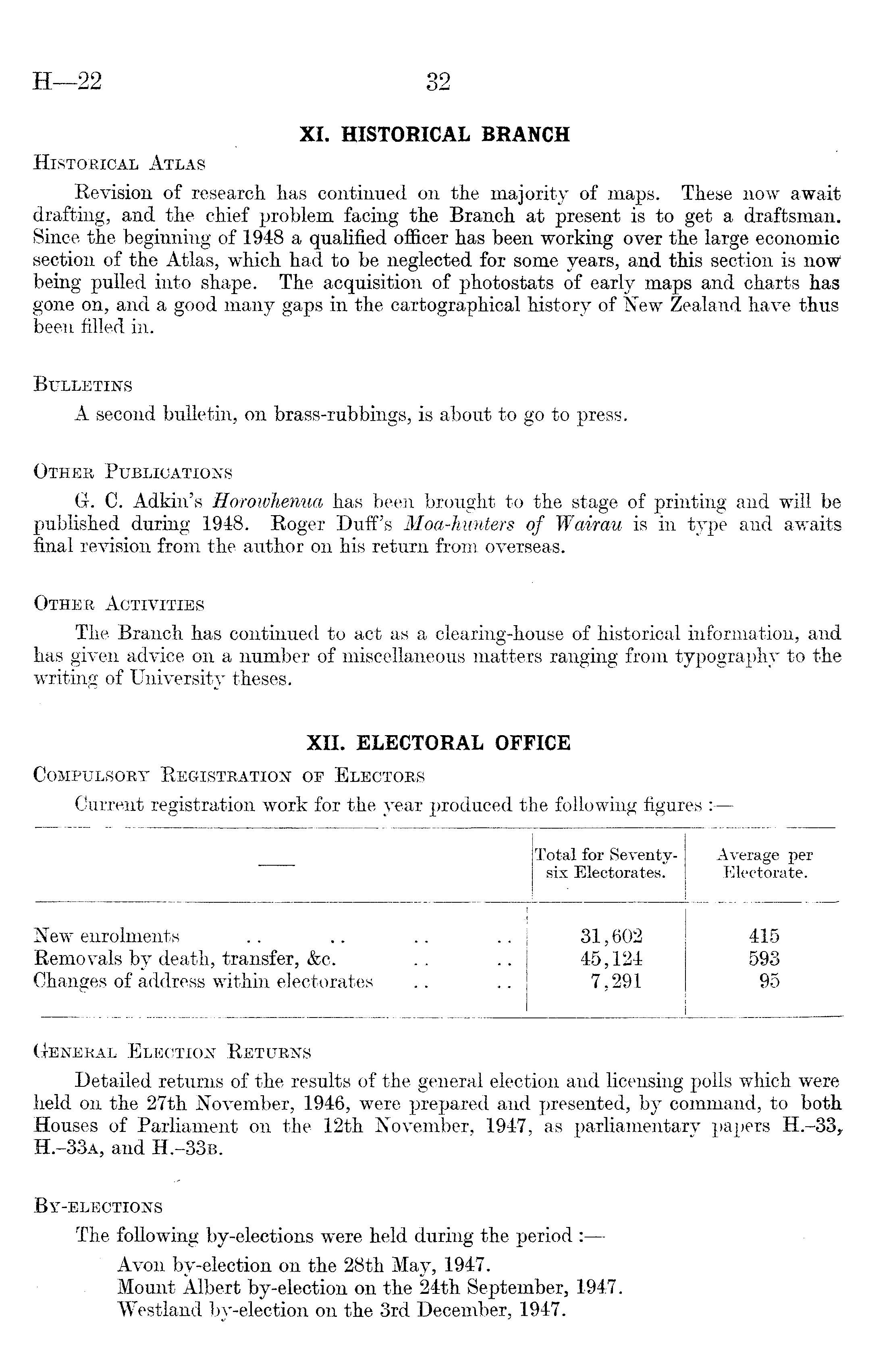 XI. HISTORICAL BRANCH Historical Atlas Revision of research, has continued on the majority of maps. These now await drafting, and the chief problem facing the Branch at present is to get a draftsman. Since the beginning of 1948 a qualified officer has been working over the large economic section of the Atlas, which had to be neglected for some years, and this section is now being pulled into shape. The acquisition of photostats of early maps and charts has gone on, and a good many gaps in the cartographical history of Few Zealand have thus been filled in. Bulletins A second bulletin, on brass-rubbings, is about to go to press. Other Publications G. C. Adkin's Horoivhenua has been brought to the stage of printing and will be published during 1948. Roger Duff's Moa-hunters of Wairau is in type and awaits final revision from the author on his return from overseas. Other Activities The Branch has continued to act as a clearing-house of historical information, and has given advice on a number of miscellaneous matters ranging from typography to the writing of University theses. XII. ELECTORAL OFFICE Compulsory Registration oe Electors Current registration work for the year produced the following figures :