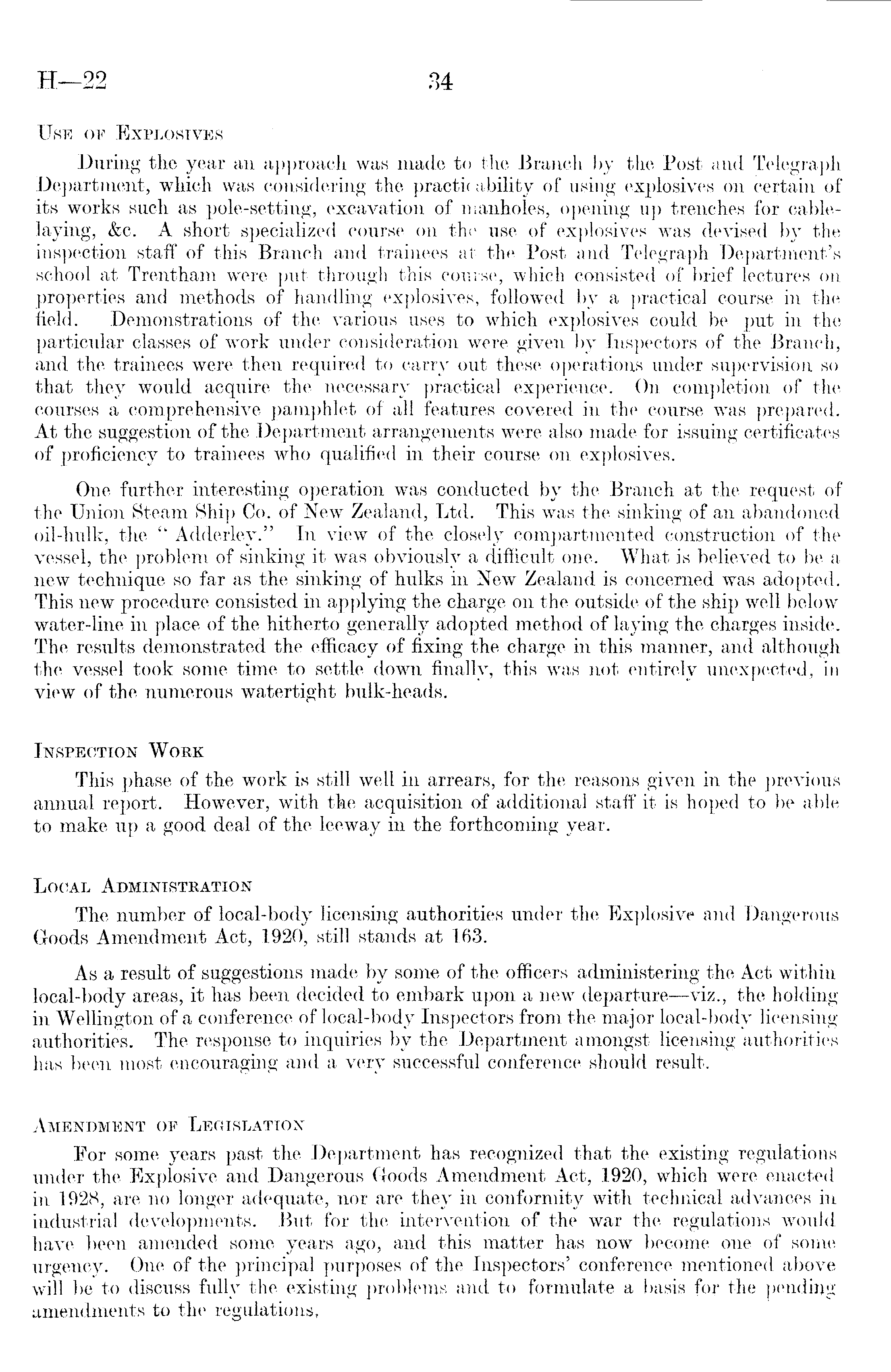 Use of Explosives During the year an approach was made to the Branch by the Post and Telegraph Department, which was considering the practicability of using explosives on certain of its works such as pole-setting, excavation of manholes, opening up trenches for cablelaying, &c. A short specialized course on the use of explosives was devised by the inspection staff of this Branch and trainees at the Post and Telegraph Department's school at Trentham were put through this course, which consisted of brief lectures on properties and methods of handling explosives, followed by a practical course in the field. Demonstrations of the various uses to which explosives could be put in the particular classes of work under consideration were given by Inspectors of the Branch, and the trainees were then required to carry out these operations under supervision so that they would acquire the necessary practical experience. On completion of the courses a comprehensive pamphlet of all features covered in the course was prepared. At the suggestion of the Department arrangements were also made for issuing certificates of proficiency to trainees who qualified in their course on explosives. One further interesting operation was conducted by the Branch at the. request of the Union Steam Ship Co. of New Zealand, Ltd. This was the sinking of an abandoned oil-hulk, the " Adderlev." In view of the closely compartmented construction of the vessel, the problem of sinking it was obviously a difficult one. What is believed to be a new technique so far as the sinking of hulks in New Zealand is concerned was adopted. This new procedure consisted in applying the charge on the outside of the ship well below water-line in place of the hitherto generally adopted method of laying the charges inside. The results demonstrated the efficacy of fixing the charge in this manner, and although the vessel took some time to settle down finally, this was not entirely unexpected, in view of the numerous watertight bulk-heads. Inspection Work This phase of the work is still well in arrears, for the reasons given in the previous annual report. However, with the acquisition of additional staff it is hoped to be able to make up a good deal of the leeway in the forthcoming year. Local Administration The number of local-body licensing authorities under the Explosive and Dangerous Goods Amendment Act, 1920, still stands at 163. As a result of suggestions made by some of the officers administering the Act within local-body areas, it has been decided to embark upon a new departure —viz., the holding in Wellington of a conference of local-body Inspectors from the major local-body licensing authorities. The response to inquiries by the Department amongst licensing authorities has been most encouraging and a very successful conference should result. Amendment of Legislation For some years past the Department has recognized that the existing regulations under the Explosive and Dangerous Goods Amendment Act, 1920, which were enacted in 1928, are no longer adequate, nor are they in conformity with technical advances in industrial developments. But for the intervention of the war the regulations would have been amended some years ago, and this matter has now become one of some urgency. One of the principal purposes of the Inspectors' conference mentioned above will be to discuss fully the existing problems and to formulate a basis for the pending amendments to the regulations.