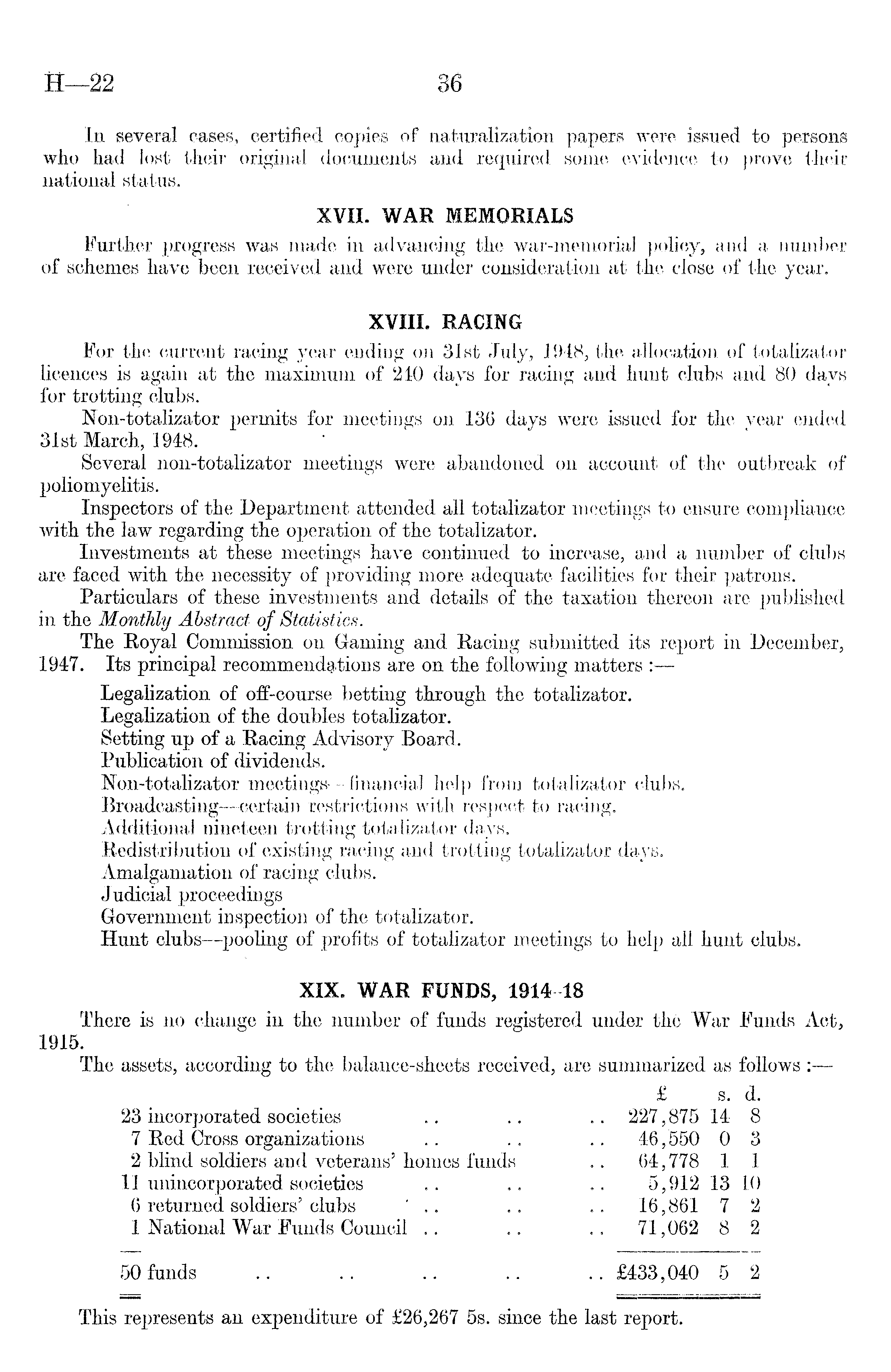In several cases, certified copies of naturalization papers were issued to persons who had lost their original documents and required some evidence to prove their national status. XVII. WAR MEMORIALS Further progress was made in advancing the war-memorial policy, and a number of schemes have been received and were under consideration at the close of the year. XVIII. RACING For the current racing year ending on 31st July, 1948, the allocation of totalizator licences is again at the maximum of 240 days for racing and hunt clubs and 80 days for trotting clubs. Non-totalizator permits for meetings on 136 days were issued for the year ended 31st March, 1948. Several non-totalizator meetings were abandoned on account of the outbreak of poliomyelitis. Inspectors of the Department attended all totalizator meetings to ensure compliance with the law regarding the operation of the totalizator. Investments at these meetings have continued to increase, and a number of clubs are faced with the necessity of providing more adequate facilities for their patrons. Particulars of these investments and details of the taxation thereon are published in the Monthly Abstract of Statistics. The Royal Commission on Gaming and Racing submitted its report in December, 1947. Its principal recommendations are on the following matters : Legalization of off-course betting through the totalizator. Legalization of the doubles totalizator. Setting up of a Racing Advisory Board. Publication of dividends. Non-totalizator meetings—financial help from totalizator clubs. Broadcasting—certain restrictions with respect to racing. Additional nineteen trotting totalizator days. Redistribution of existing racing and trotting totalizator days. Amalgamation of racing clubs. Judicial proceedings Government inspection of the totalizator. Hunt clubs —pooling of profits of totalizator meetings to help all hunt clubs. XIX. WAR FUNDS, 1914 18 There is no change in the number of funds registered under the War Funds Act, 1915. The assets, according to the balance-sheets received, are summarized as follows : £ s. d. 23 incorporated societies .. .. .. 227,875 14 8 7 Red Cross organizations .. .. .. 46,550 0 3 2 blind soldiers and veterans'homes funds .. 64,778 1 1 11 unincorporated societies .. .. .. 5,9121310 6 returned soldiers'clubs '.. .. .. 16,861 7 2 I National War Funds Council .. .. .. 71,062 8 2 50 funds .. .. .. .. .. £433,040 5 2 This represents an expenditure of £26,267 ss. since the last report.