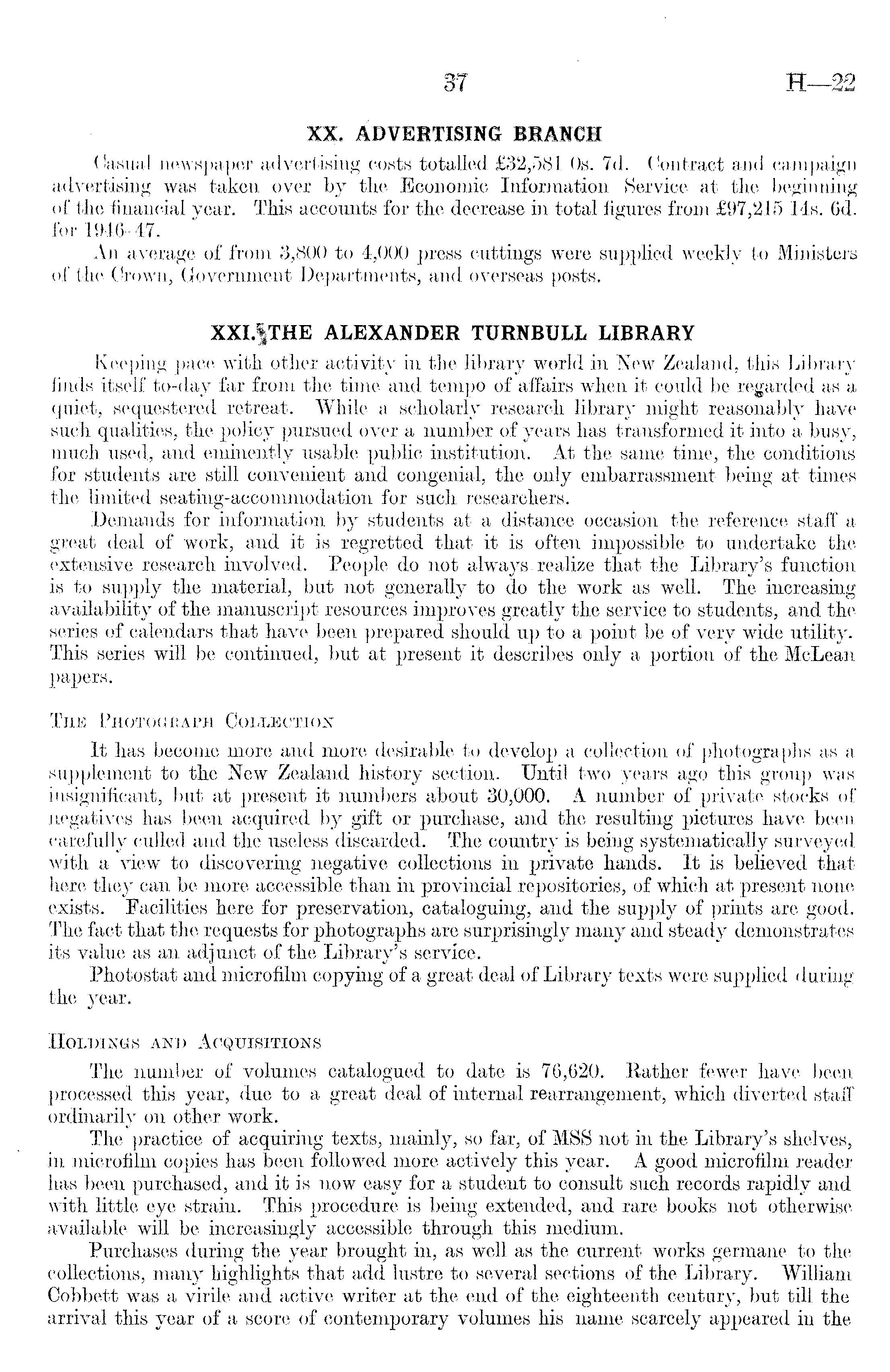 XX. ADVERTISING BRANCH Casual newspaper advertising costs totalled £32,581 Os. 7d. Contract and campaign advertising was taken over by the Economic Information Service at tlie beginning of the financial year. This accounts for the decrease in total figures from £97,215 14s. 6d. for 1946-47. An average of from 3,800 to 4,000 press cuttings were supplied weekly to Ministers of the Crown, Government Departments, and overseas posts. XXI.|THE ALEXANDER TURNBULL LIBRARY Keeping pace with other activity in the library world in New Zealand, this Library finds itself to-day far from the time and tempo of affairs when it could be regarded as a quiet, sequestered retreat. While a scholarly research library might reasonably have such qualities, the policy pursued over a number of years has transformed it into a busy, much used, and eminently usable public institution. At the same time, the conditions for students are still convenient and congenial, the only embarrassment being at times the limited seating-accommodation for such researchers. Demands for information by students at a distance occasion the reference staff a great deal of work, and it is regretted that it is often impossible to undertake the extensive research involved. People do not always realize that the Library's function is to supply the material, but not generally to do the work as well. The increasing availability of the manuscript resources improves greatly the service to students, and the series of calendars that have been prepared should up to a point be of very wide utility. This series will be continued, but at present it describes only a portion of the McLean papers. The Photograph Collection It has become more and more desirable to develop a collection of photographs as a supplement to the New Zealand history section. Until two years ago this group was insignificant, but at present it numbers about 30,000. A number of private stocks of negatives has been acquired by gift or purchase, and the resulting pictures have been carefully culled and the useless discarded. The country is being systematically surveyed with a view to discovering negative collections in private hands. It is believed that here they can be more accessible than in provincial repositories, of which at present none exists. Facilities here for preservation, cataloguing, and the supply of prints are good. The fact that the requests for photographs are surprisingly many and steady demonstrates its value as an. adjunct of the Library's service. Photostat and microfilm copying of a great deal of Library texts were supplied during the year. Holdings and Acquisitions The number of volumes catalogued to date is 76,620. Rather fewer have been processed this year, due to a great deal of internal rearrangement, which diverted staff ordinarily on other work. The practice of acquiring texts, mainly, so far, of MSS not in the Library's shelves, in microfilm copies has been followed more actively this year. A good microfilm reader has been purchased, and it is now easy for a student to consult such records rapidly and with little eye strain. This procedure is being extended, and rare books not otherwise available will be increasingly accessible through this medium. Purchases during the year brought in, as well as the current works germane to the collections, many highlights that add lustre to several sections of the Library. William Cobbett was a virile and active writer at the end of the eighteenth century, but till the arrival this year of a score of contemporary volumes his name scarcely appeared in the