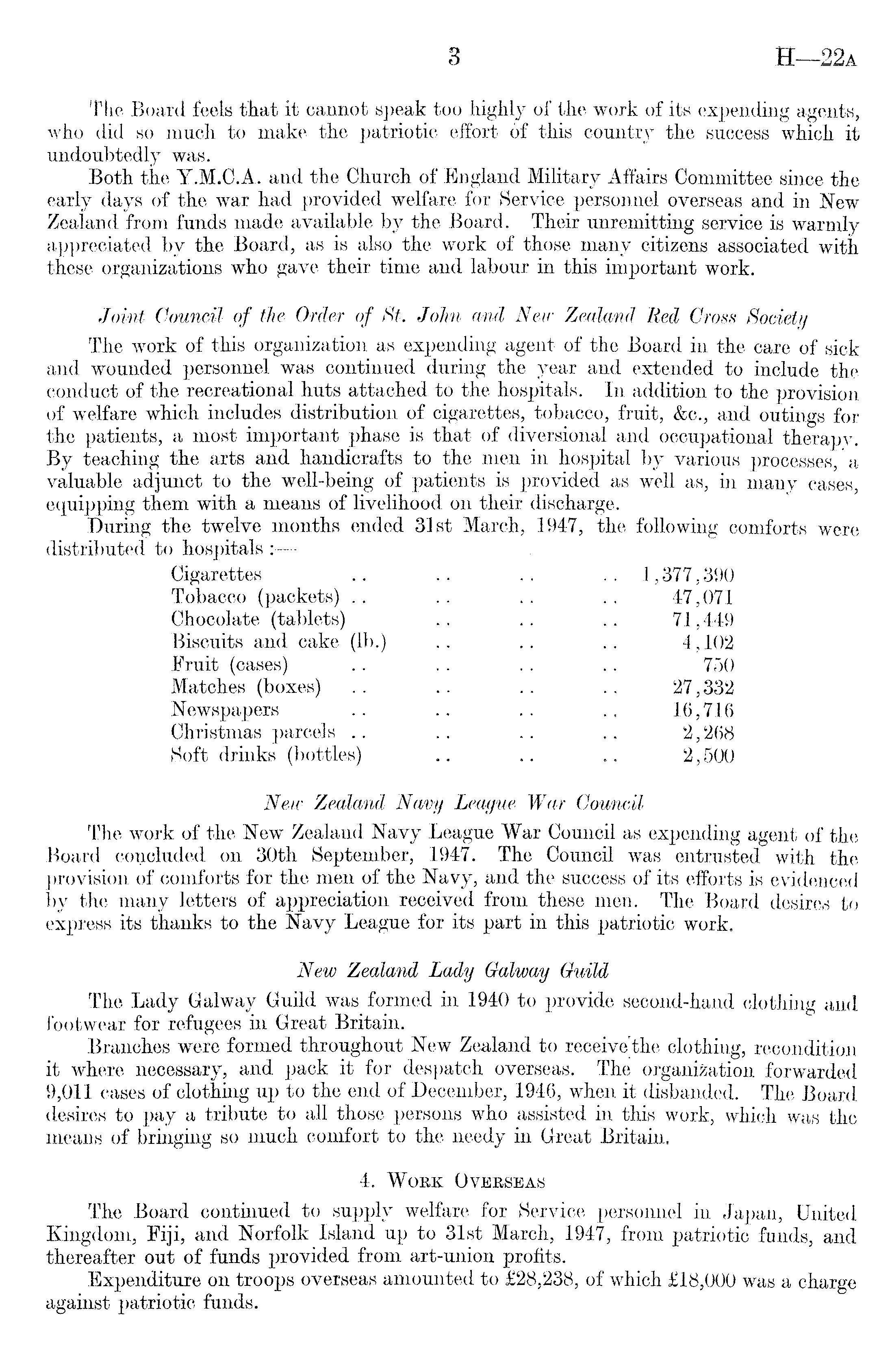 The Board feels that it cannot speak too highly of the work of its expending agents, who did so much to make the patriotic effort of this country the success which it undoubtedly was. Both the Y.M.C.A. and the Church of England Military Affairs Committee since the early days of the war had provided welfare for Service personnel overseas and in New Zealand from funds made available by the Board. Their unremitting service is warmly appreciated by the Board, as is also the work of those many citizens associated with these organizations who gave their time and labour in this important work. Joint Council of the Order of St. John and New Zealand Red Cross Society The work of this organization as expending agent of the Board in the care of sick and wounded personnel was continued during the year and extended to include the conduct of the recreational huts attached to the hospitals. In addition to the provision of welfare which includes distribution of cigarettes, tobacco, fruit, &c, and outings for the patients, a most important phase is that of diversional and occupational therapy. By teaching the arts and handicrafts to the men in hospital by various processes, a valuable adjunct to the well-being of patients is provided as well as, in many cases, equipping them with a means of livelihood on their discharge. During the twelve months ended 31st March, 194.7, the following comforts were distributed to hospitals : Cigarettes .. .. .. ..1,377,390 Tobacco (packets) .. .. .. .. 47,071 Chocolate (tablets) .. .. .. 71,449 Biscuits and cake (lb.) .. .. .. 4,102 Fruit (cases) . . .. . . . . 750 Matches (boxes) .. .. .. .. 27,332 Newspapers .. .. .. .. 16,716 Christmas parcels .. .. .. .. 2,268 Soft drinks (bottles) .. .. .. 2,500 New Zealand Navy League War Council The work of the New Zealand Navy League War Council as expending agent of the Board concluded on 30th September, 1947. The Council was entrusted with the provision of comforts for the men of the Navy, and the success of its efforts is evidenced by the many letters of appreciation received from these men. The Board desires to express its thanks to the Navy League for its part in this patriotic work. New Zealand Lady Galway Guild The Lady Galway Guild was formed in 1940 to provide second-hand clothing and footwear for refugees in Great Britain. Branches were formed throughout New Zealand to receive'the clothing, recondition it where necessary, and pack it for despatch overseas. The organization forwarded 9,011 cases of clothing up to the end of December, 1946, when it disbanded. The Board desires to pay a tribute to all those persons who assisted in this work, which was the means of bringing so much comfort to the needy in Great Britain. 4. Work Overseas The Board continued to supply welfare for Service personnel in Japan, United Kingdom, Fiji, and Norfolk Island up to 31st March, 1947, from patriotic funds, and thereafter out of funds provided from art-union profits. Expenditure on troops overseas amounted to £28,238, of which £lB,OOO was a charge against patriotic funds.
