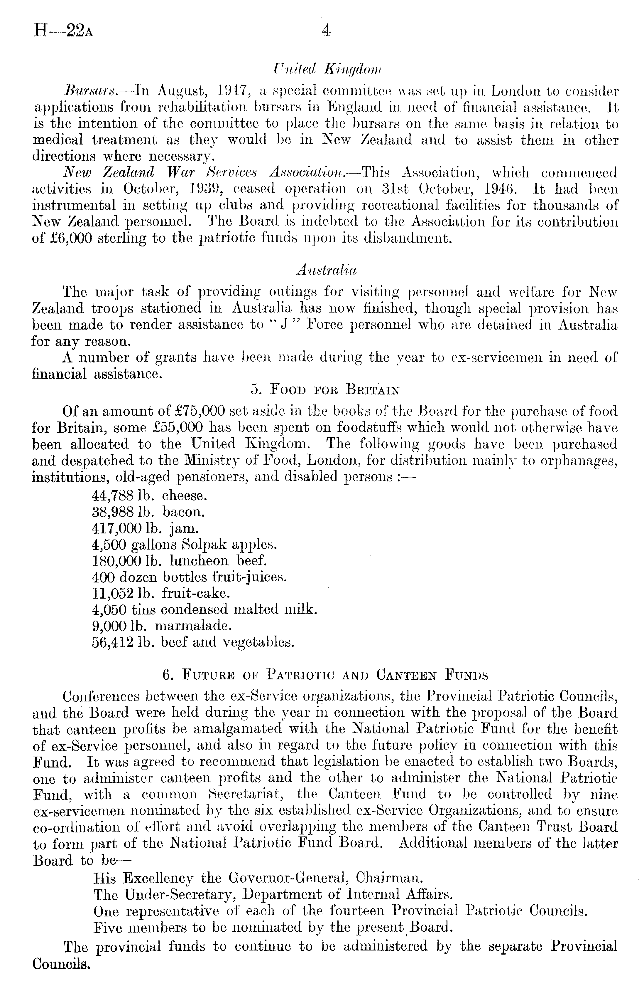 United Kingdom Bursars. —In August, 1947, a special committee was set up in London to consider applications from rehabilitation bursars in England in need of financial assistance. It is the intention of the committee to place the bursars on the same basis in relation to medical treatment as they would be in New Zealand and to assist them in other directions where necessary. New Zealand War Services Association. —This Association, which commenced activities in October, 1939, ceased operation on 31st October, 1946. It had been instrumental in setting up clubs and providing recreational facilities for thousands of New Zealand personnel. The Board is indebted to the Association for its contribution of £6,000 sterling to the patriotic funds upon its disbaiidmeut. Australia The major task of providing outings for visiting personnel and welfare for New Zealand troops stationed in Australia has now finished, though special provision has been made to render assistance to "J" Force personnel who are detained in Australia for any reason. A number of grants have been made during the year to ex-servicemen in need of financial assistance. 5. Food for Britain Of an amount of £75,000 set aside in the books of the Board for the purchase of food for Britain, some £55,000 has been spent on foodstuffs which would not otherwise have been allocated to the United Kingdom. The following goods have been purchased and despatched to the Ministry of Food, London, for distribution mainly to orphanages, institutions, old-aged pensioners, and disabled persons : 44,7881b. cheese. 38,9881b. bacon. 417,0001b. jam. 4,500 gallons Solpak apples. 180,000 lb. luncheon beef. 400 dozen bottles fruit-juices. 11,0521b. fruit-cake. 4,050 tins condensed malted milk. 9,000 lb. marmalade. 56,412 lb. beef and vegetables. 6. Future oe Patriotic and Canteen Funds Conferences between the ex-Service organizations, the Provincial Patriotic Councils, and the Board were held during the year in connection with the proposal of the Board that canteen profits be amalgamated with the National Patriotic Fund for the benefit of ex-Service personnel, and also in regard to the future policy in connection with this Fund. It was agreed to recommend that legislation be enacted to establish two Boards, one to administer canteen profits and the other to administer the National Patriotic Fund, with a common Secretariat, the Canteen Fund to be controlled by nine ex-servicemen nominated by the six established ex-Service Organizations, and to ensure co-ordination of effort and avoid overlapping the members of the Canteen Trust Board to form part of the National Patriotic Fund Board. Additional members of the latter Board to be— His Excellency the Governor-General, Chairman. The Under-Secretary, Department of Internal Affairs. One representative of each of the fourteen Provincial Patriotic Councils. Five members to be nominated by the present Board. The provincial funds to continue to be administered by the separate Provincial Councils.