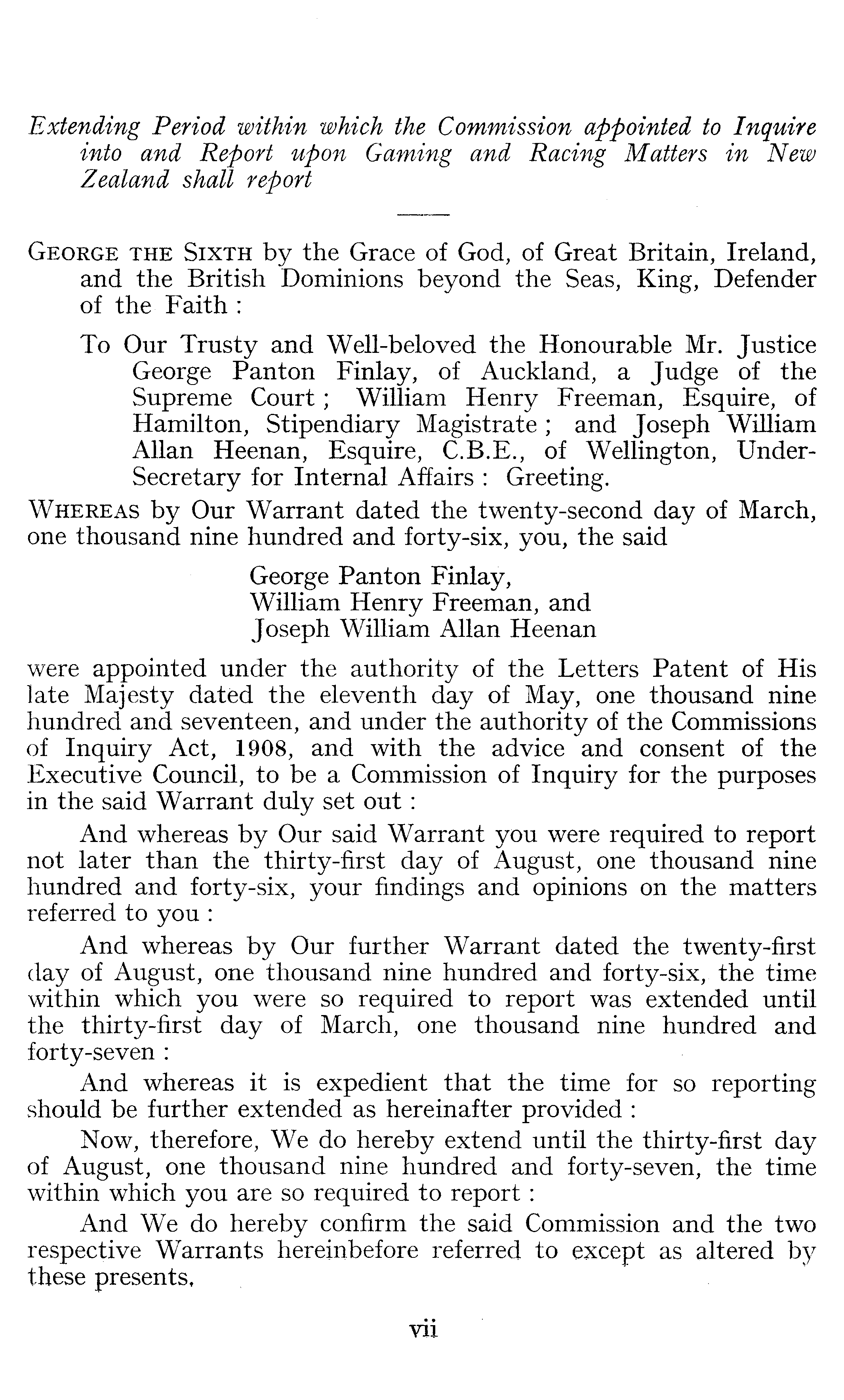 Extending Period within which the Commission appointed to Inquire into and Report upon Gaming and Racing Matters in New Zealand shall report George the Sixth by the Grace of God, of Great Britain, Ireland, and the British Dominions beyond the Seas, King, Defender of the Faith : To Our Trusty and Well-beloved the Honourable Mr. Justice George Panton Finlay, of Auckland, a Judge of the Supreme Court; William Henry Freeman, Esquire, of Hamilton, Stipendiary Magistrate; and Joseph William Allan Heenan, Esquire, C.8.E., of Wellington, UnderSecretary for Internal Affairs : Greeting. Whereas by Our Warrant dated the twenty-second day of March, one thousand nine hundred and forty-six, you, the said George Panton Finlay, William Henry Freeman, and Joseph William Allan Heenan were appointed under the authority of the Letters Patent of His late Majesty dated the eleventh day of May, one thousand nine hundred and seventeen, and under the authority of the Commissions of Inquiry Act, 1908, and with the advice and consent of the Executive Council, to be a Commission of Inquiry for the purposes in the said Warrant duly set out: And whereas by Our said Warrant you were required to report not later than the thirty-first day of August, one thousand nine hundred and forty-six, your findings and opinions on the matters referred to you : And whereas by Our further Warrant dated the twenty-first day of August, one thousand nine hundred and forty-six, the time within which you were so required to report was extended until the thirty-first day of March, one thousand nine hundred and forty-seven : And whereas it is expedient that the time for so reporting should be further extended as hereinafter provided : Now, therefore, We do hereby extend until the thirty-first day of August, one thousand nine hundred and forty-seven, the time within which you are so required to report: And We do hereby confirm the said Commission and the two respective Warrants hereinbefore referred to except as altered by these presents.