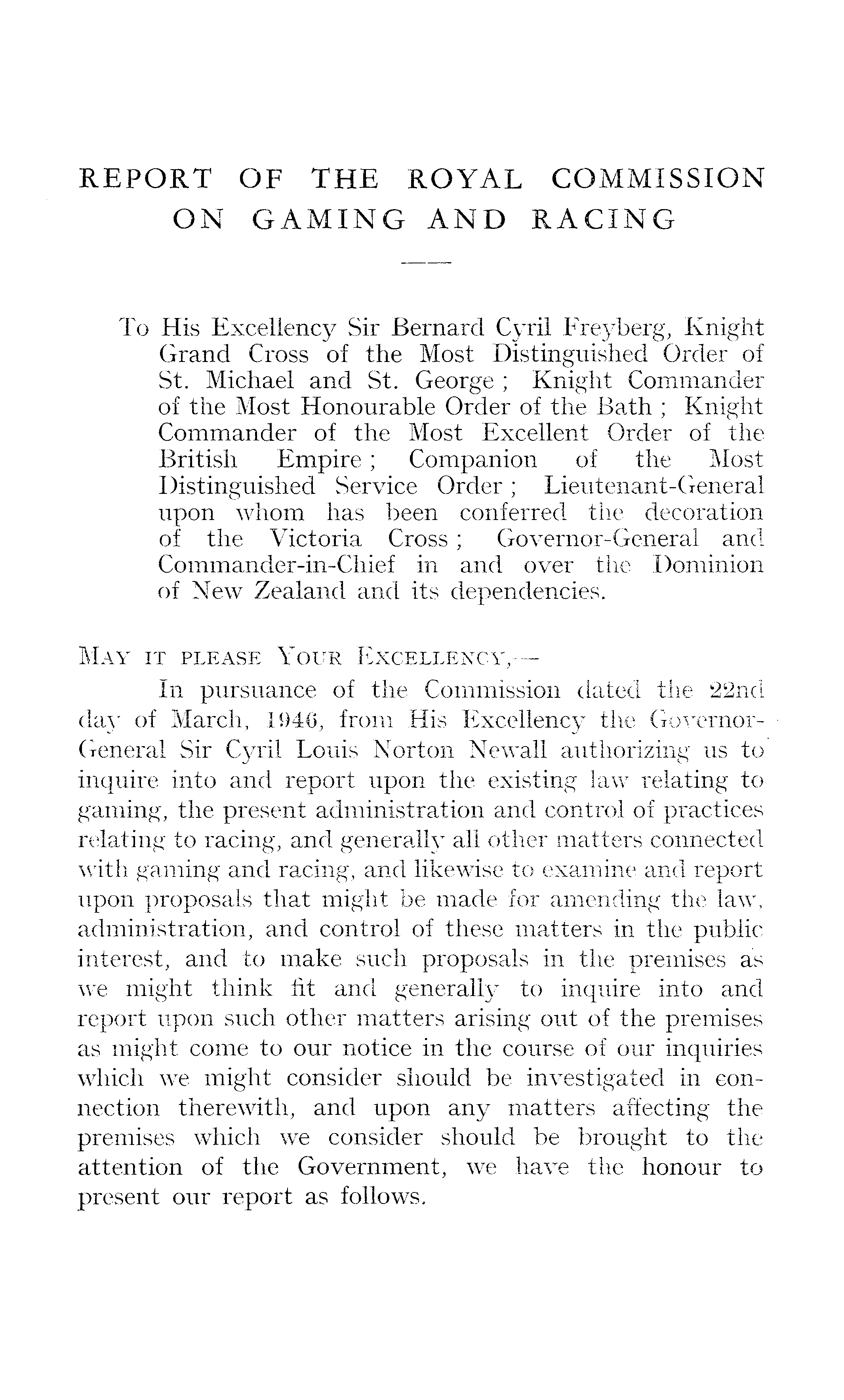 REPORT OF THE ROYAL COMMISSION ON GAMING AND RACING To His Excellency Sir Bernard Cyril Freyberg, Knight Grand Cross of the Most Distinguished Order of St. Michael and St. George ; Knight Commander of the Most Honourable Order of the Bath ; Knight Commander of the Most Excellent Order of the British Empire; Companion of the Most Distinguished Service Order; Lieutenant-General upon whom has been conferred the decoration of the Victoria Cross; Governor-General and Commander-in-Chief in and over the Dominion of New Zealand and its dependencies. May it please Your Excellency,— In pursuance of the Commission dated the 22nd day of March, 1946, from His Excellency the GovernorGeneral Sir Cyril Louis Norton Newall authorizing us to inquire into and report upon the existing law relating to gaming, the present administration and control of practices relating to racing, and generally all other matters connected with gaming and racing, and likewise to examine and report upon proposals that might be made for amending the law, administration, and control of these matters in the public interest, and to make such proposals in the premises as we might think fit and generally to inquire into and report upon such other matters arising out of the premises as might come to our notice in the course of our inquiries which we might consider should be investigated in connection therewith, and upon any matters affecting the premises which we consider should be brought to the attention of the Government, we have the honour to present our report as follows.